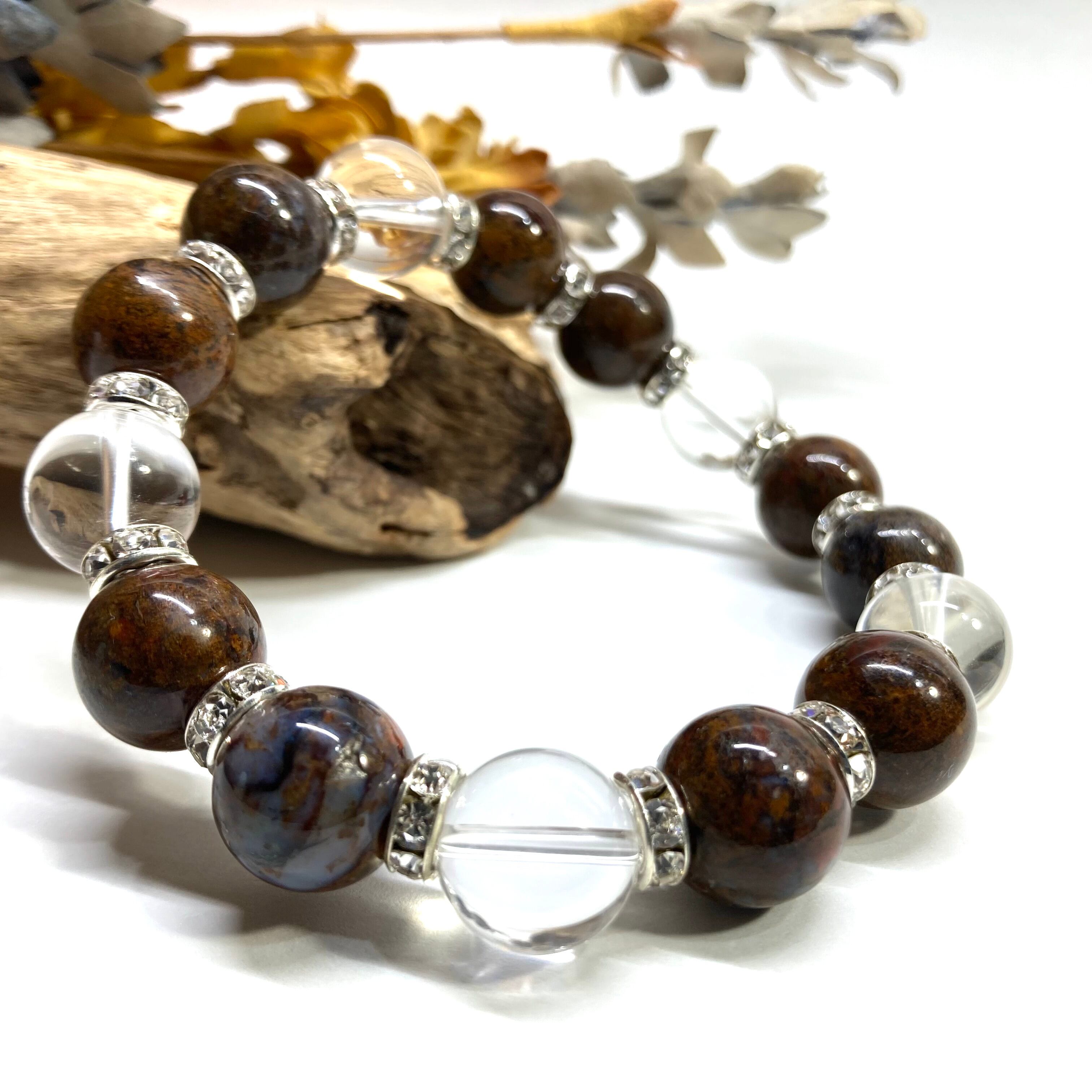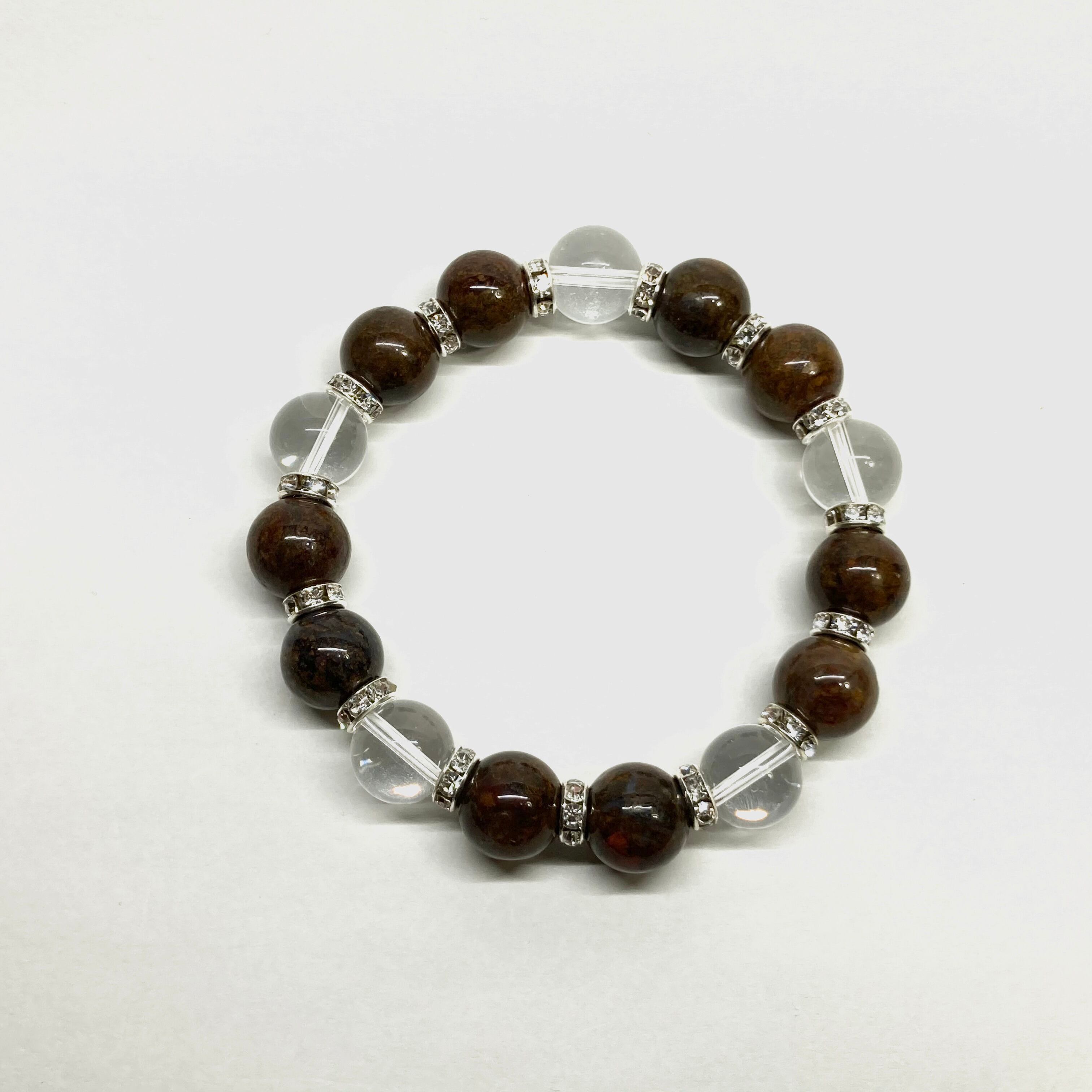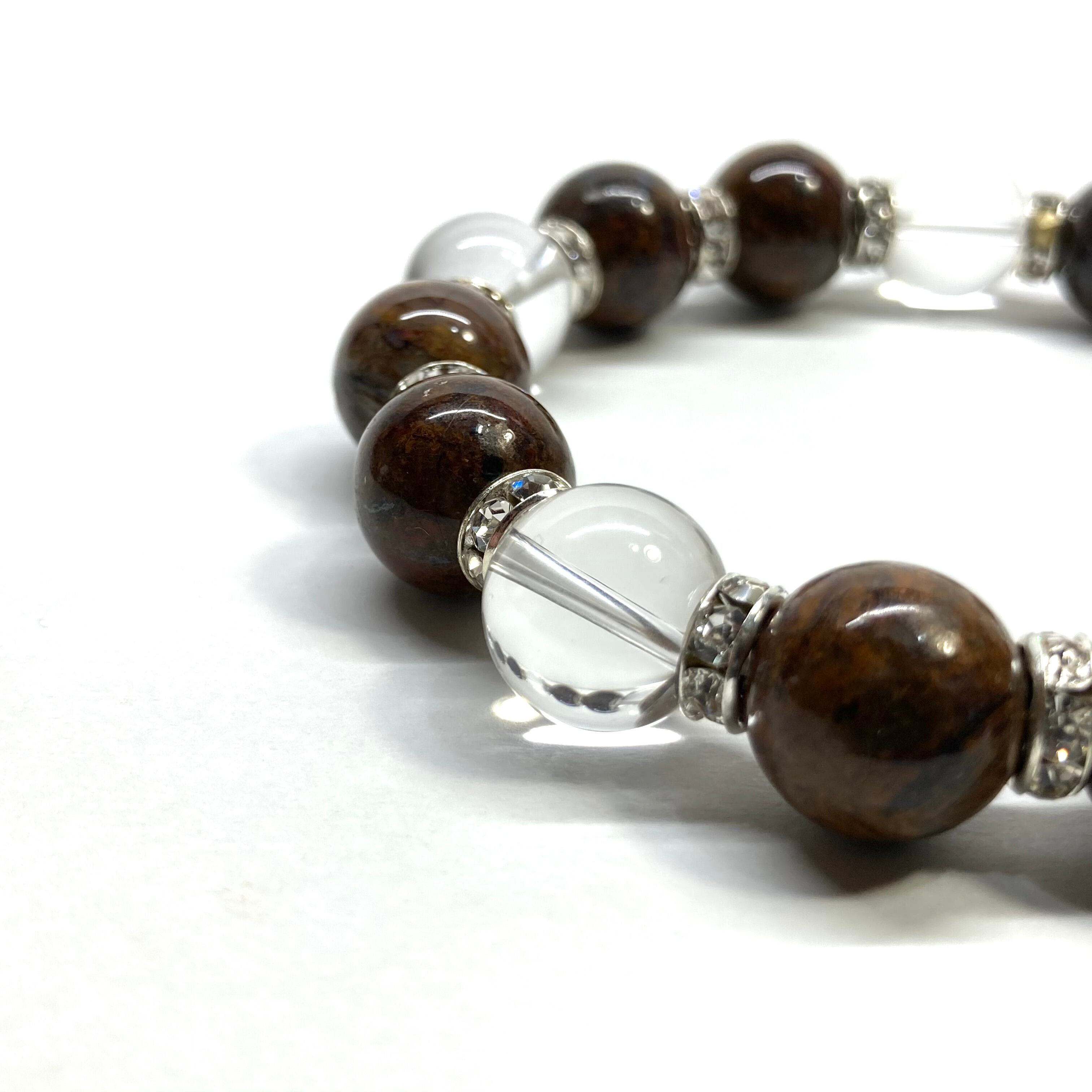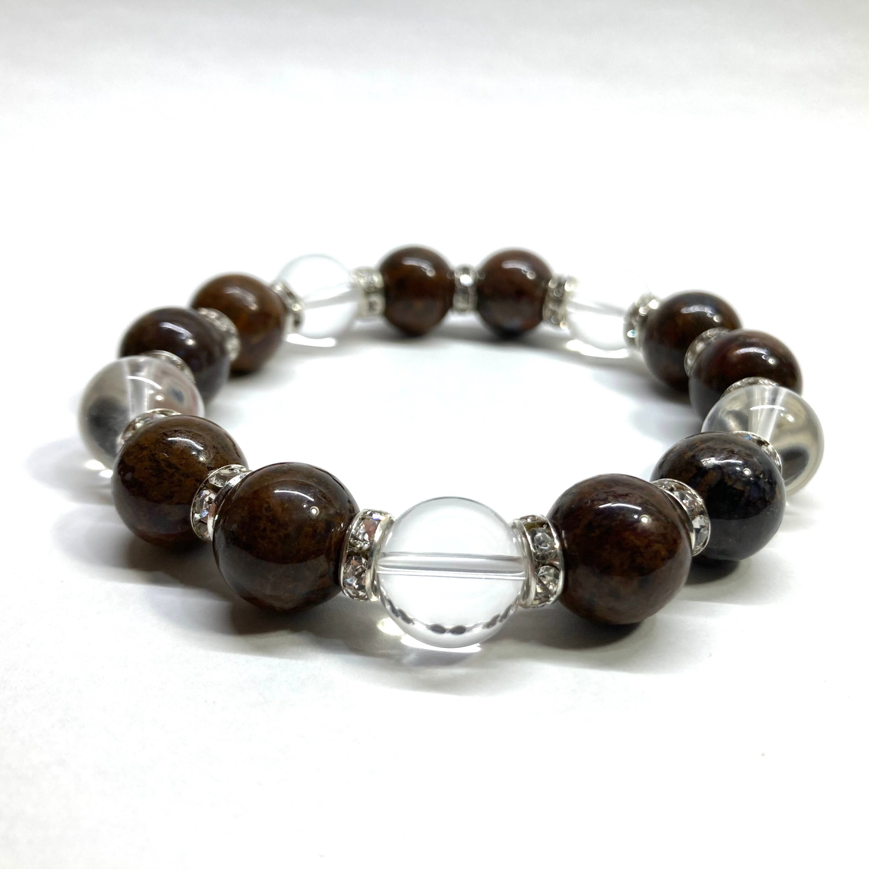 こちらは、10mm玉のピーターサイトと水晶を組み合わせたパワーストーンブレスレットです。間にはロンデルを挟み高級感あるデザインに仕上げております。石大きさは12mm玉を使用して内径約18cmです。数に限りがございますので気になる方はお早めにどうぞ。