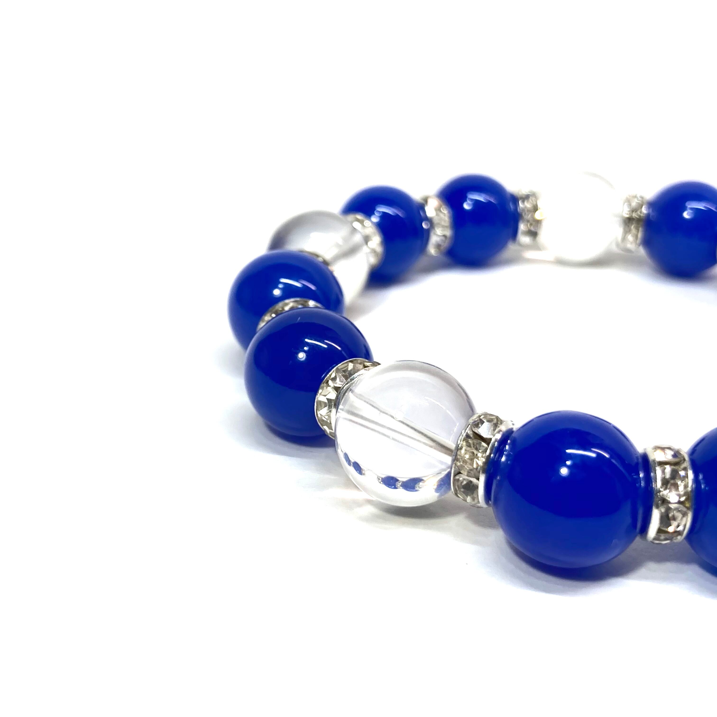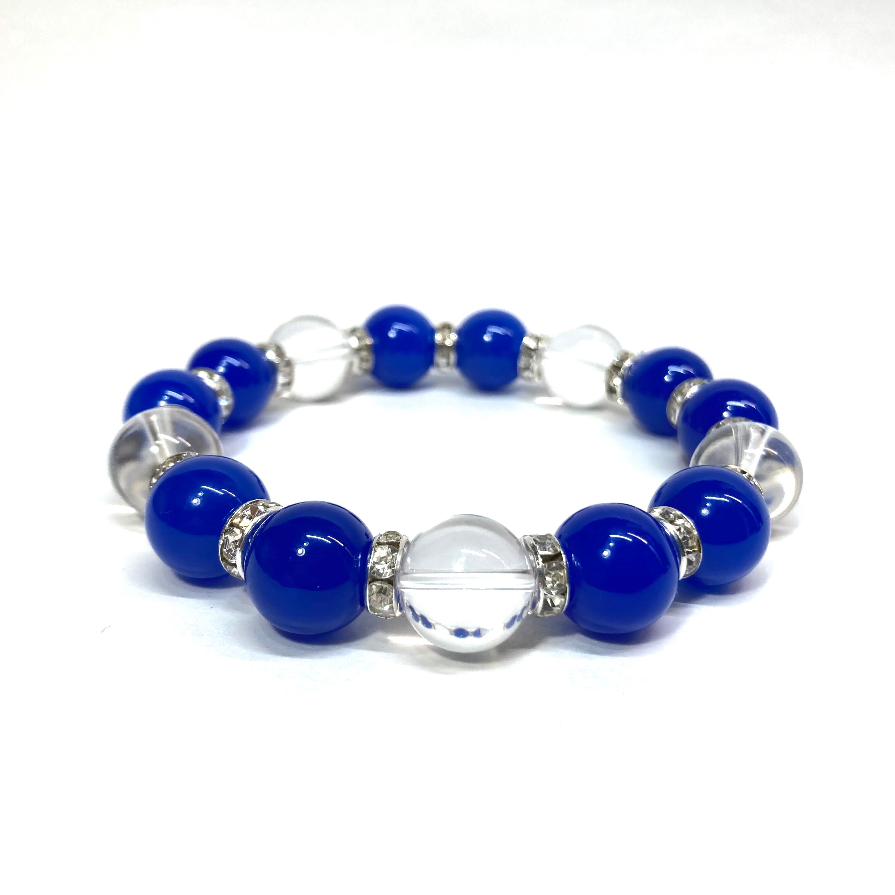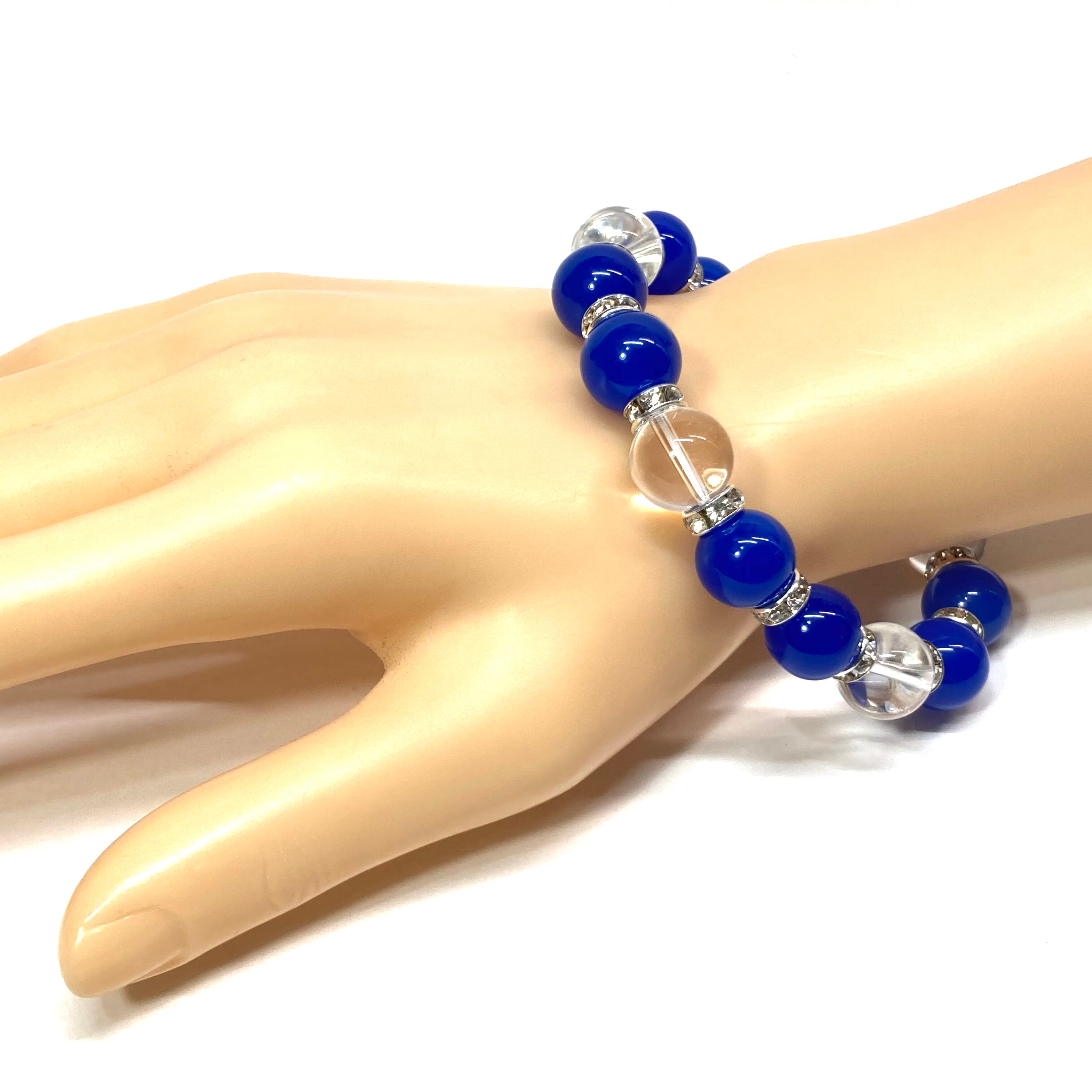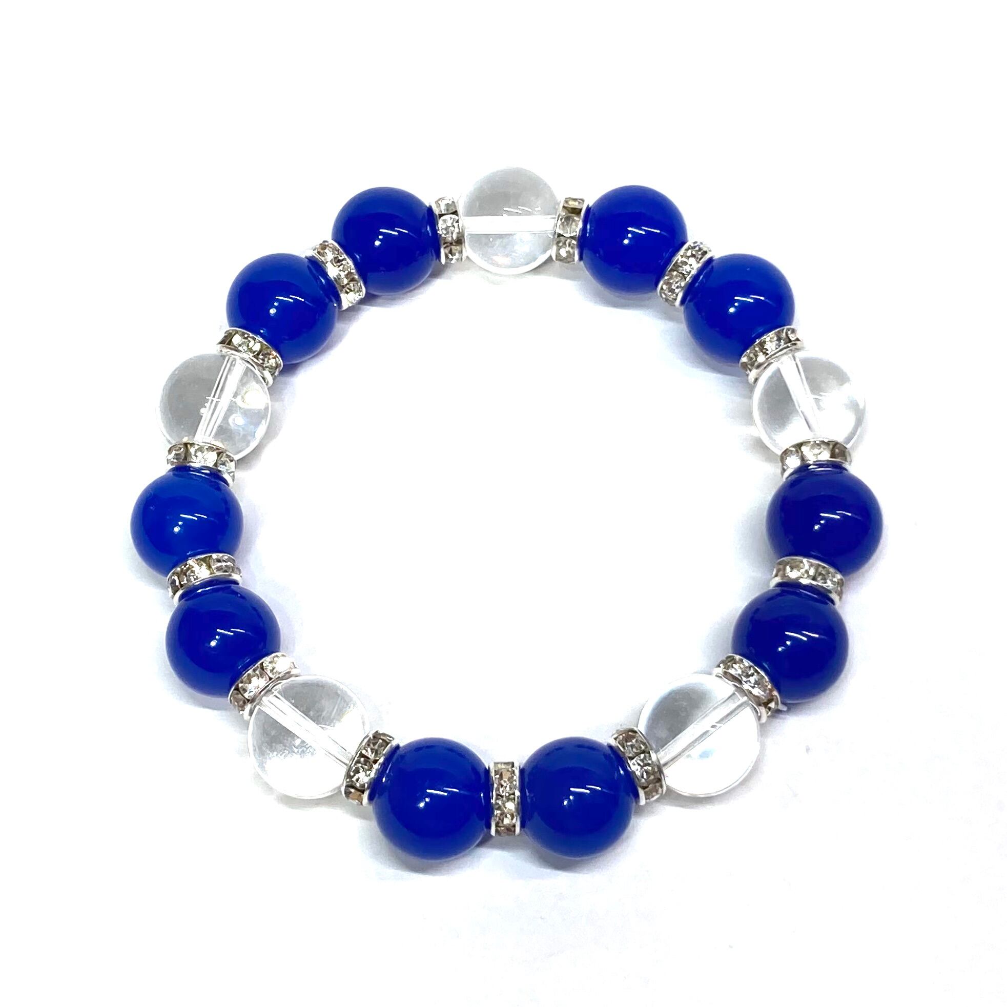こちらは、10mm玉の青瑪瑙と水晶を組み合わせたパワーストーンブレスレットです。間にはロンデルを挟み高級感あるデザインに仕上げております。石大きさは12mm玉を使用して内径約18cmです。数に限りがございますので気になる方はお早めにどうぞ。
