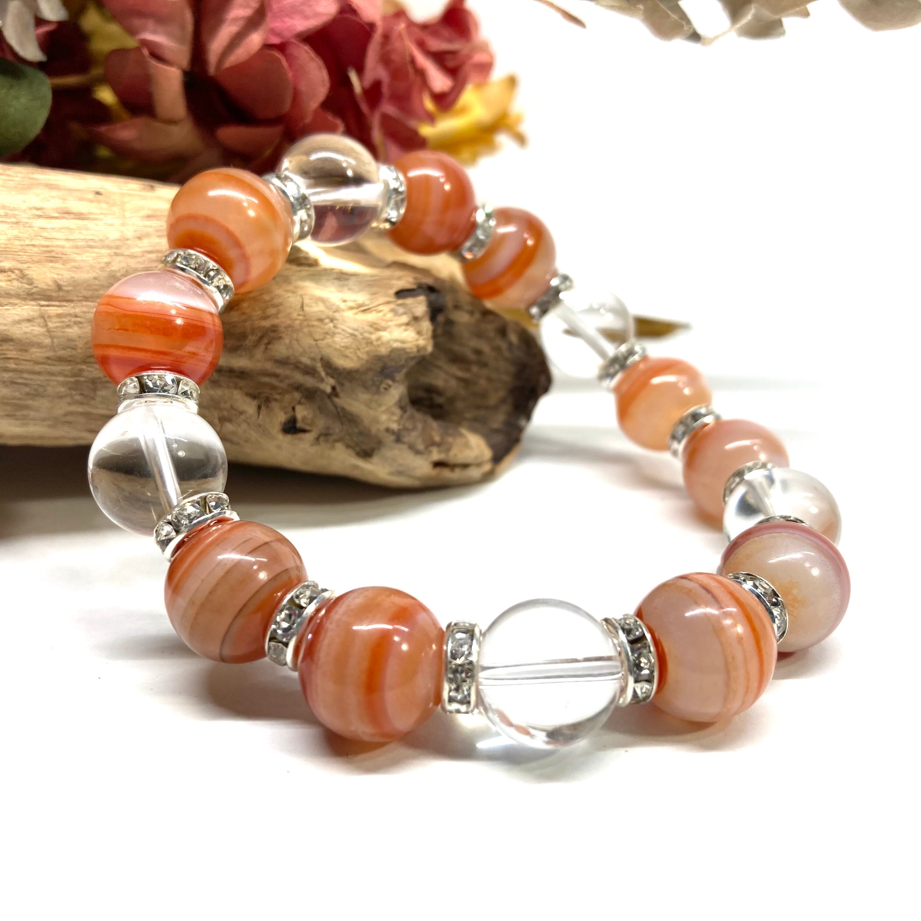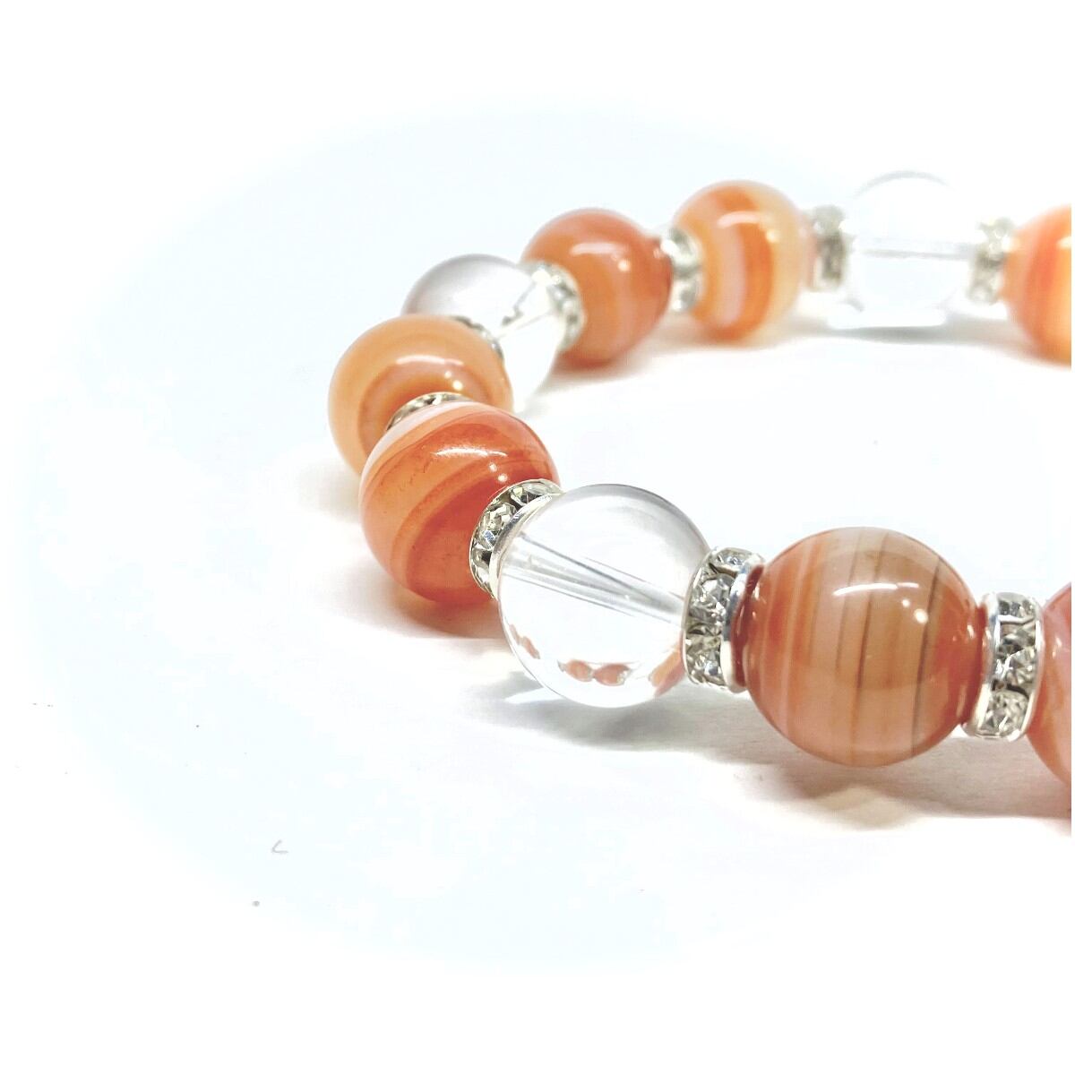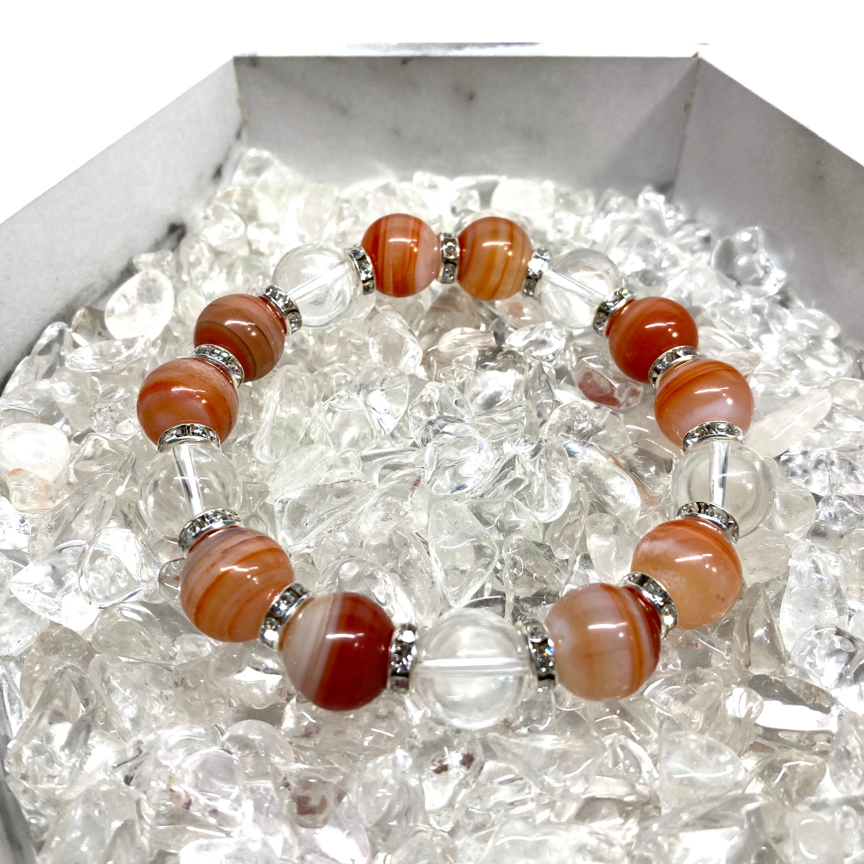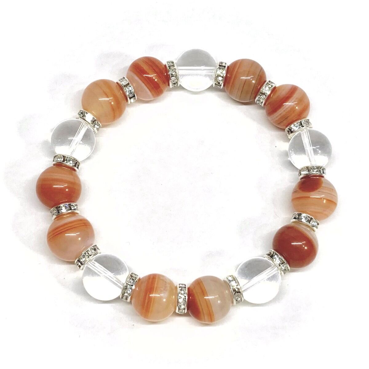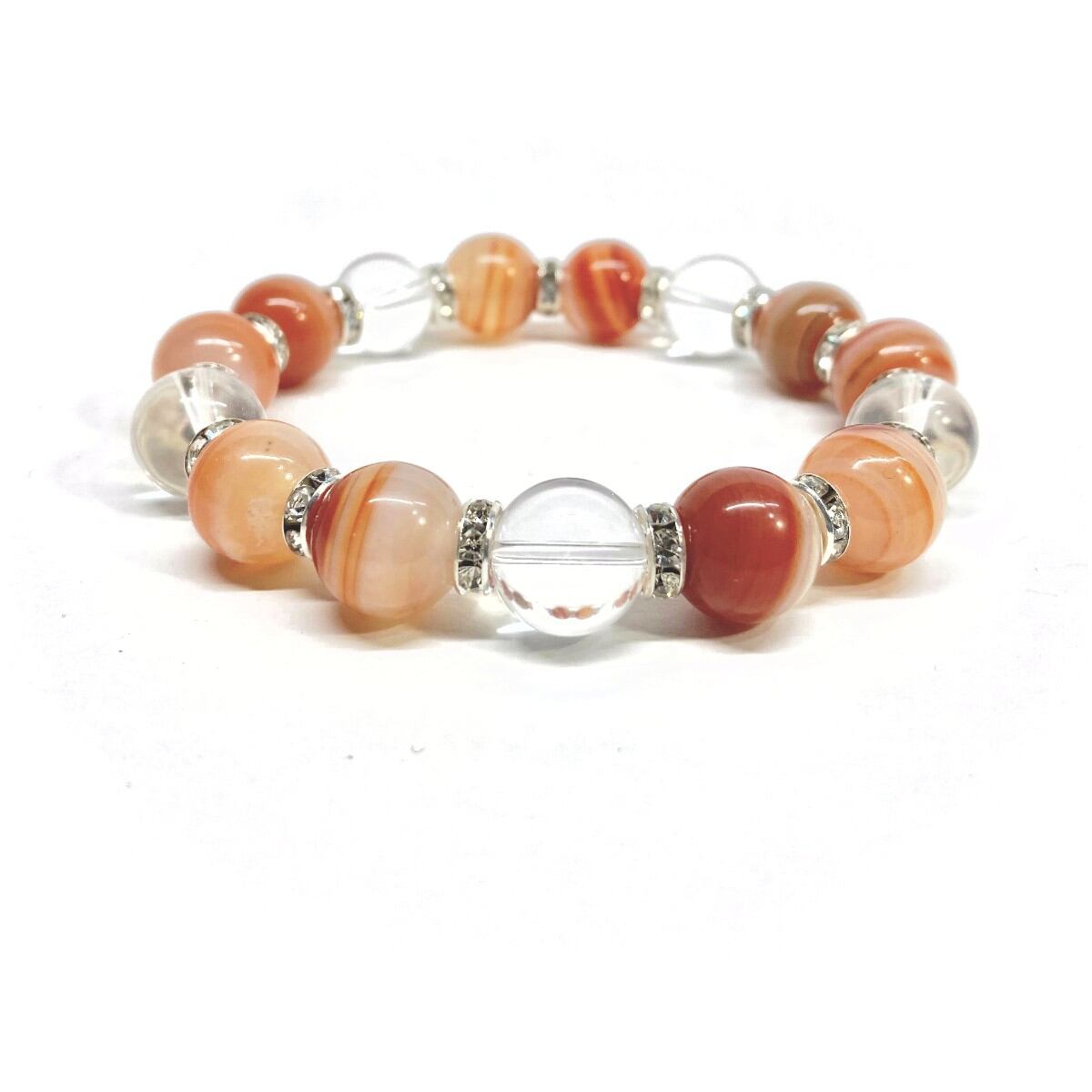 こちらは、12mm玉のカーネリアン・サードニクス(サードオニキス)と水晶を組み合わせたパワーストーンブレスレットです。間にはロンデルを挟み高級感あるデザインに仕上げております。石大きさは12mm玉を使用して内周約18cmです。気になる方は是非この機会にどうぞ。