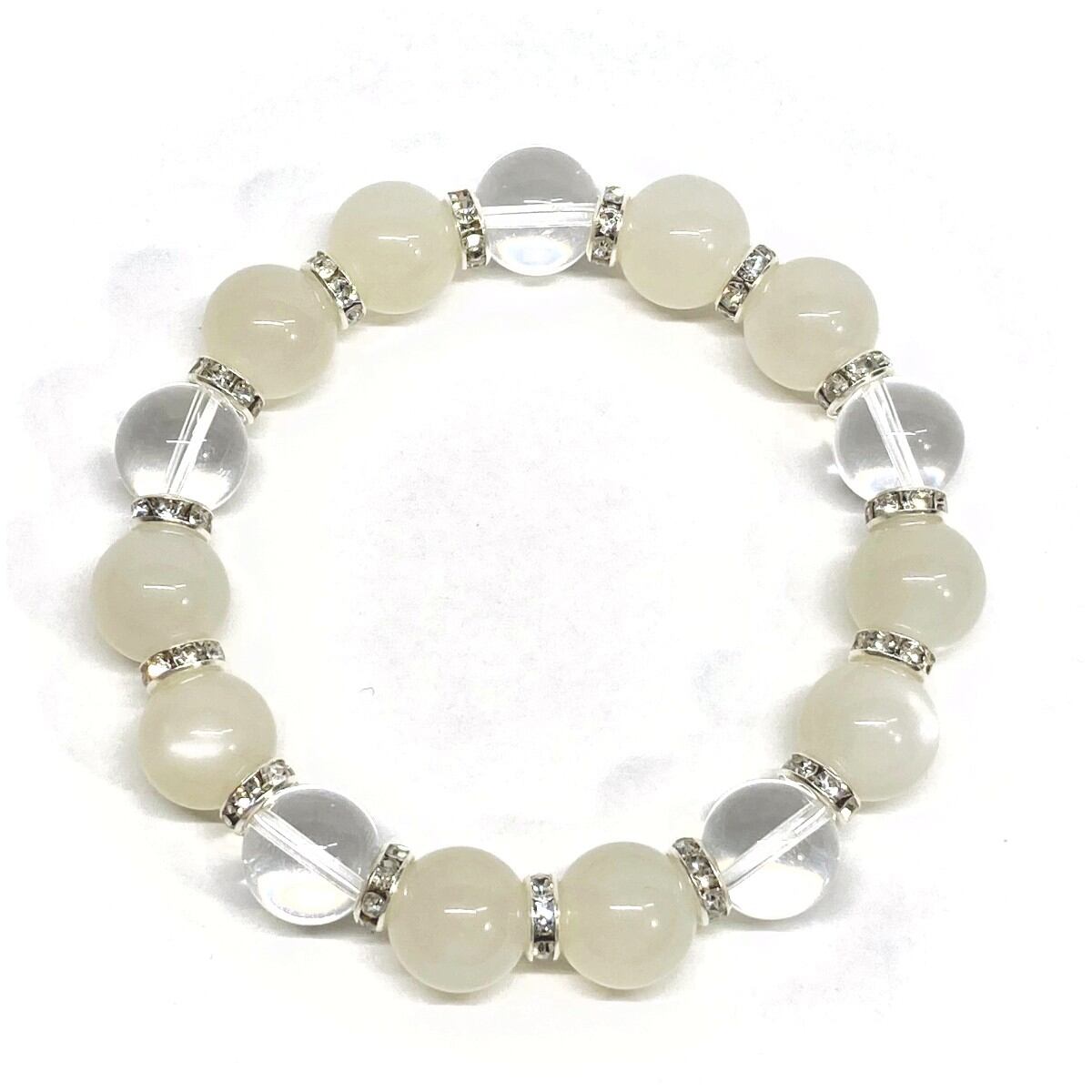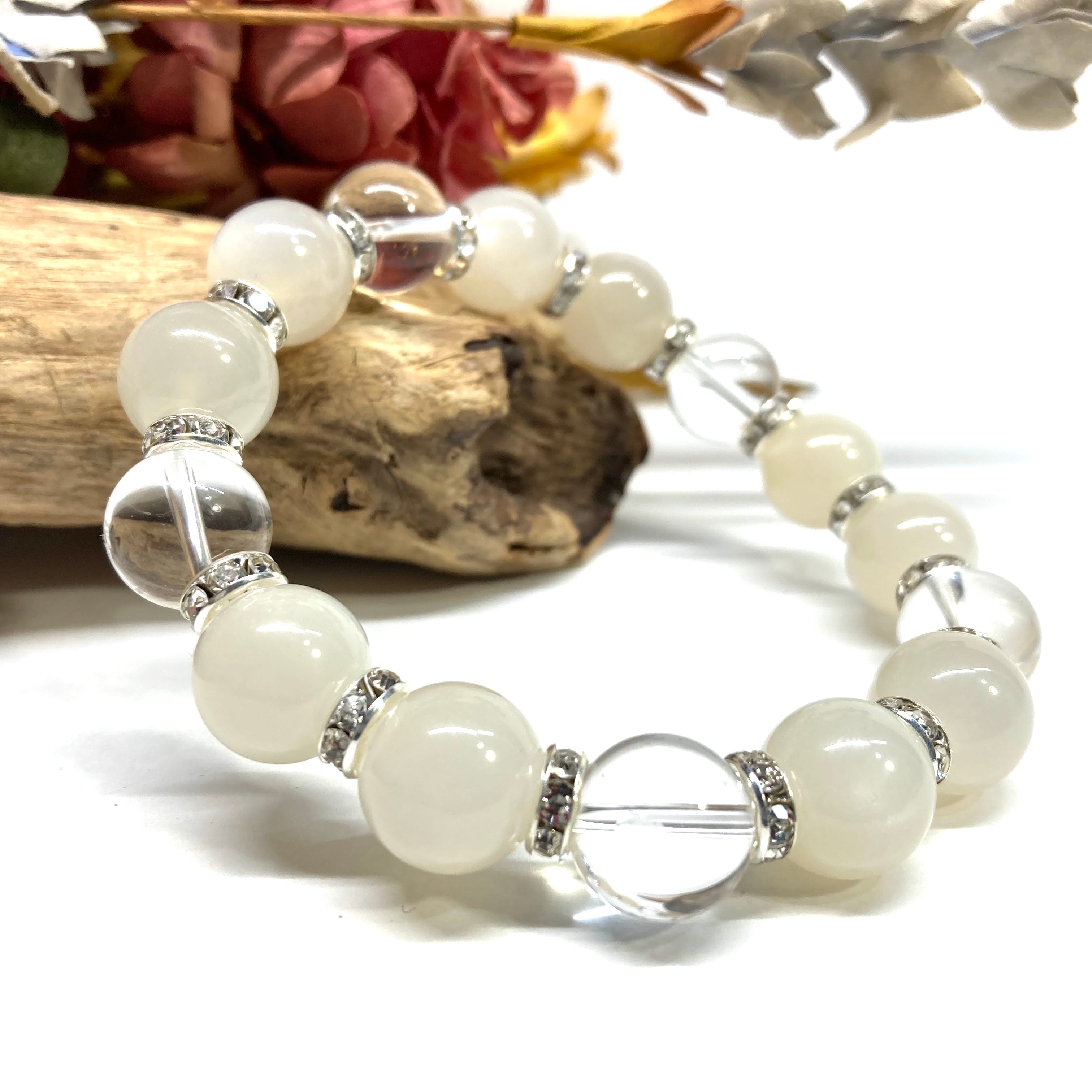 こちらは、12mm玉のムーンストーンと水晶を組み合わせたパワーストーンブレスレットです。間にはロンデルを挟み高級感あるデザインに仕上げております。石大きさは12mm玉を使用して内周約18cmです。気になる方は是非この機会にどうぞ。
