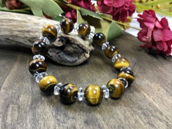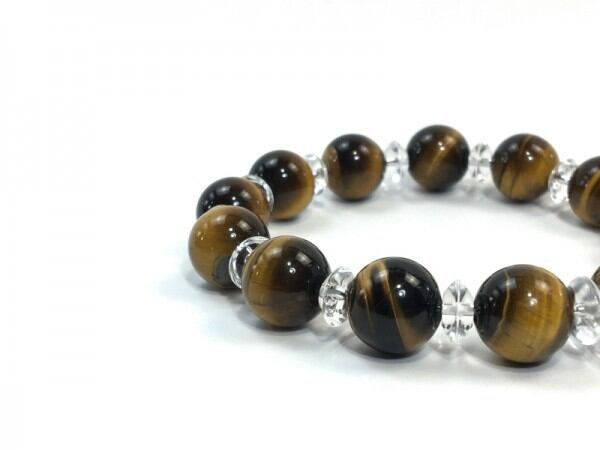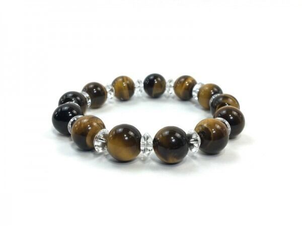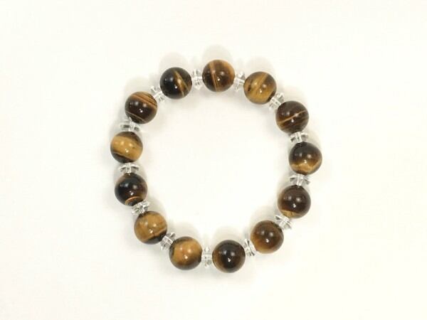 こちらは、タイガーアイを使用したブレスレットです。間には水晶ソロバンが挟まれてアクセントとなっております。石大きさは腕にも馴染みやすいように12mm玉で内周約17cm(伸可能)です。気になる方は是非この機会にどうぞ。