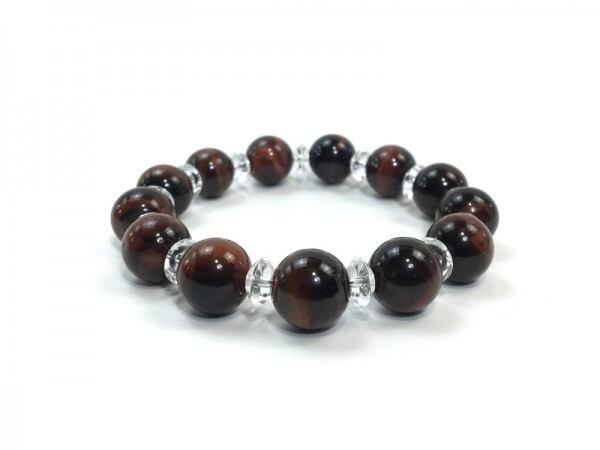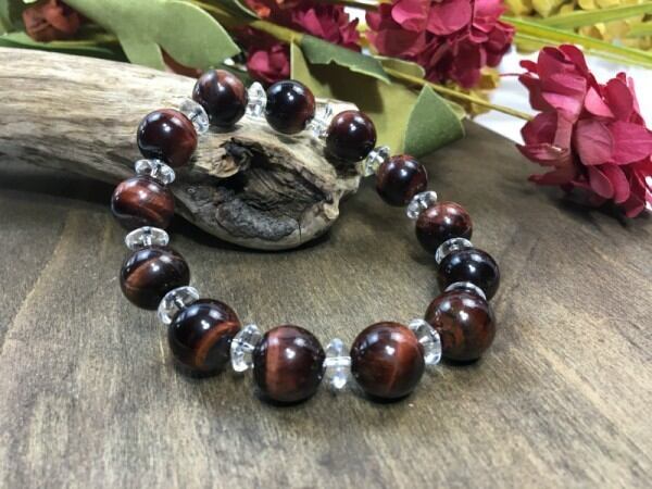 こちらは、レッドタイガーアイを使用したブレスレットです。間には水晶ソロバンが挟まれてアクセントとなっております。石大きさは腕にも馴染みやすいように12mm玉で内周約17cm(伸可能)です。気になる方は是非この機会にどうぞ。