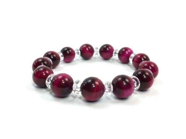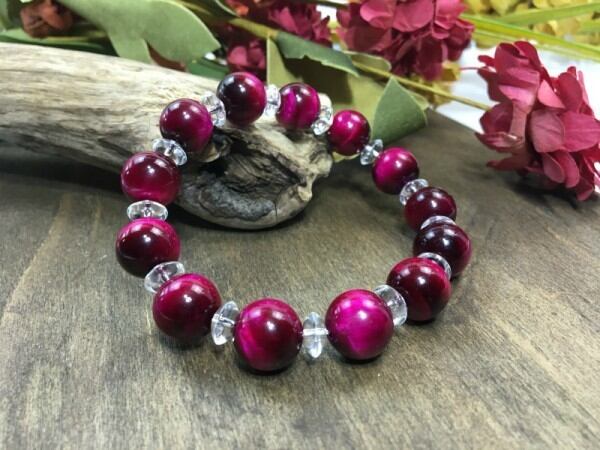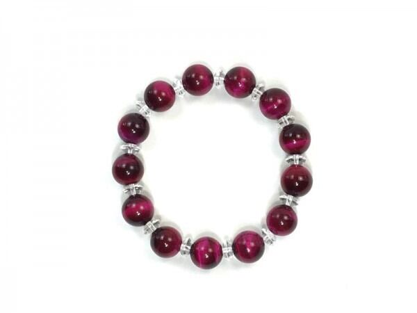 こちらは、ピンクタイガーアイを使用したブレスレットです。間には水晶ソロバンが挟まれてアクセントとなっております。石大きさは腕にも馴染みやすいように12mm玉で内周約17cm(伸可能)です。cmです。気になる方は是非この機会にどうぞ。