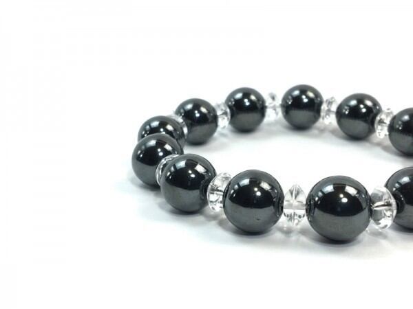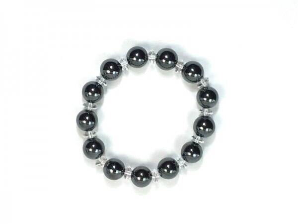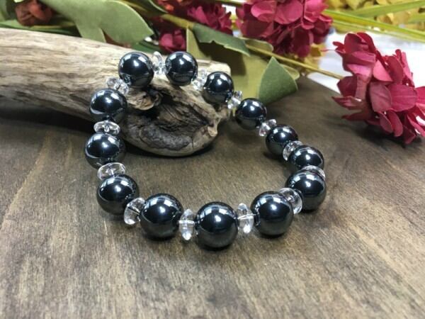 こちらは、ヘマタイトを使用したブレスレットです。間には水晶ソロバンが挟まれてアクセントとなっております。石大きさは腕にも馴染みやすいように12mm玉で内周約17cm(伸可能)です。気になる方は是非この機会にどうぞ。