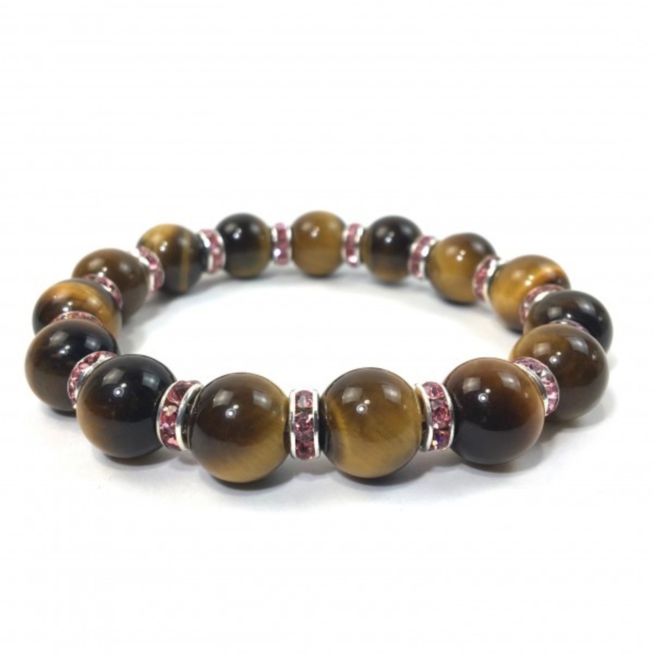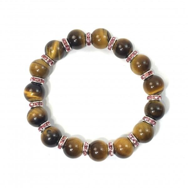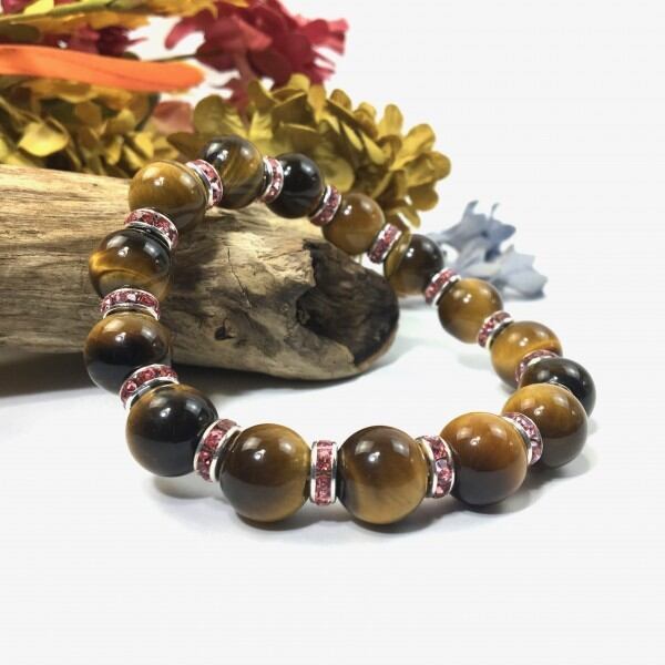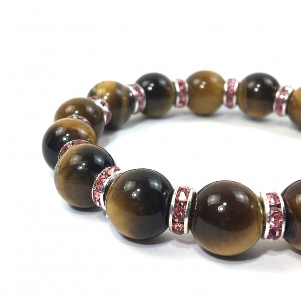 こちらは、12mm玉のタイガーアイを使用した天然石ブレスレットです。石との間にはロンデルを挟み高級感を演出しています。シンプルなデザインですのでどんなコーディネートとも合わせ易いブレスレットです。石大きさは12mm玉です。内周約18cmです。気になる方は是非この機会にどうぞ。