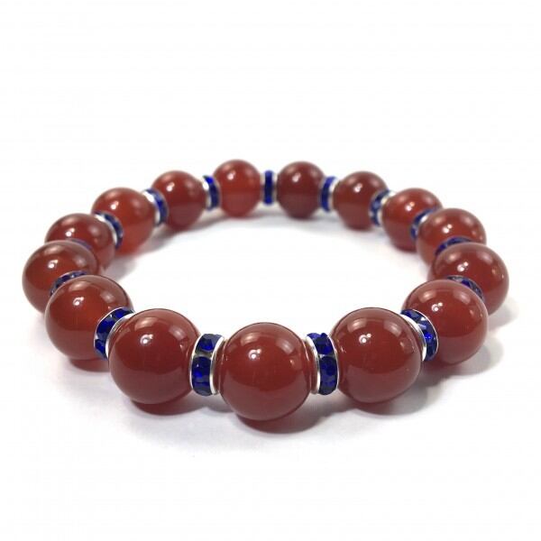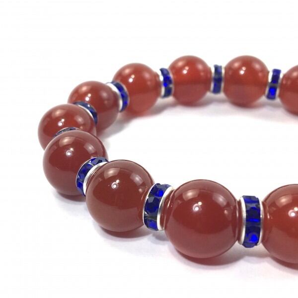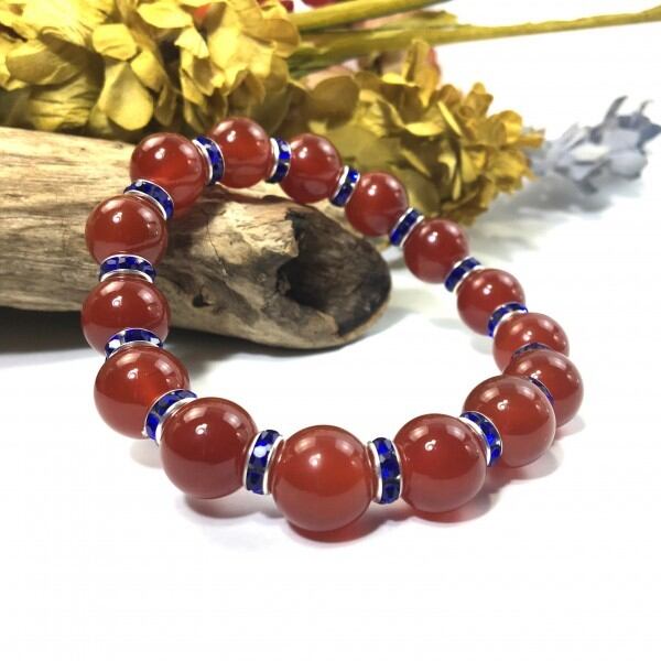 こちらは、12mm玉の赤瑪瑙を使用した天然石ブレスレットです。石との間にはロンデルを挟み高級感を演出しています。シンプルなデザインですのでどんなコーディネートとも合わせ易いブレスレットです。石大きさは12mm玉です。。内周約18cmです。気になる方は是非この機会にどうぞ。