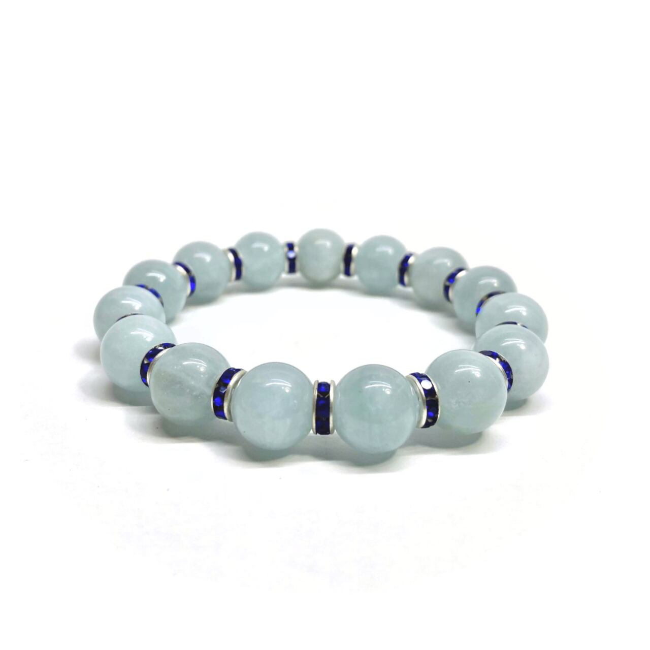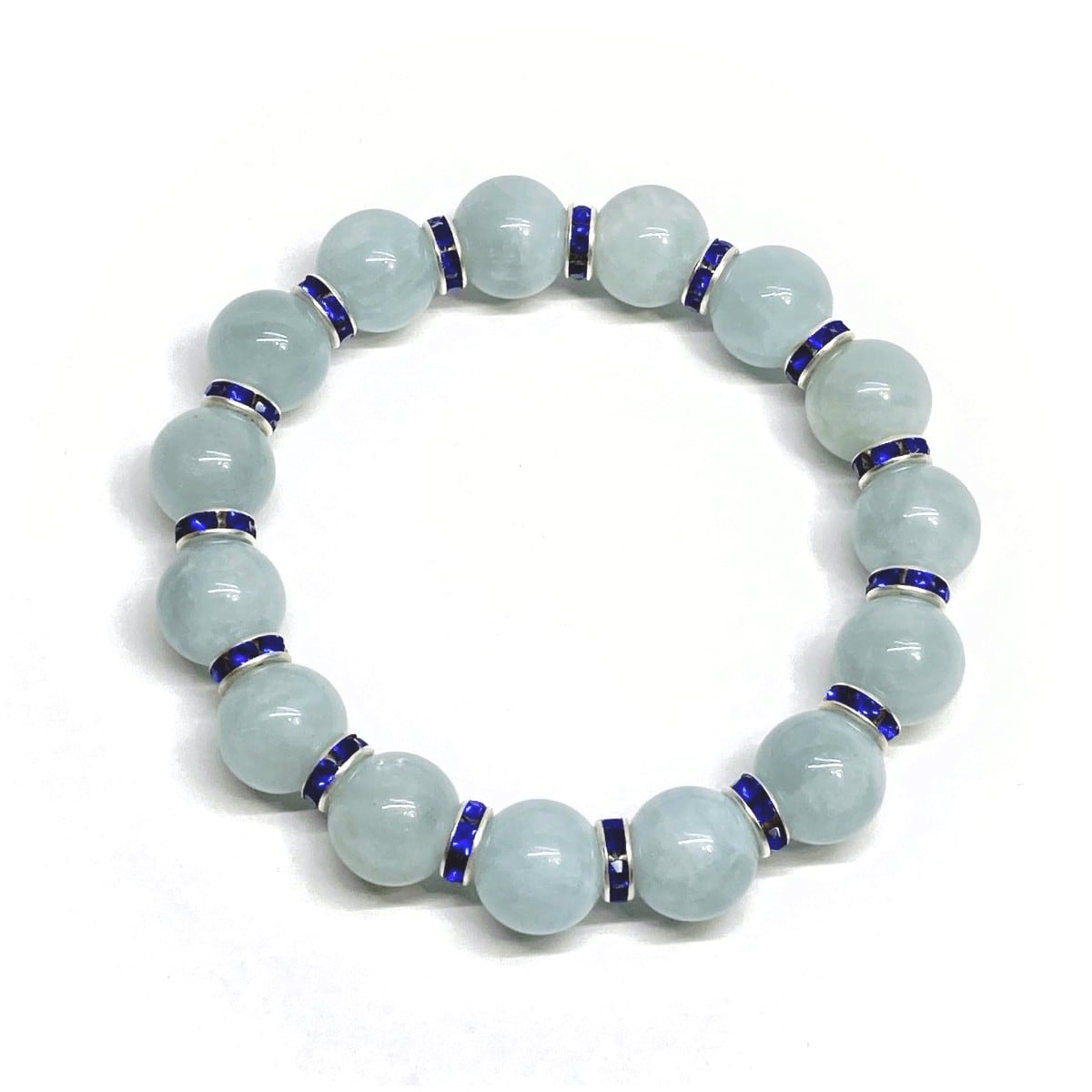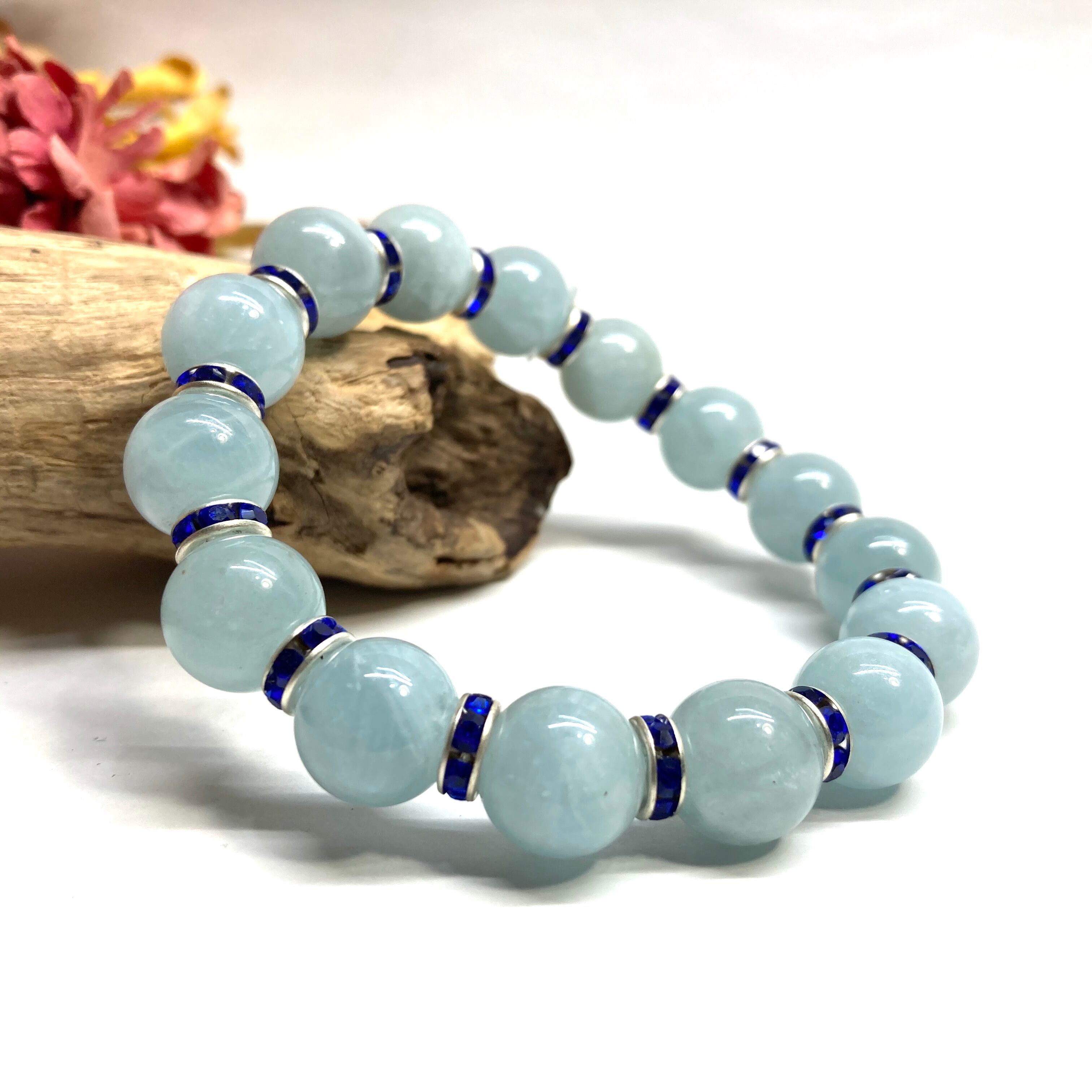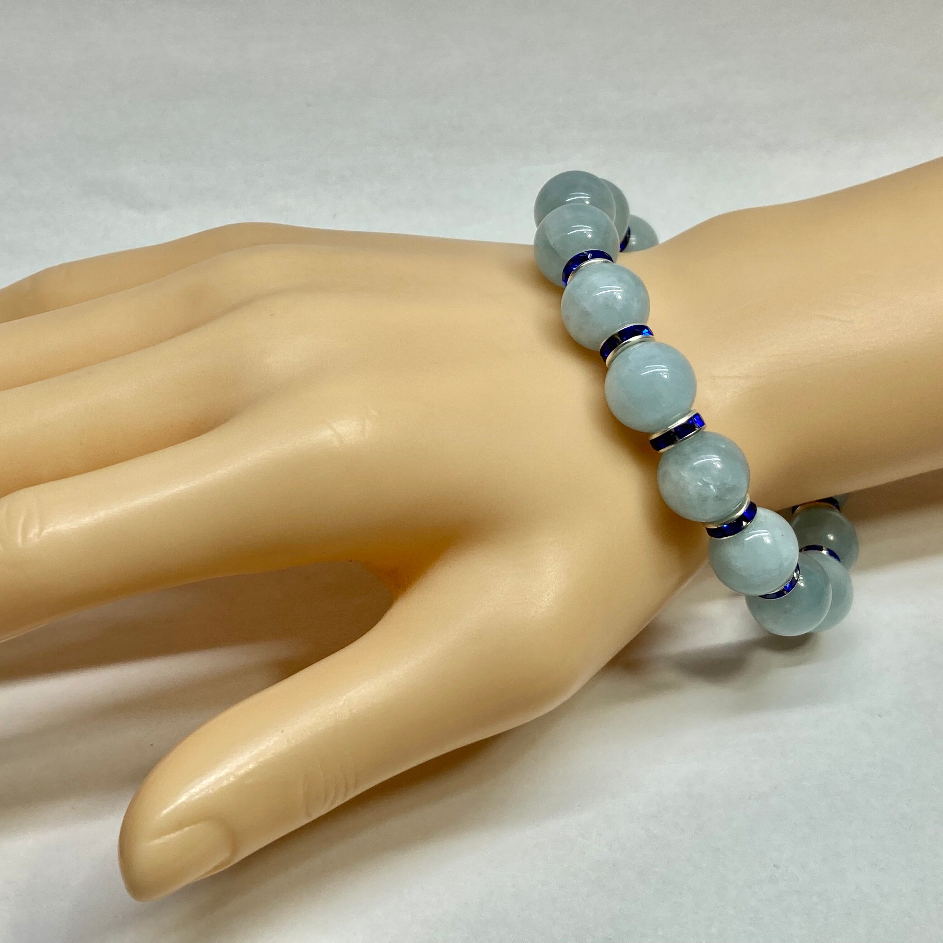 こちらは、12mm玉のアクアマリンを使用したパワーストーンブレスレットです。間にはロンデルを挟み高級感を演出しております。男女問わずどんなコーディネートとも合わせ易いブレスレットです。サイズは内周約18cmです。 数に限りがございますので気になる方はお早めにどうぞ