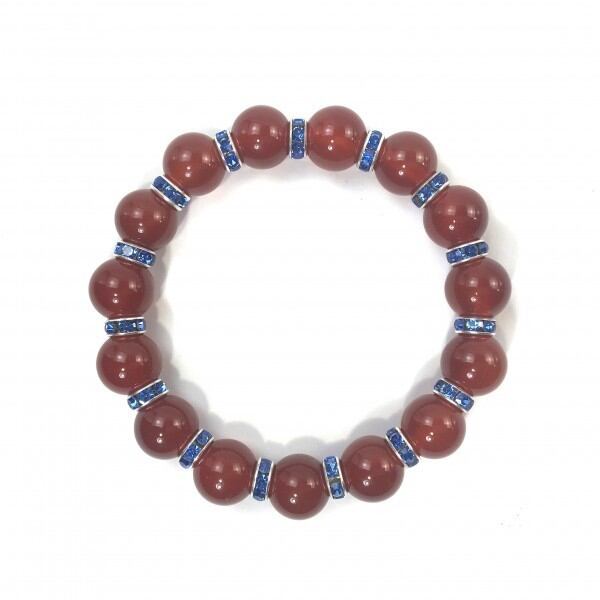 こちらは、12mm玉の赤瑪瑙を使用した天然石ブレスレットです。石との間にはロンデルを挟み高級感を演出しています。シンプルなデザインですのでどんなコーディネートとも合わせ易いブレスレットです。石大きさは12mm玉です。。内周約18cmです。気になる方は是非この機会にどうぞ。