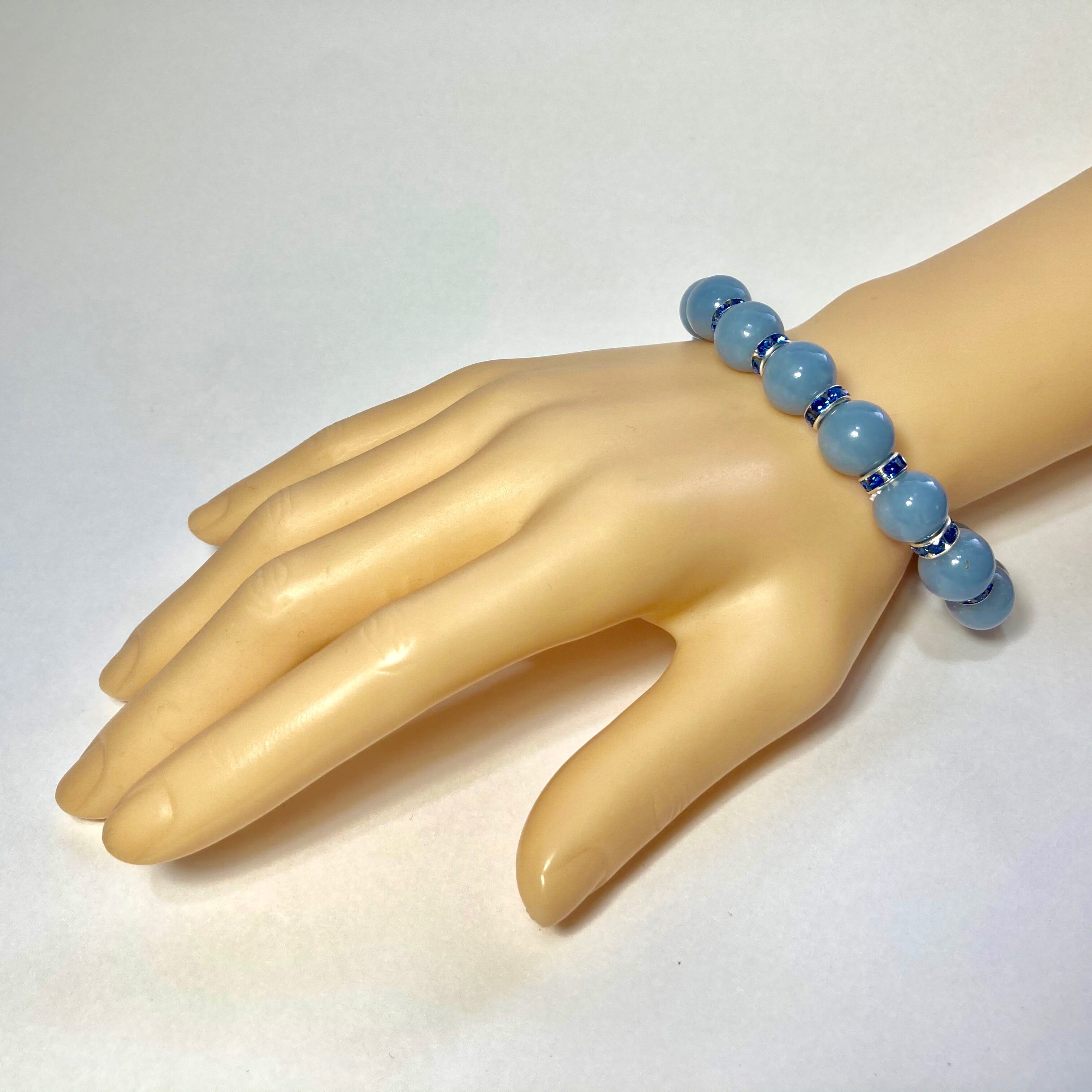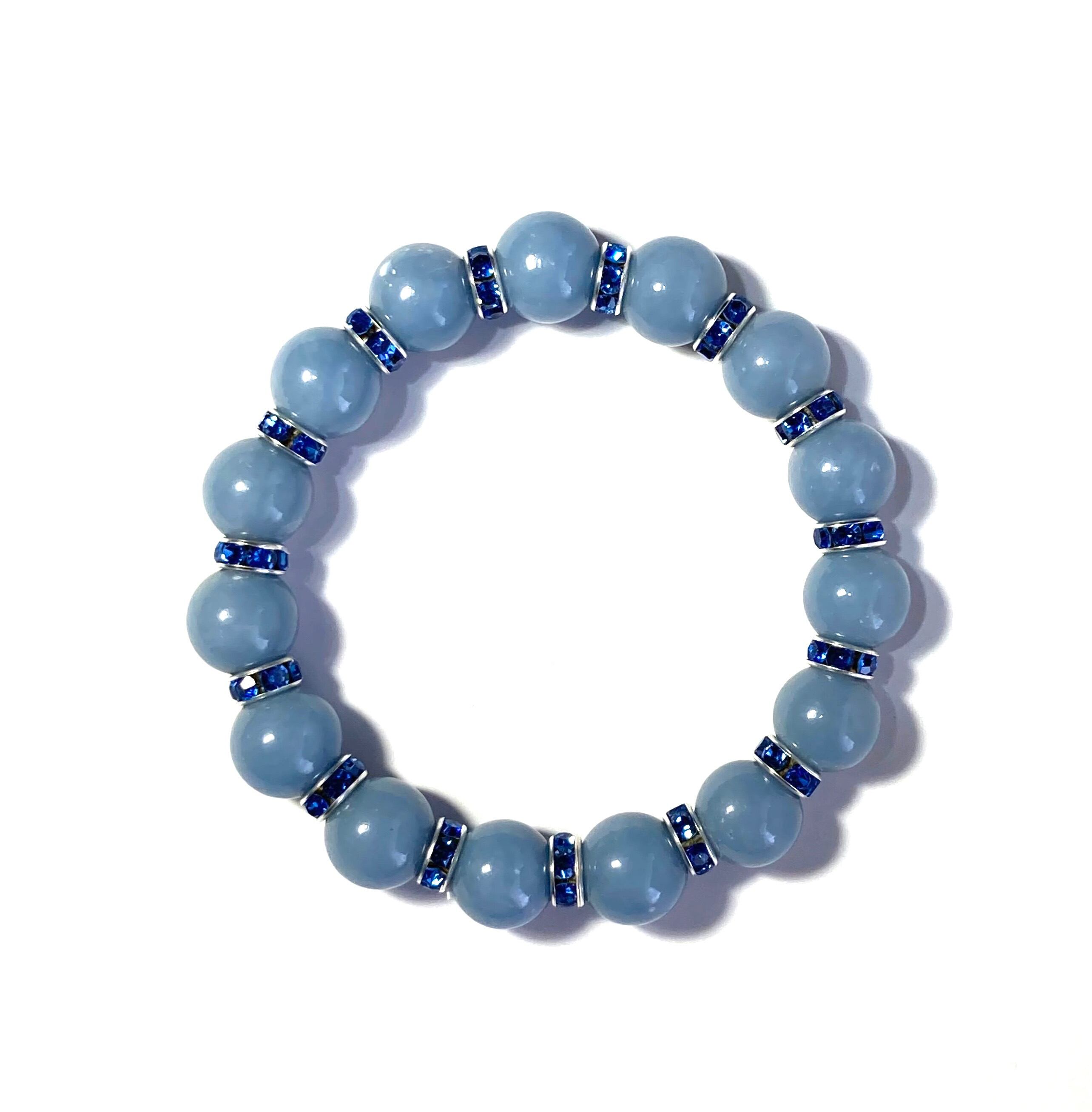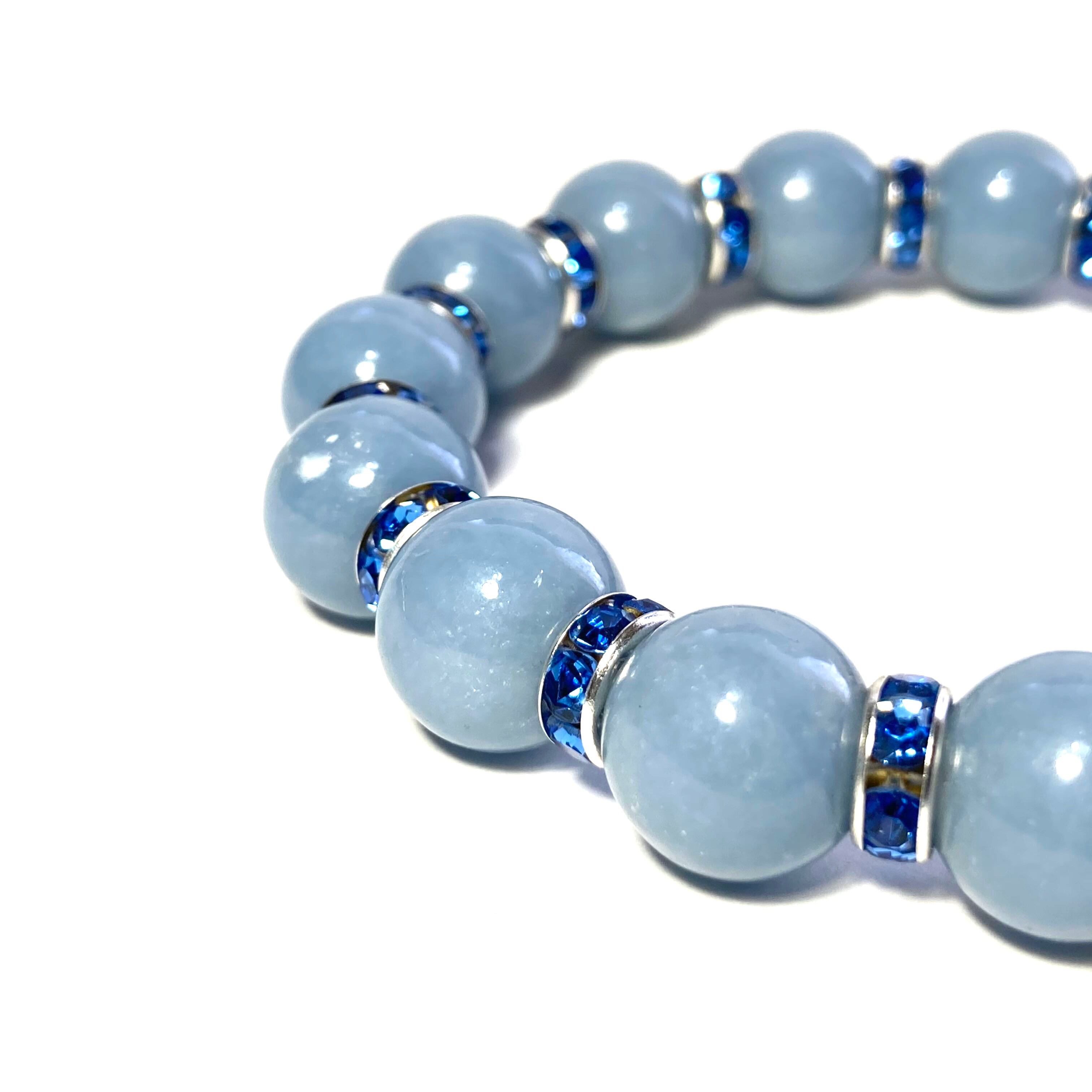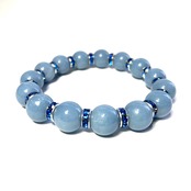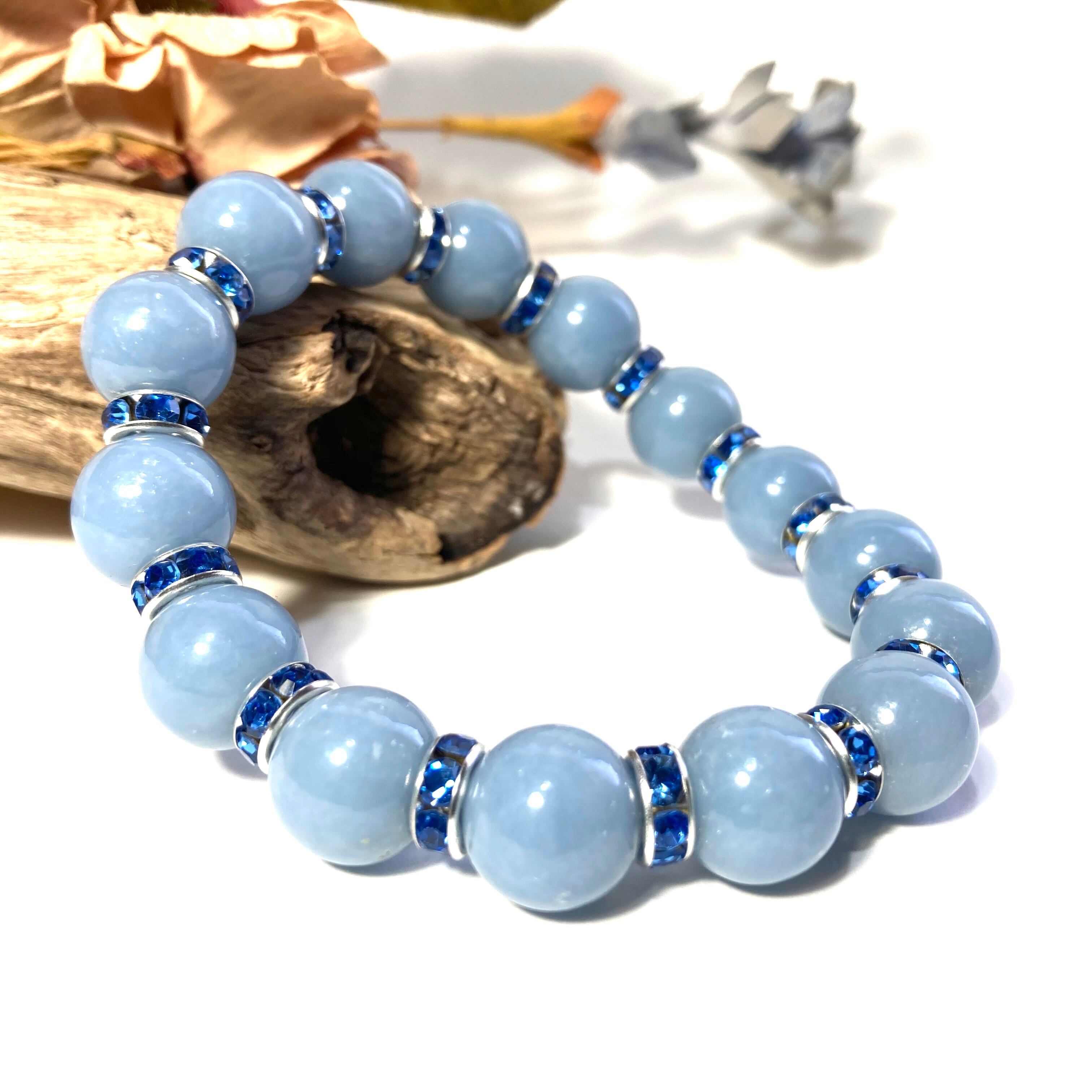 こちらは、12mm玉のエンジェライトを使用した天然石ブレスレットです。石との間にはロンデルを挟み高級感を演出しています。シンプルなデザインですのでどんなコーディネートとも合わせ易いブレスレットです。石大きさは12mm玉です。内周約18cmです。気になる方は是非この機会にどうぞ。