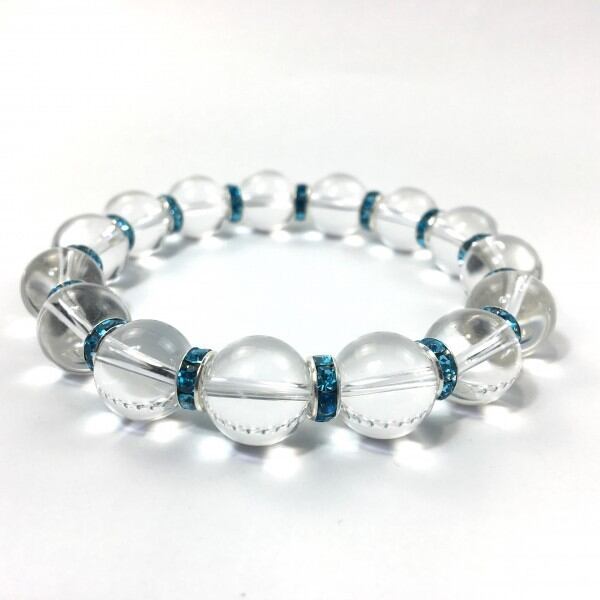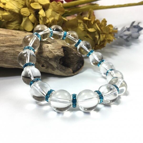 こちらは、12mm玉の水晶を使用した天然石ブレスレットです。石との間にはロンデルを挟み高級感を演出しています。シンプルなデザインですのでどんなコーディネートとも合わせ易いブレスレットです。石大きさは12mm玉です。内周約18cmです。気になる方は是非この機会にどうぞ。
