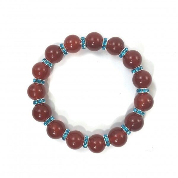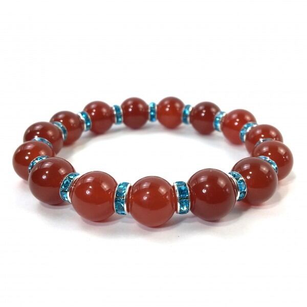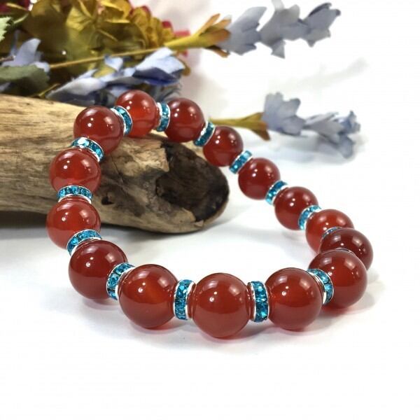 こちらは、12mm玉の赤瑪瑙を使用した天然石ブレスレットです。石との間にはロンデルを挟み高級感を演出しています。シンプルなデザインですのでどんなコーディネートとも合わせ易いブレスレットです。石大きさは12mm玉です。。内周約18cmです。気になる方は是非この機会にどうぞ。