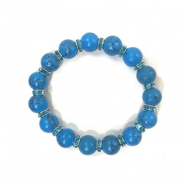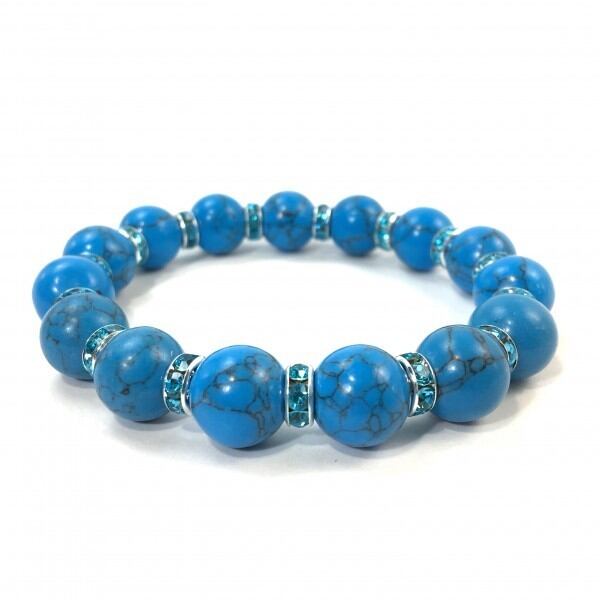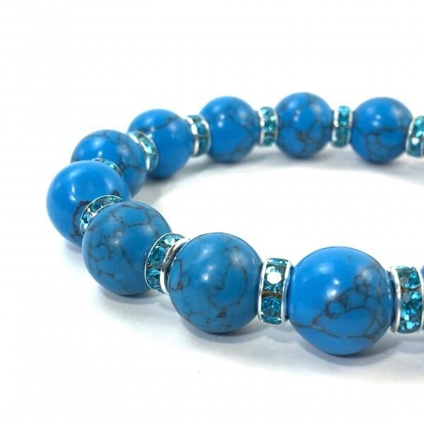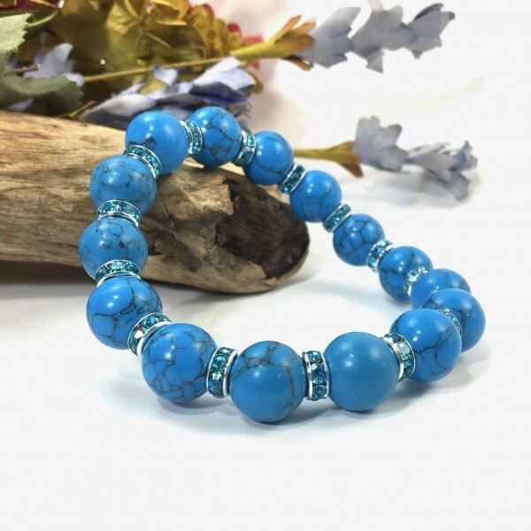 こちらは、12mm玉のターコイズを使用したブレスレットです。石との間にはロンデルを挟み高級感を演出しています。シンプルなデザインですのでどんなコーディネートとも合わせ易いブレスレットです。石大きさは12mm玉です。内周約18cmです。気になる方は是非この機会にどうぞ。