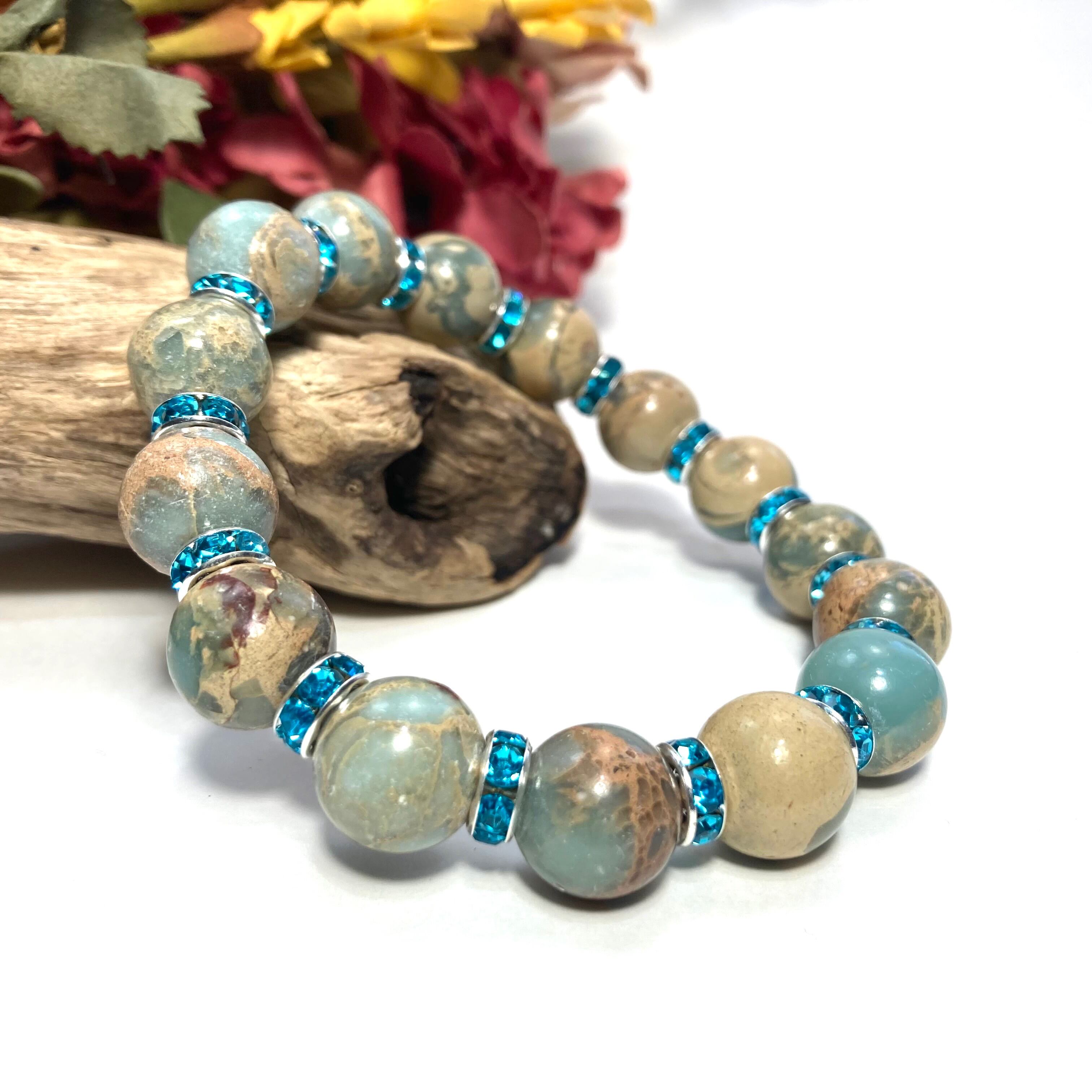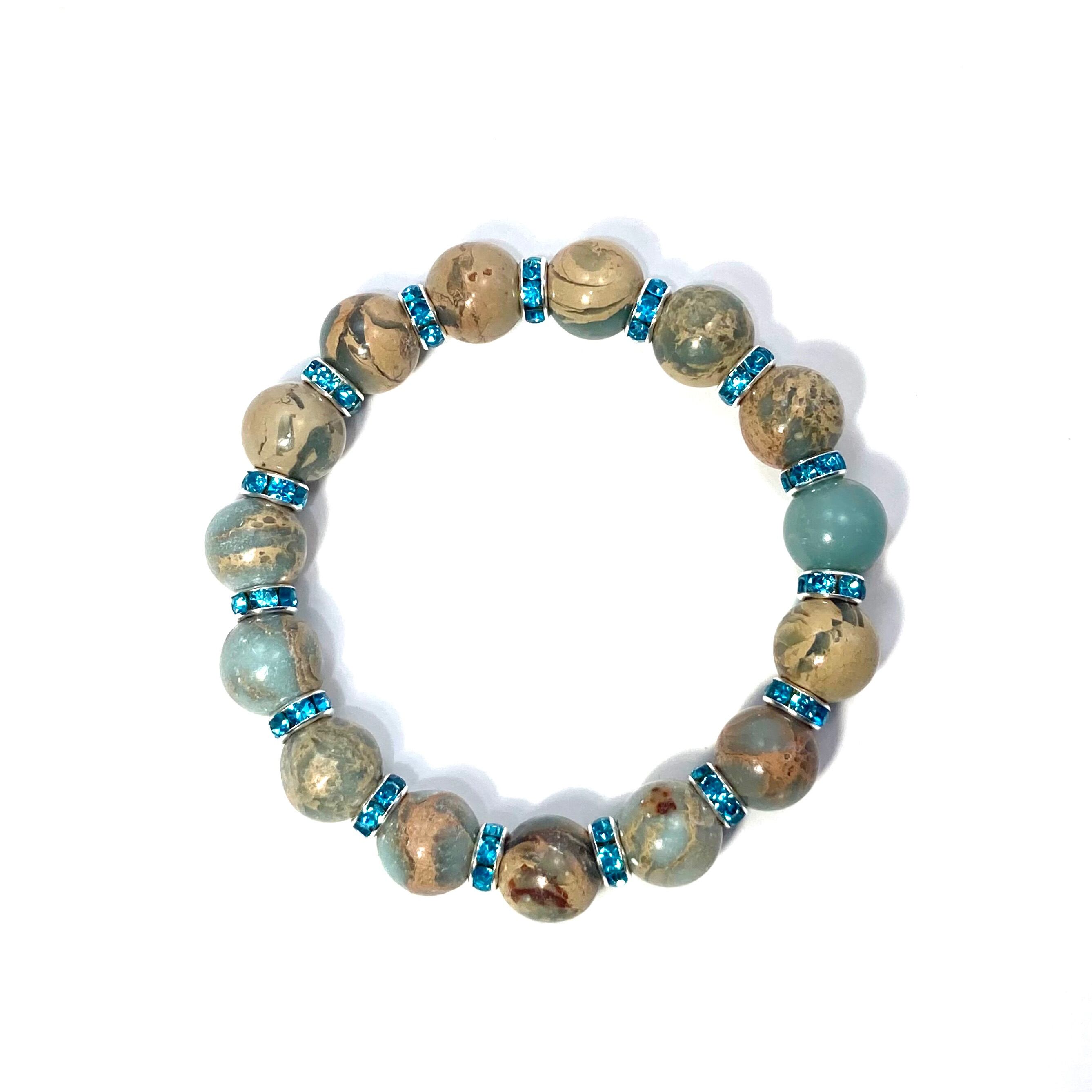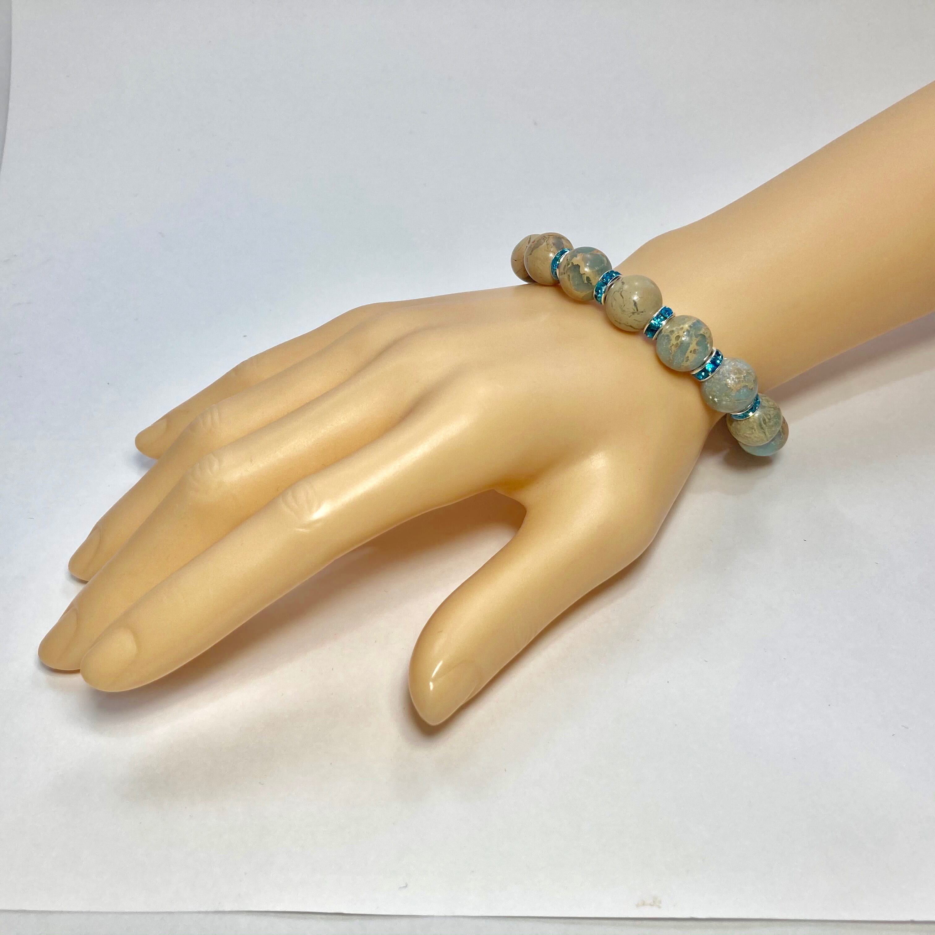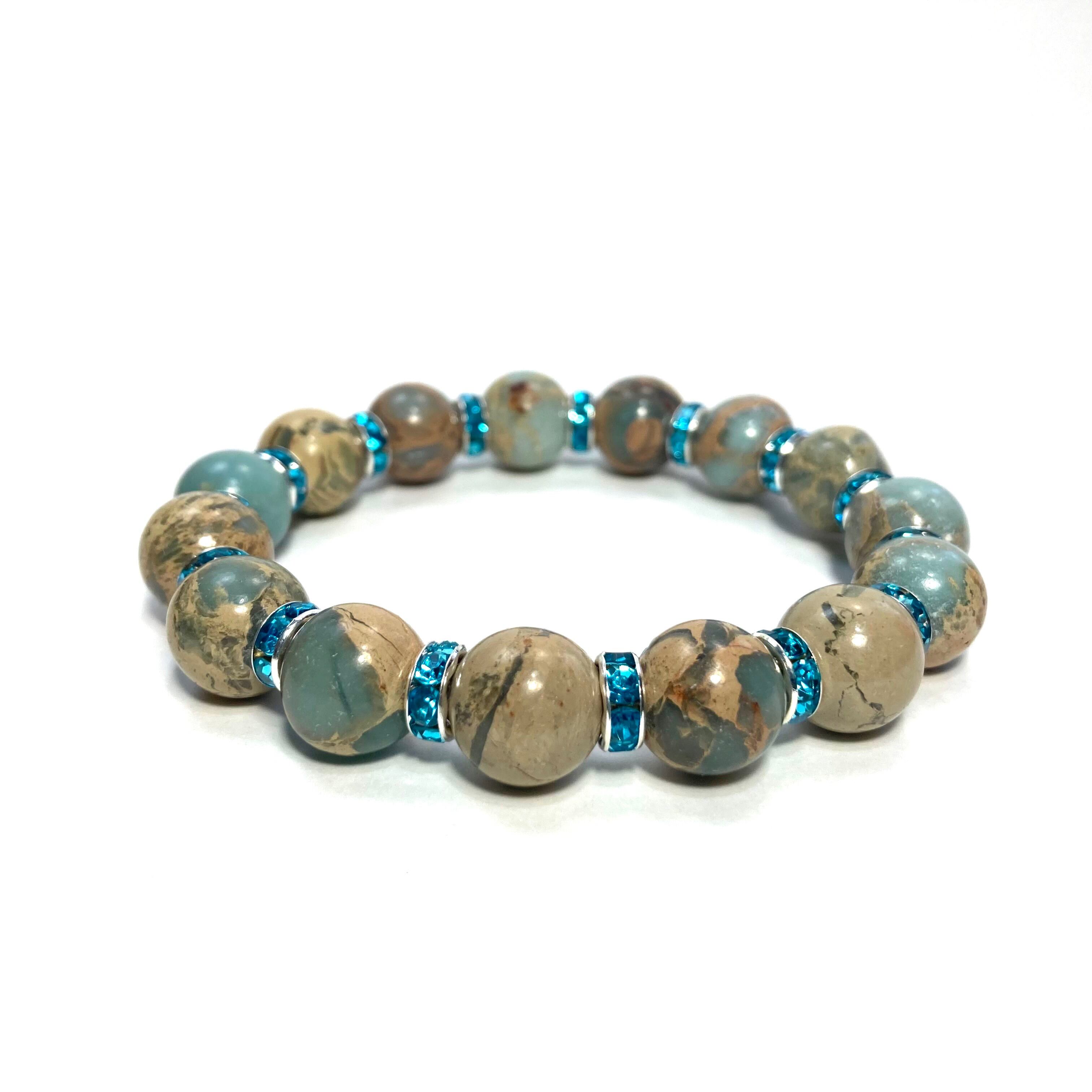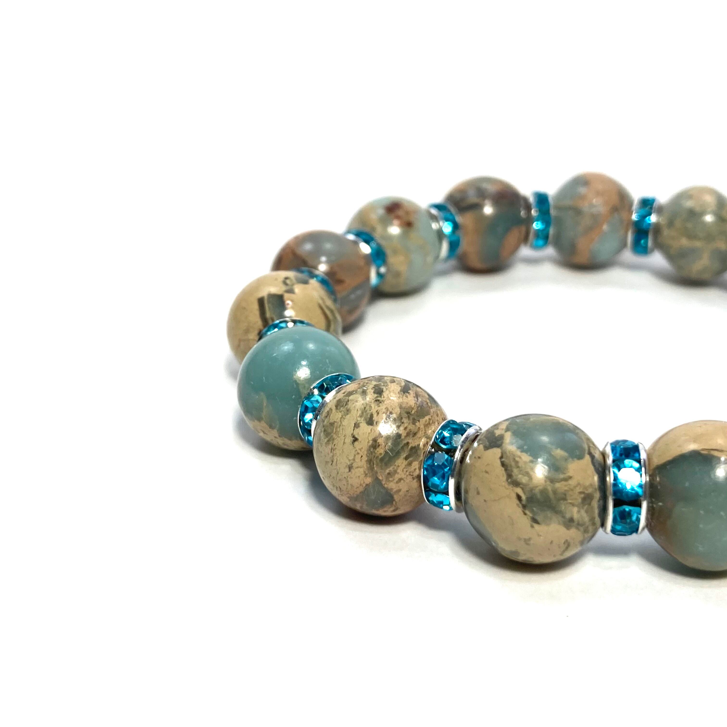 こちらは、12mm玉のインプレッションストーンを使用した天然石ブレスレットです。石との間にはロンデルを挟み高級感を演出しています。シンプルなデザインですのでどんなコーディネートとも合わせ易いブレスレットです。石大きさは12mm玉です。内周約18cmです。気になる方は是非この機会にどうぞ。
