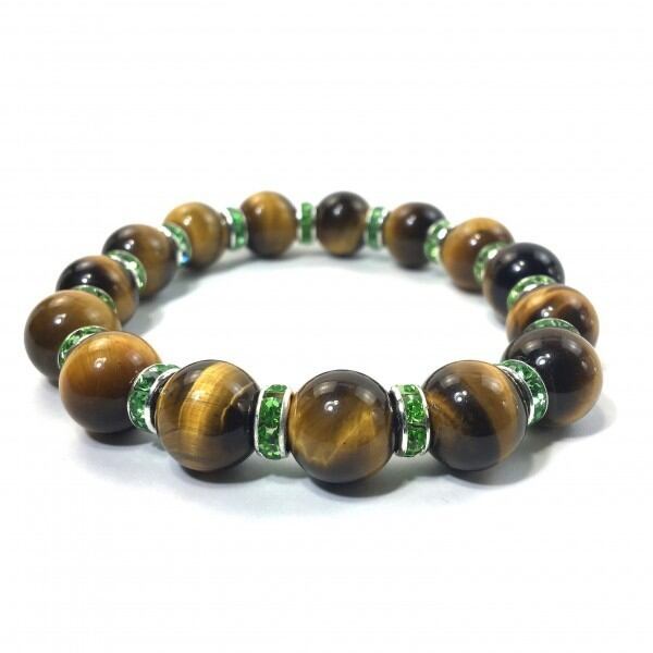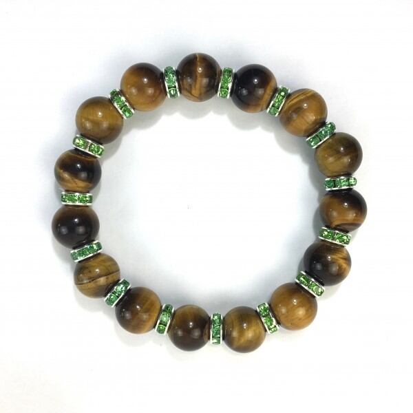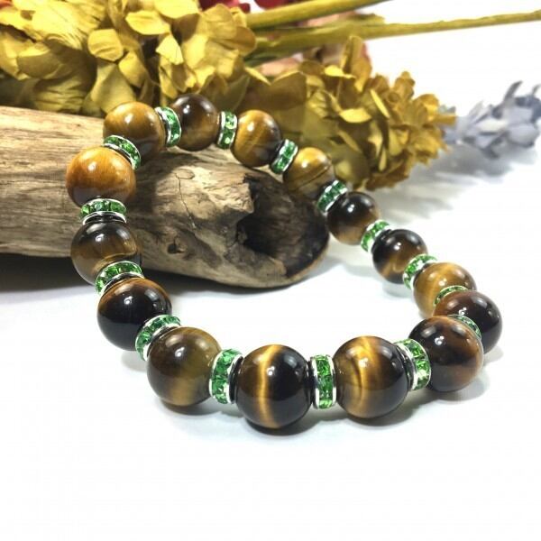 こちらは、12mm玉のタイガーアイを使用した天然石ブレスレットです。石との間にはロンデルを挟み高級感を演出しています。シンプルなデザインですのでどんなコーディネートとも合わせ易いブレスレットです。石大きさは12mm玉です。内周約18cmです。気になる方は是非この機会にどうぞ。