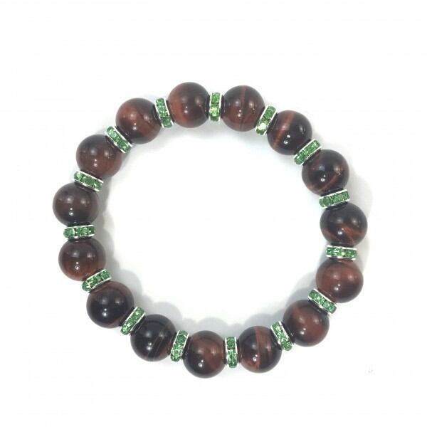 こちらは、12mm玉のレッドタイガーアイを使用した天然石ブレスレットです。石との間にはロンデルを挟み高級感を演出しています。シンプルなデザインですのでどんなコーディネートとも合わせ易いブレスレットです。石大きさは12mm玉です。内周約18cmです。気になる方は是非この機会にどうぞ。