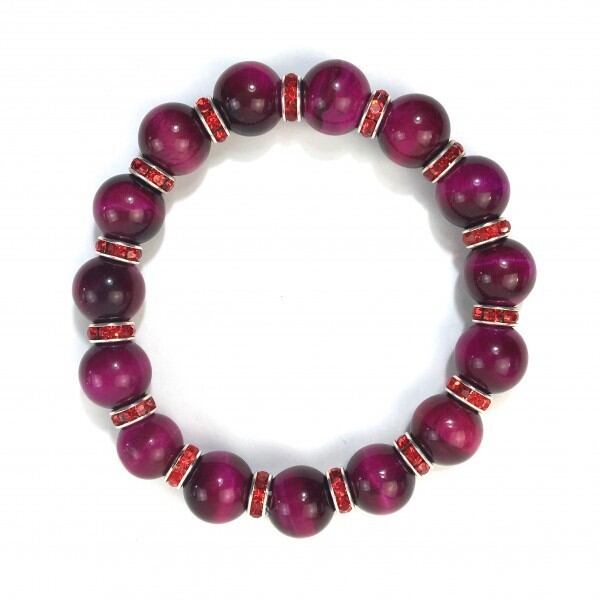 こちらは、12mm玉のピンクタイガーアイを使用したブレスレットです。石との間にはロンデルを挟み高級感を演出しています。シンプルなデザインですのでどんなコーディネートとも合わせ易いブレスレットです。石大きさは12mm玉です。内周約18cmです。気になる方は是非この機会にどうぞ。