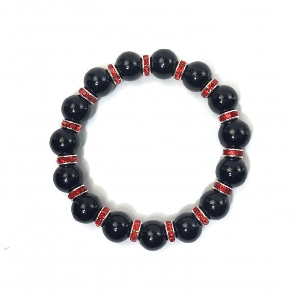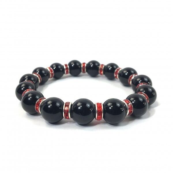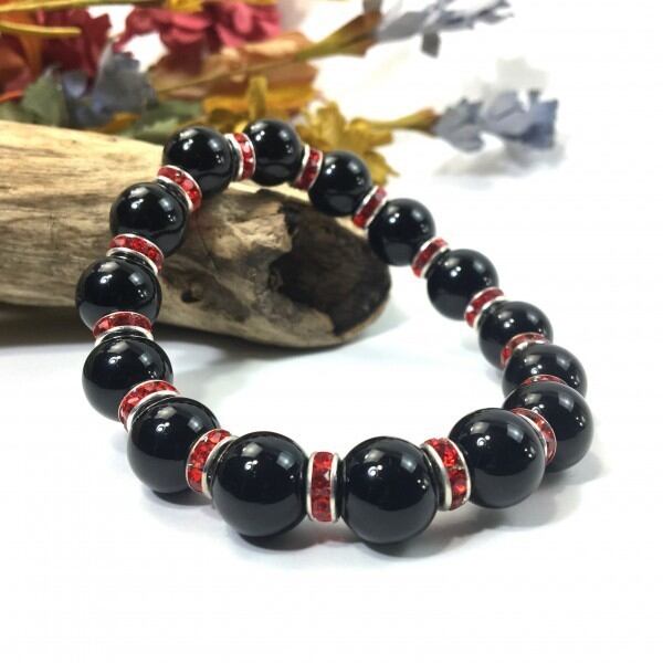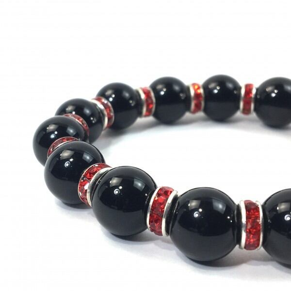 こちらは、12mm玉のオニキスを使用した天然石ブレスレットです。石との間にはロンデルを挟み高級感を演出しています。シンプルなデザインですのでどんなコーディネートとも合わせ易いブレスレットです。石大きさは12mm玉です。内周約18cmです。気になる方は是非この機会にどうぞ。