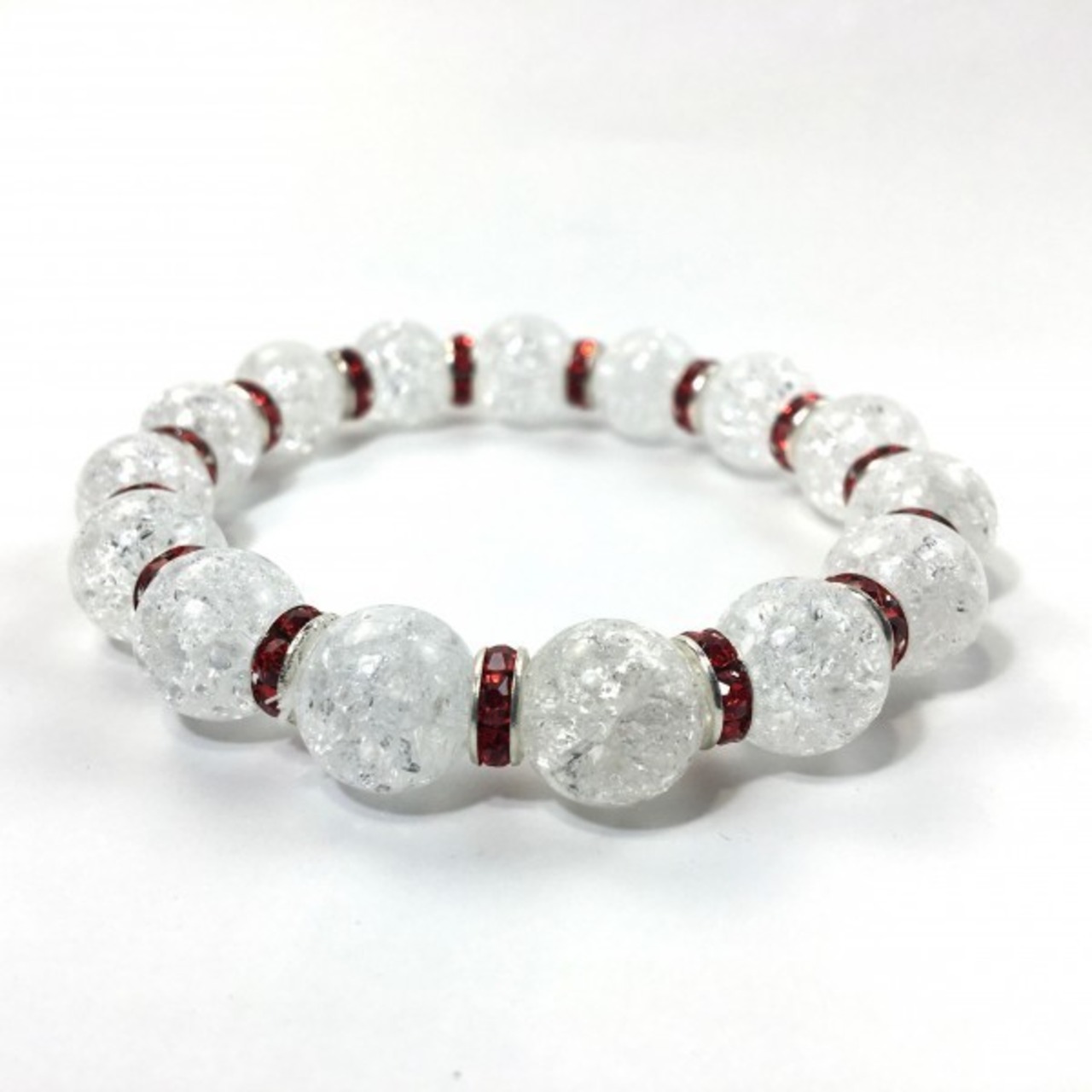 こちらは、12mm玉のクラック水晶を使用した天然石ブレスレットです。石との間にはロンデルを挟み高級感を演出しています。シンプルなデザインですのでどんなコーディネートとも合わせ易いブレスレットです。石大きさは12mm玉です。内周約18cmです。気になる方は是非この機会にどうぞ。