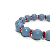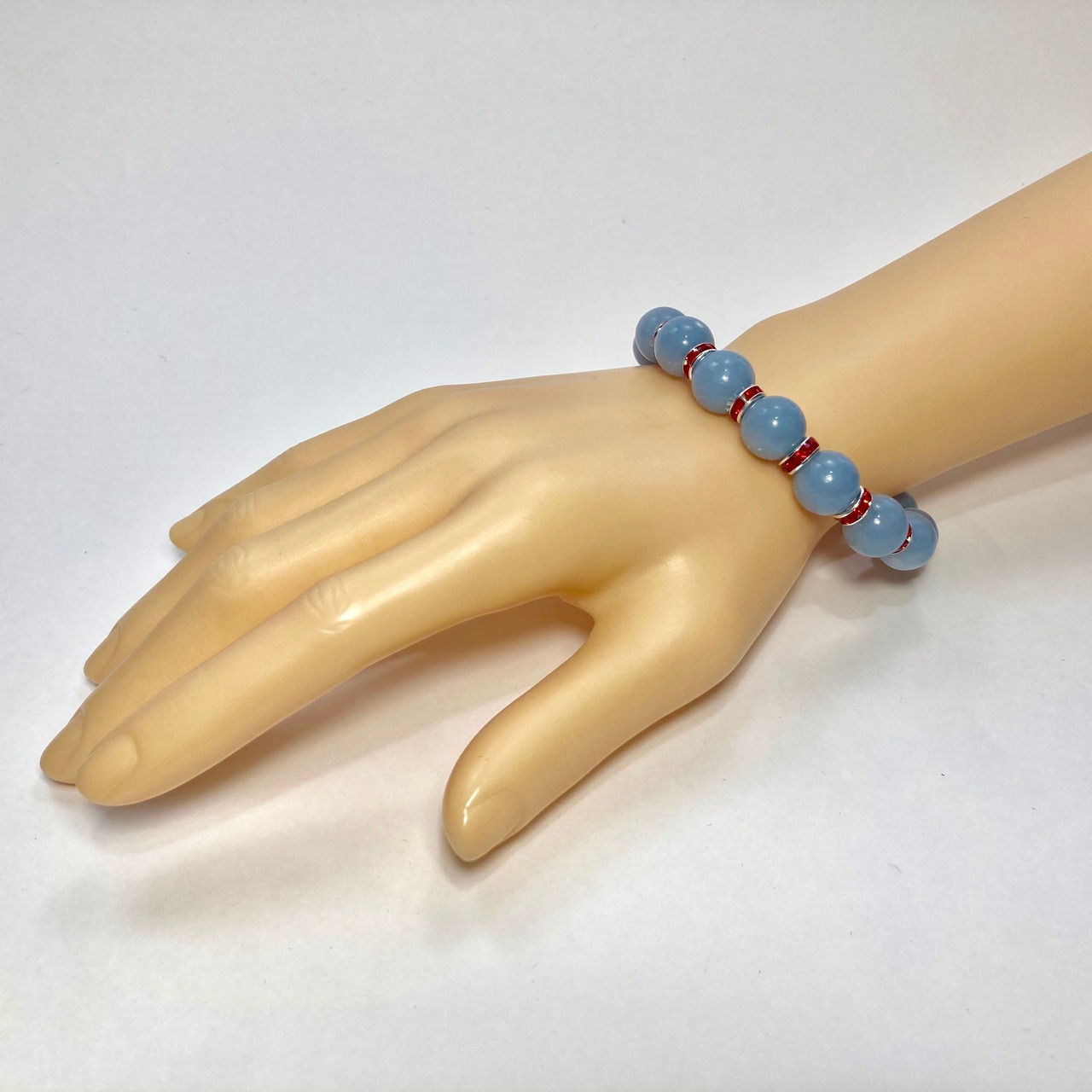 こちらは、12mm玉のエンジェライトを使用した天然石ブレスレットです。石との間にはロンデルを挟み高級感を演出しています。シンプルなデザインですのでどんなコーディネートとも合わせ易いブレスレットです。石大きさは12mm玉です。内周約18cmです。気になる方は是非この機会にどうぞ。