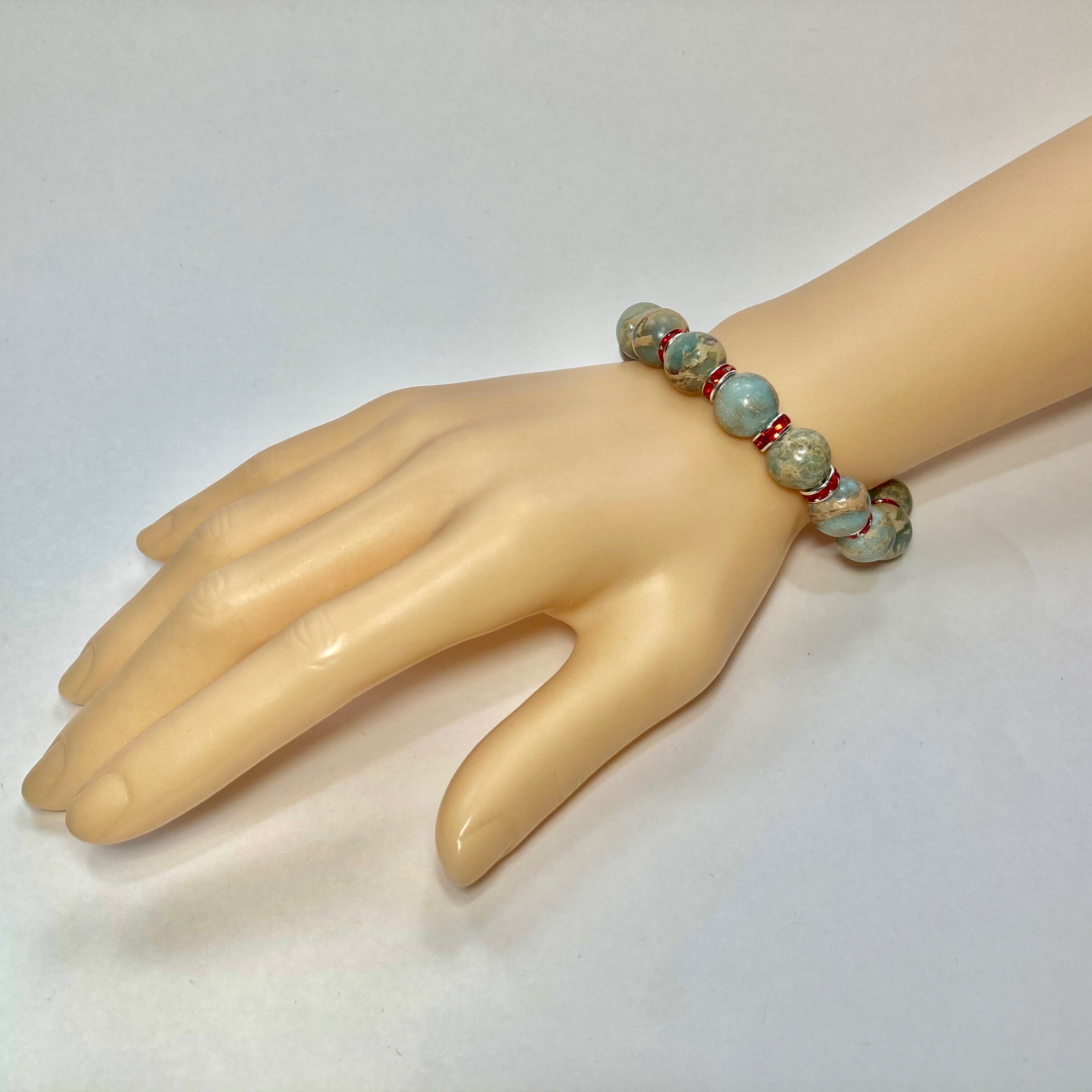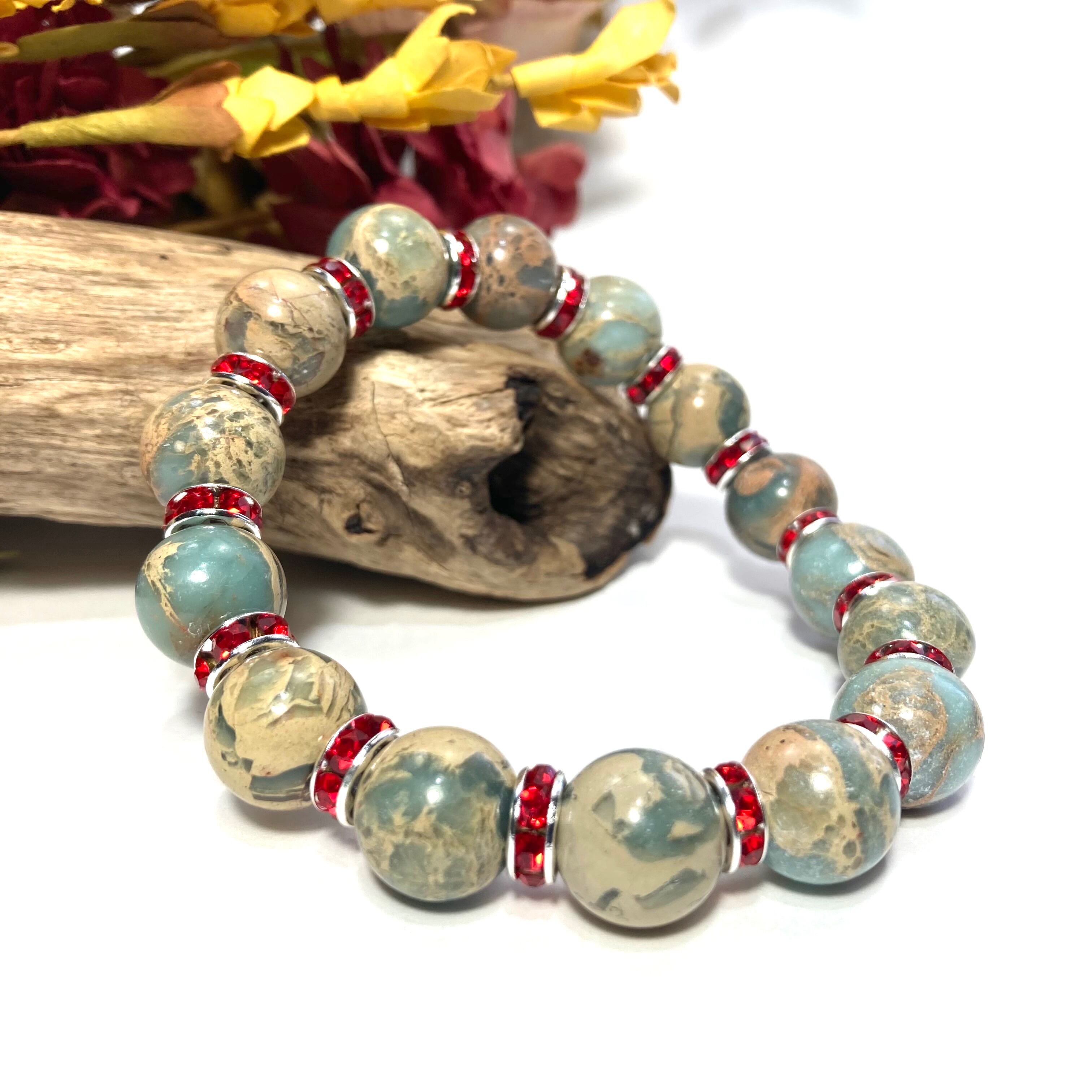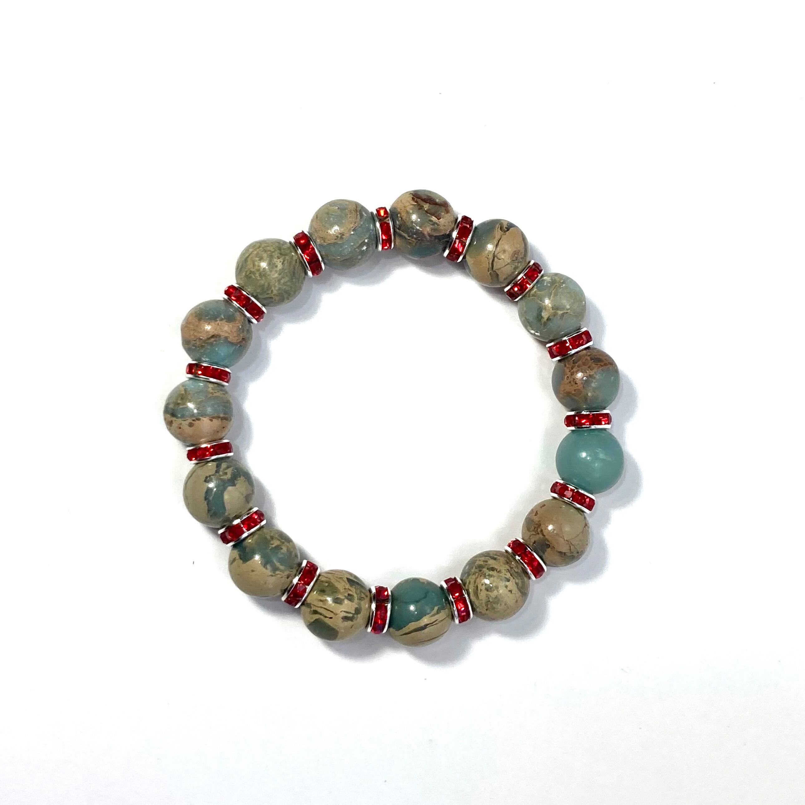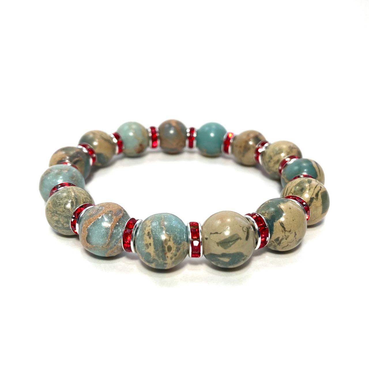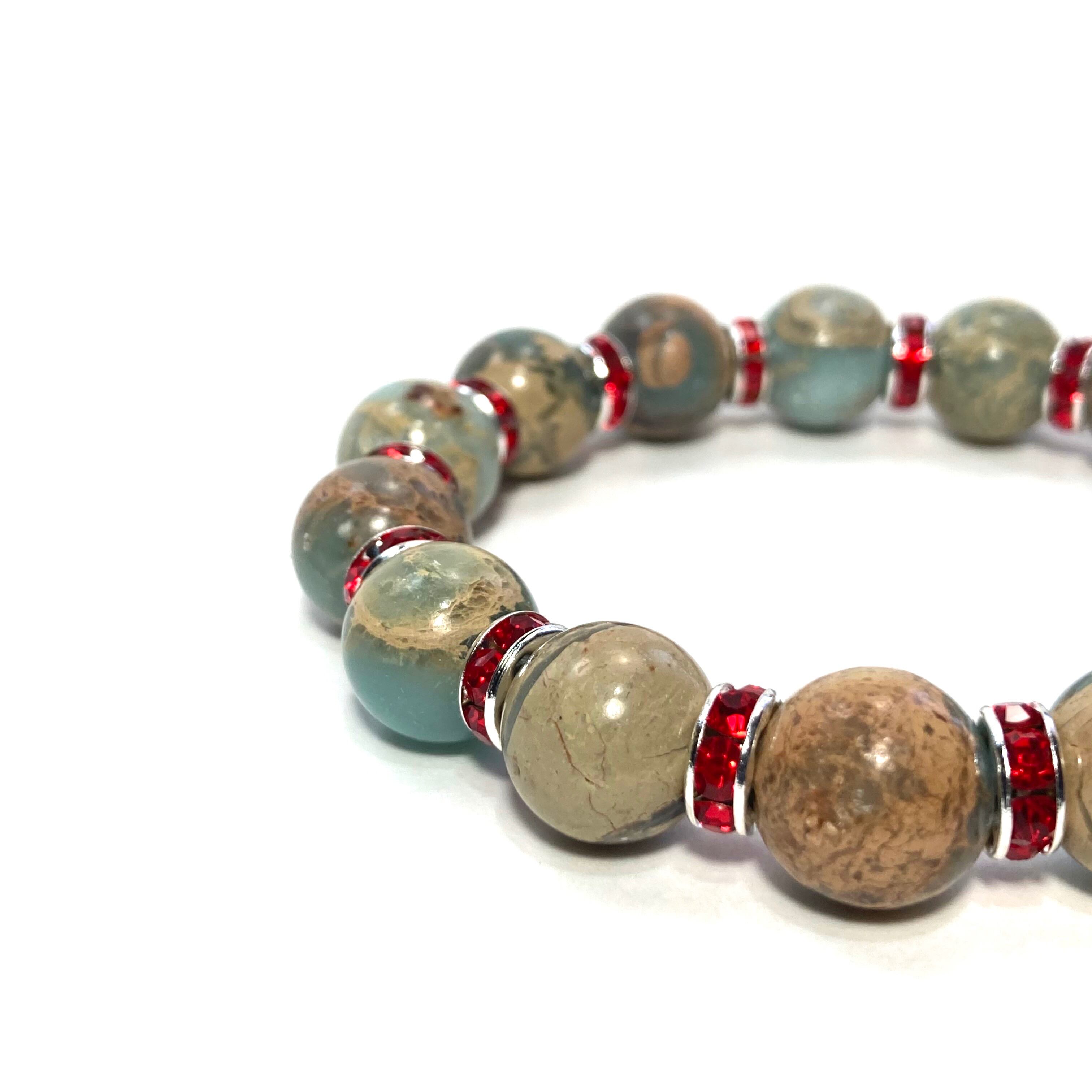 こちらは、12mm玉のインプレッションストーンを使用した天然石ブレスレットです。石との間にはロンデルを挟み高級感を演出しています。シンプルなデザインですのでどんなコーディネートとも合わせ易いブレスレットです。石大きさは12mm玉です。内周約18cmです。気になる方は是非この機会にどうぞ。