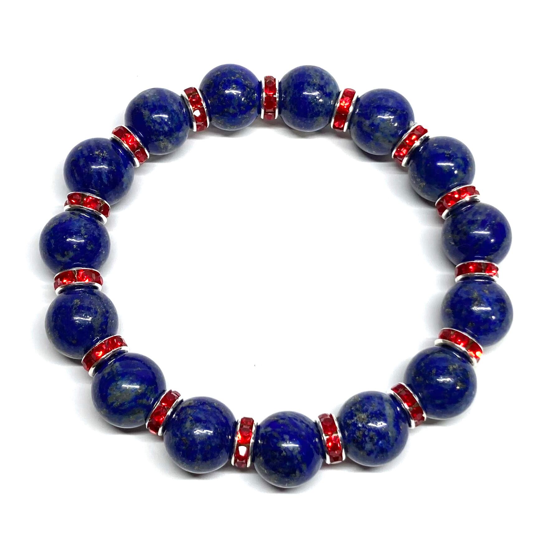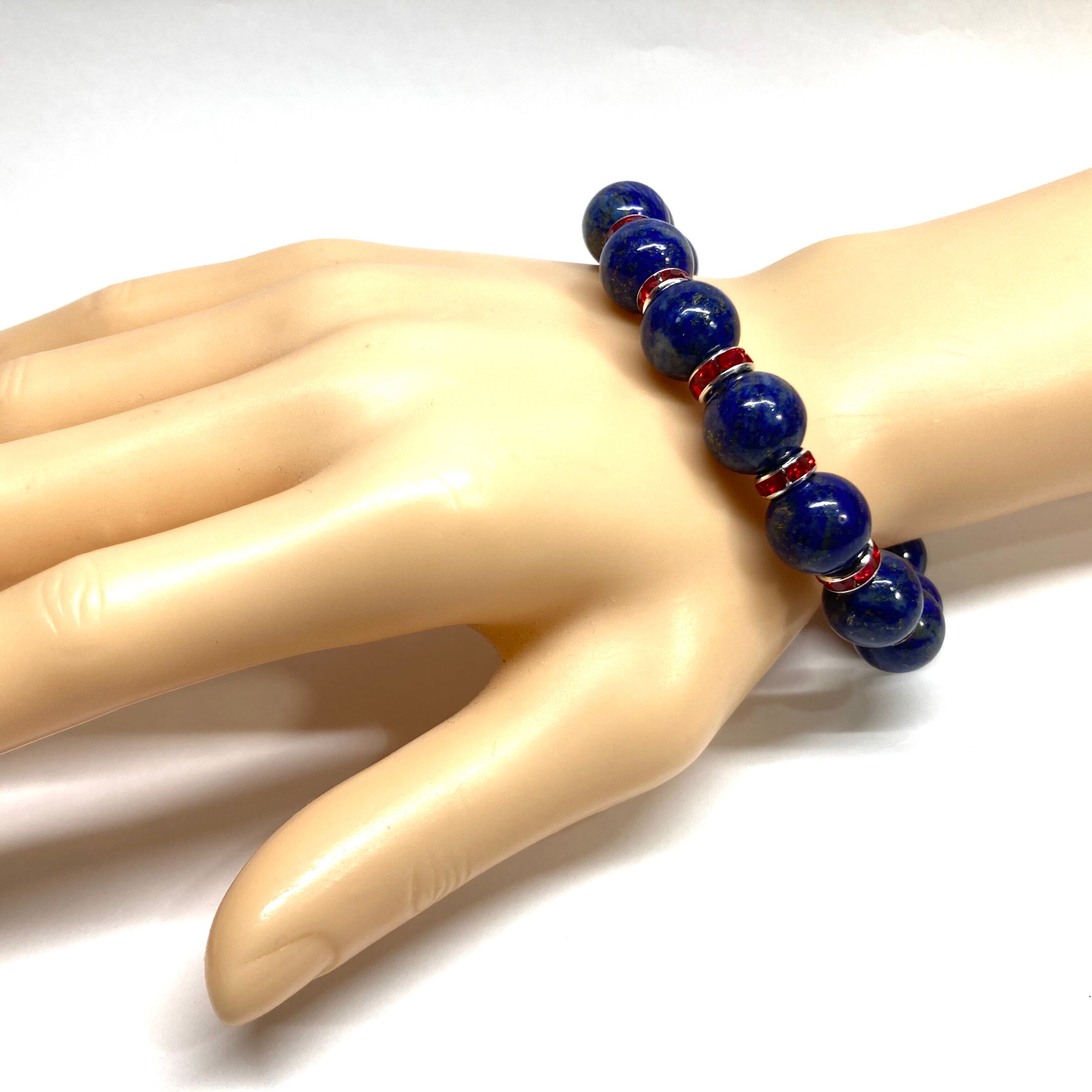 こちらは、12mm玉のラピスラズリを使用した天然石ブレスレットです。石との間にはロンデルを挟み高級感を演出しています。シンプルなデザインですのでどんなコーディネートとも合わせ易いブレスレットです。石大きさは12mm玉です。内周約18cmです。数に限りがございますので気になる方はお早めにどうぞ。