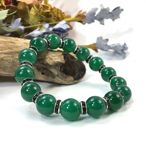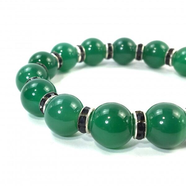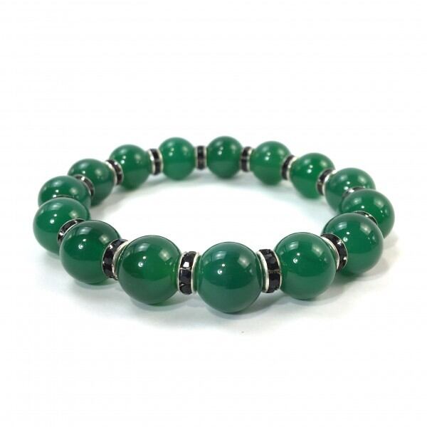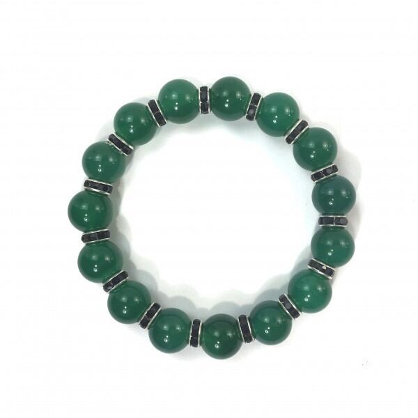 こちらは、12mm玉の緑瑪瑙を使用した天然石ブレスレットです。石との間にはロンデルを挟み高級感を演出しています。シンプルなデザインですのでどんなコーディネートとも合わせ易いブレスレットです。石大きさは12mm玉です。。内周約18cmです。気になる方は是非この機会にどうぞ。