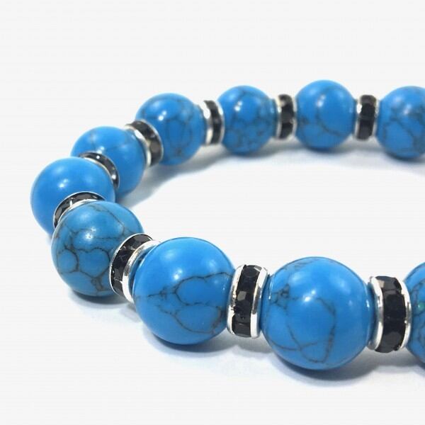 こちらは、12mm玉のターコイズを使用したブレスレットです。石との間にはロンデルを挟み高級感を演出しています。シンプルなデザインですのでどんなコーディネートとも合わせ易いブレスレットです。石大きさは12mm玉です。内周約18cmです。気になる方は是非この機会にどうぞ。