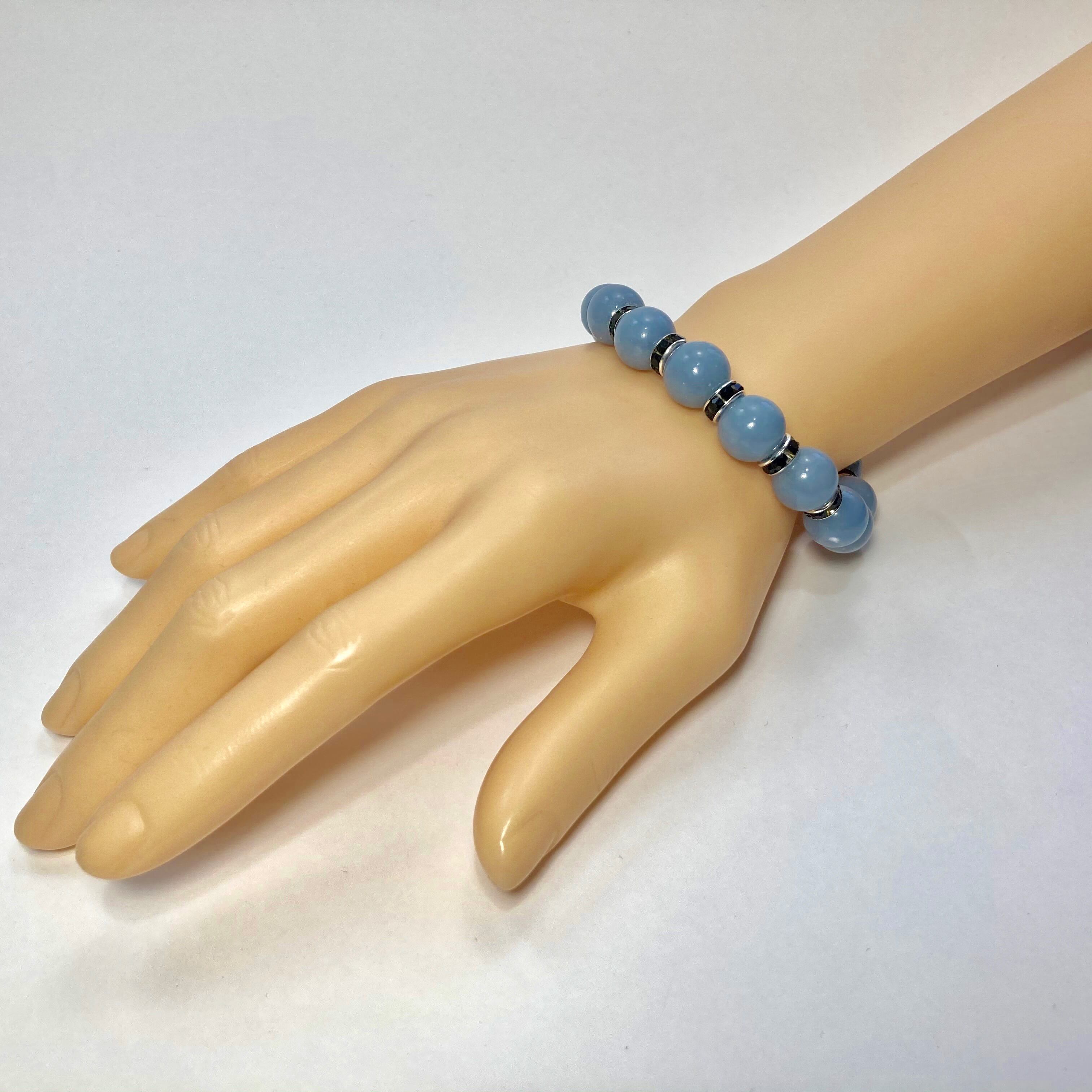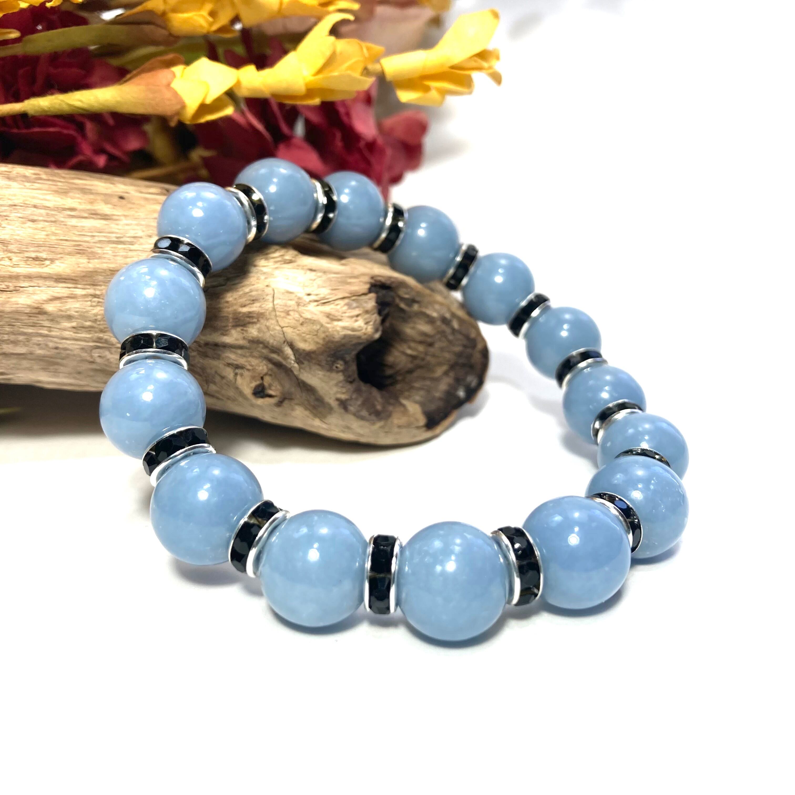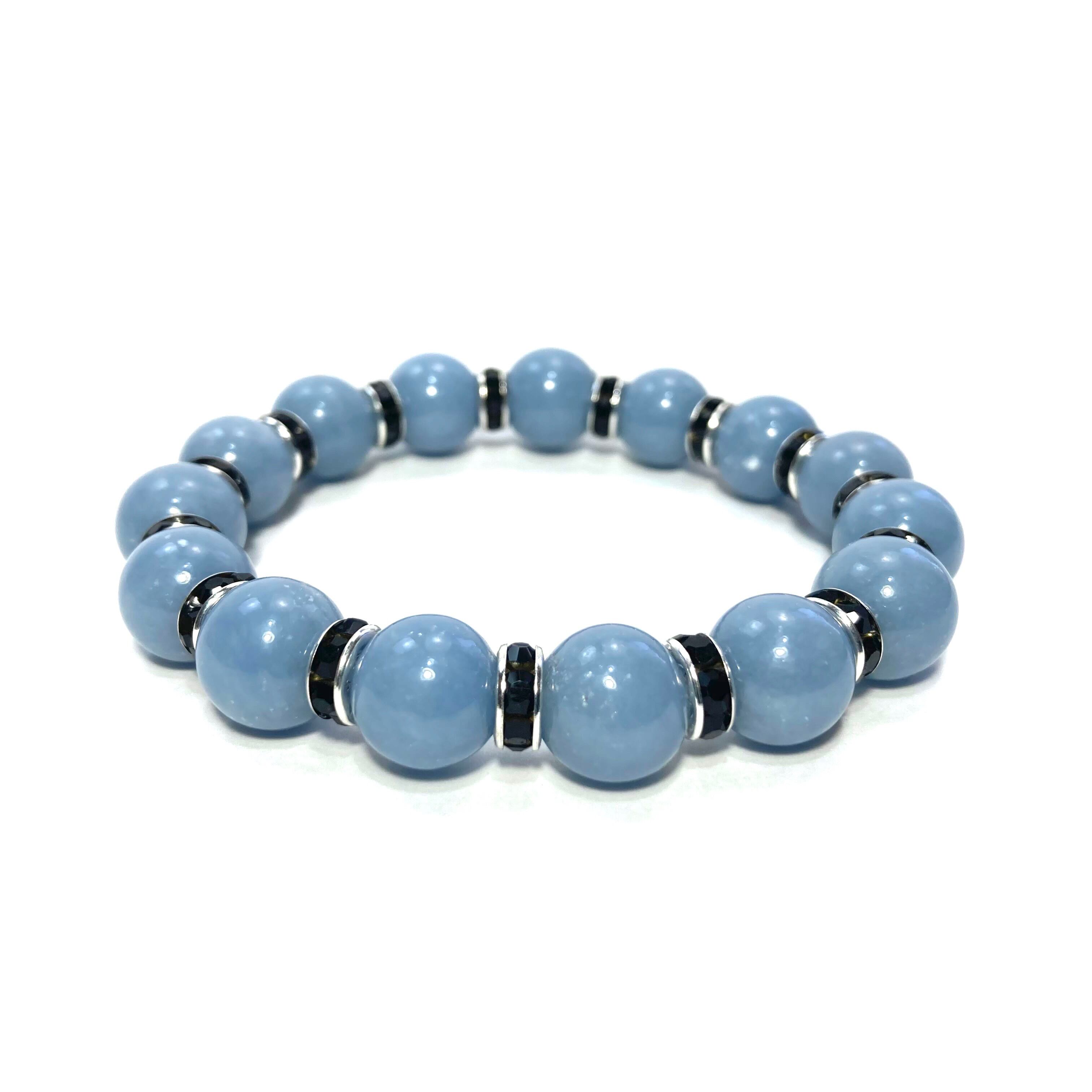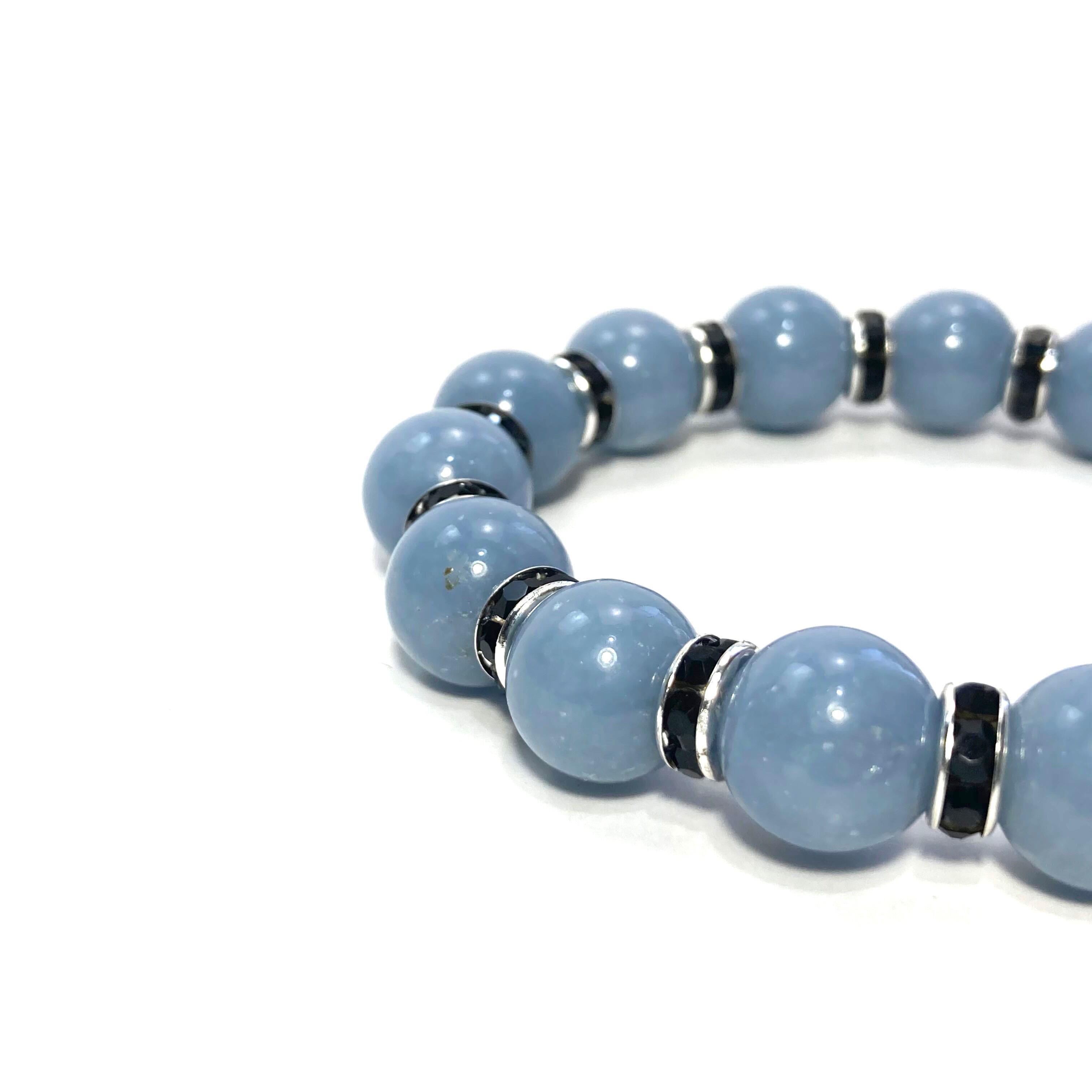 こちらは、12mm玉のエンジェライトを使用した天然石ブレスレットです。石との間にはロンデルを挟み高級感を演出しています。シンプルなデザインですのでどんなコーディネートとも合わせ易いブレスレットです。石大きさは12mm玉です。内周約18cmです。気になる方は是非この機会にどうぞ。