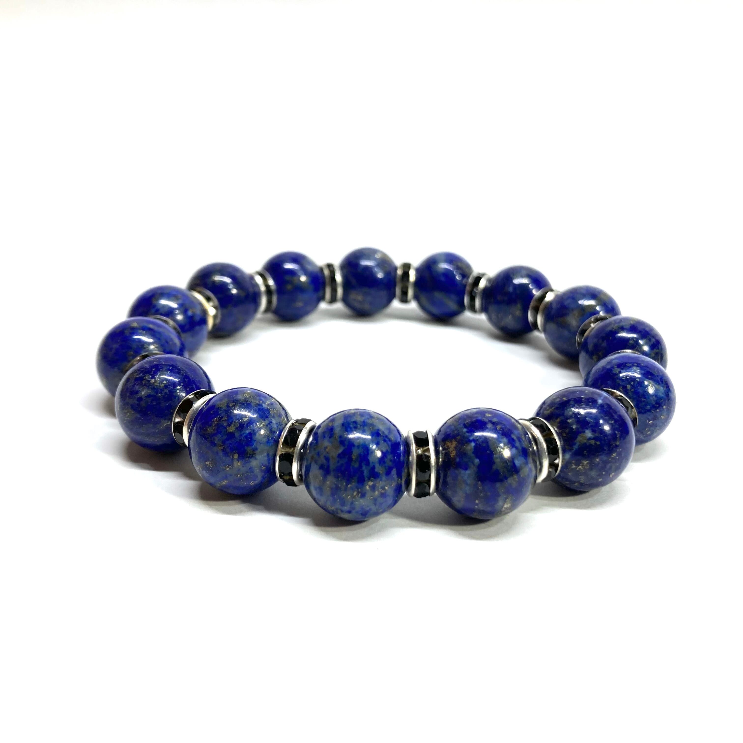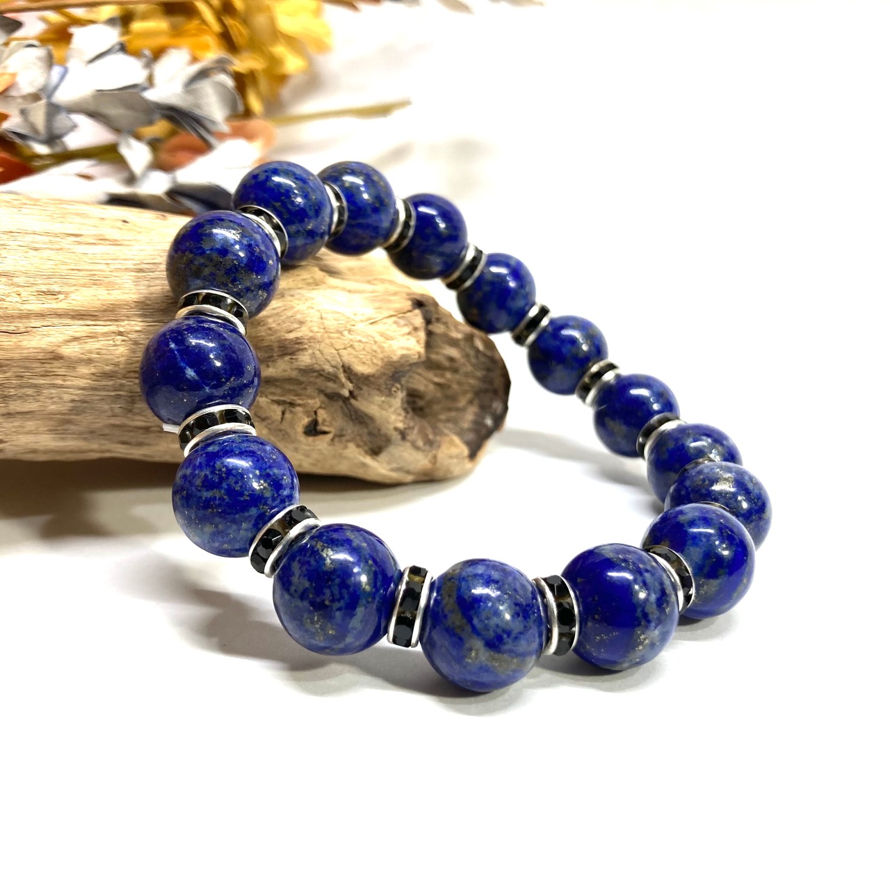 こちらは、12mm玉のラピスラズリを使用した天然石ブレスレットです。石との間にはロンデルを挟み高級感を演出しています。シンプルなデザインですのでどんなコーディネートとも合わせ易いブレスレットです。石大きさは12mm玉です。内周約18cmです。数に限りがございますので気になる方はお早めにどうぞ。