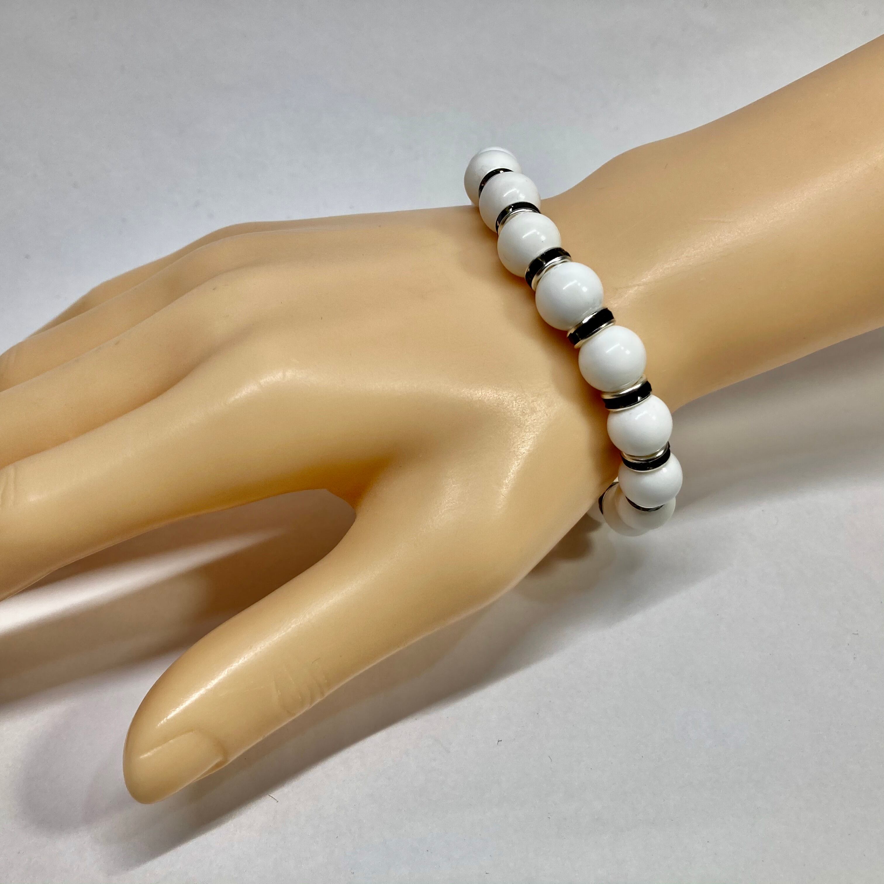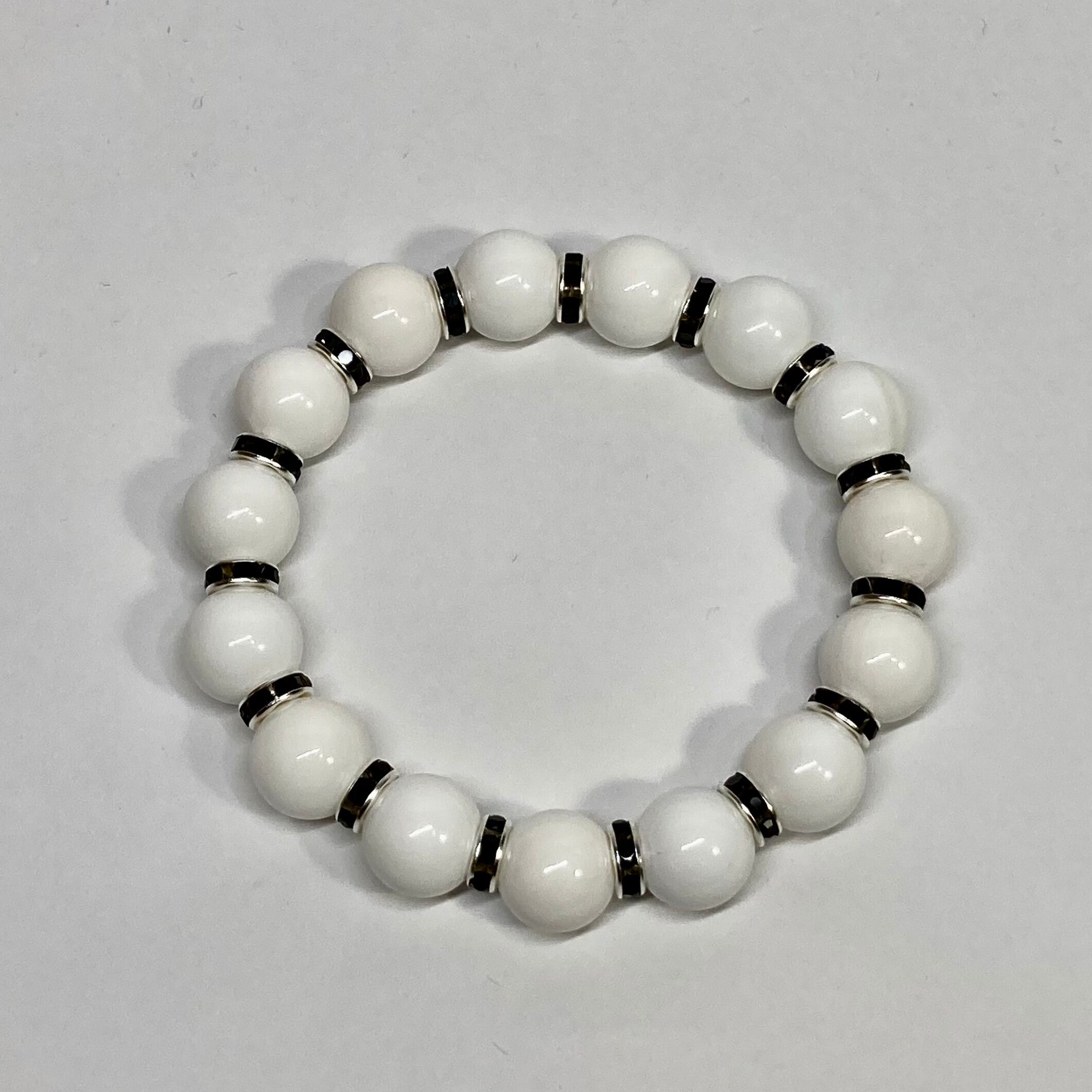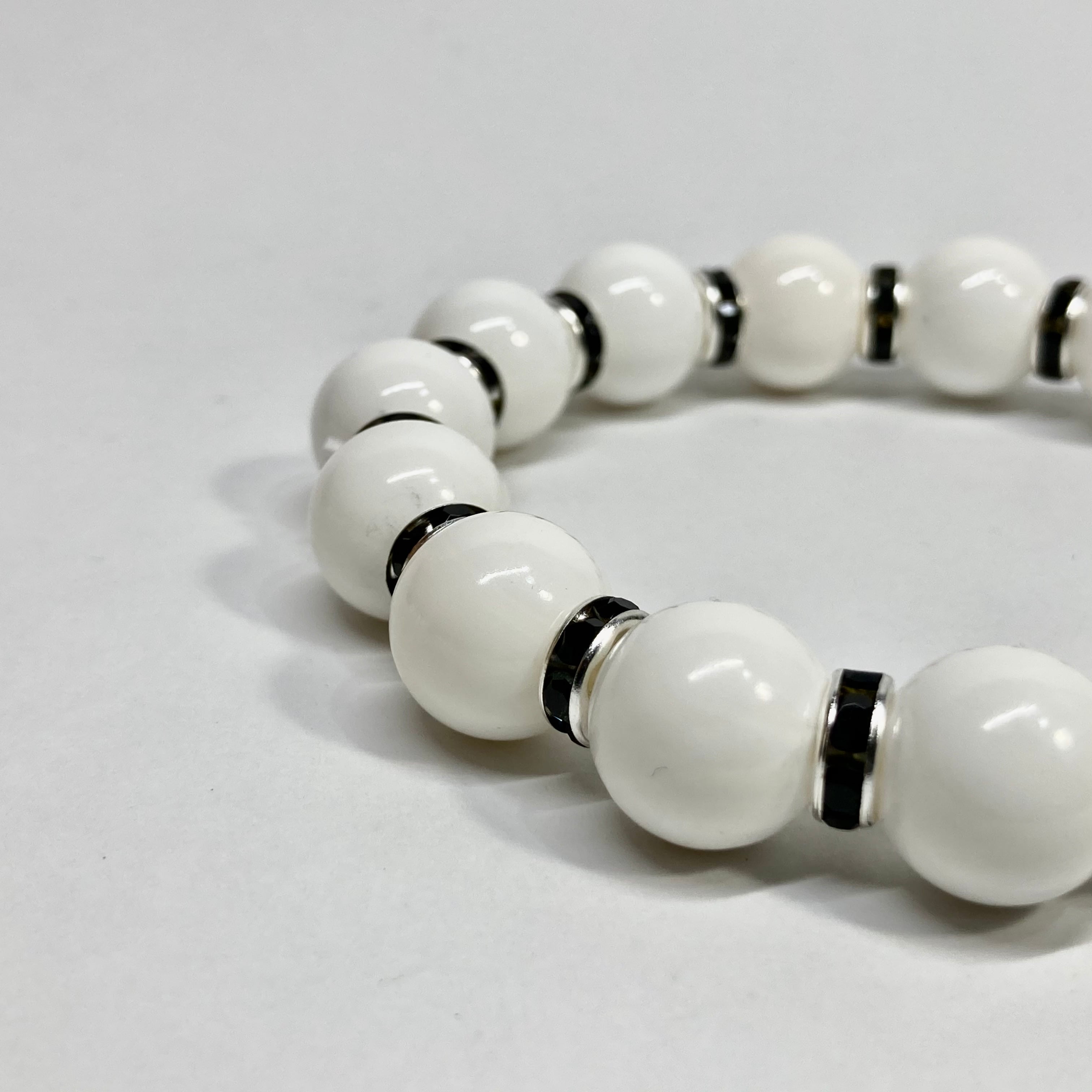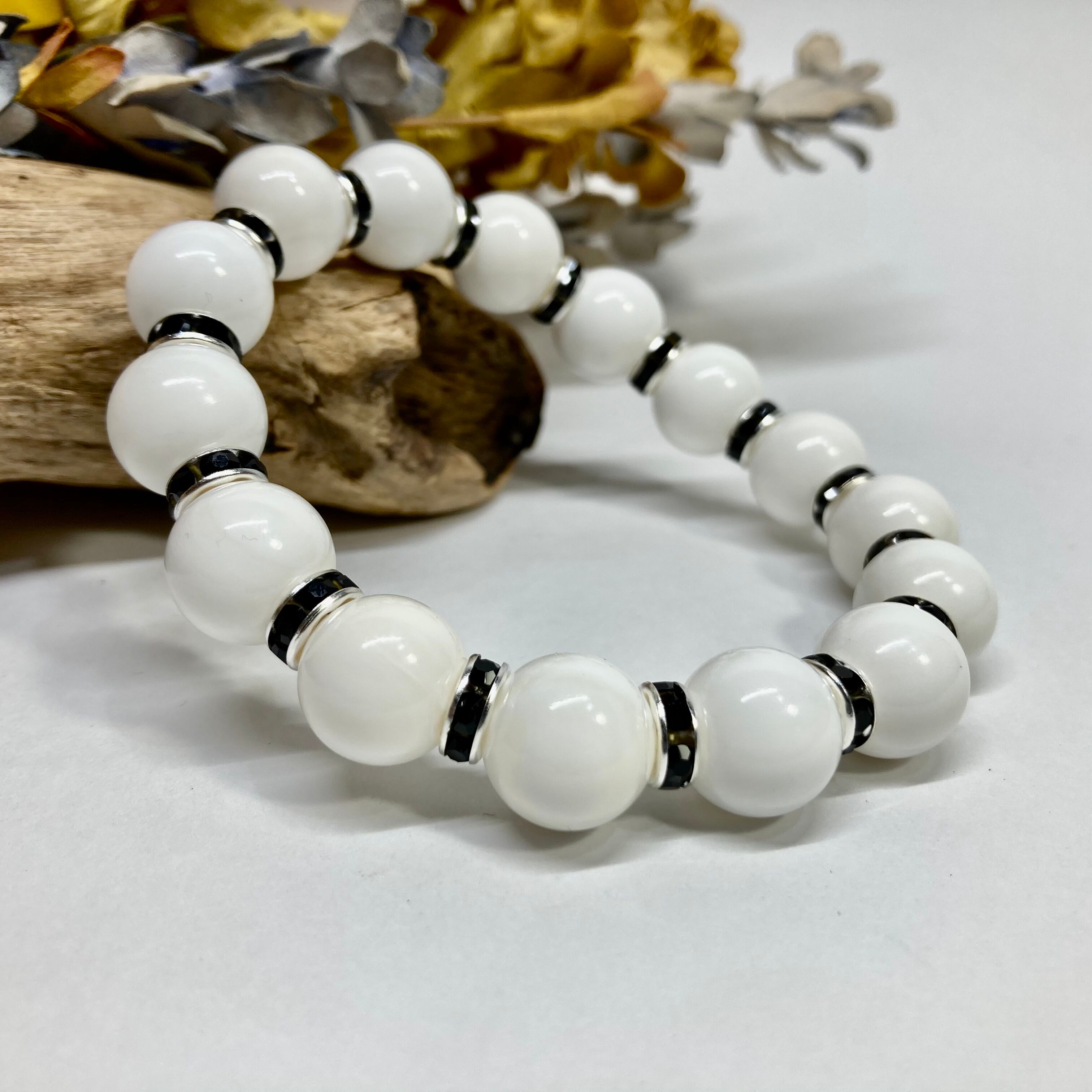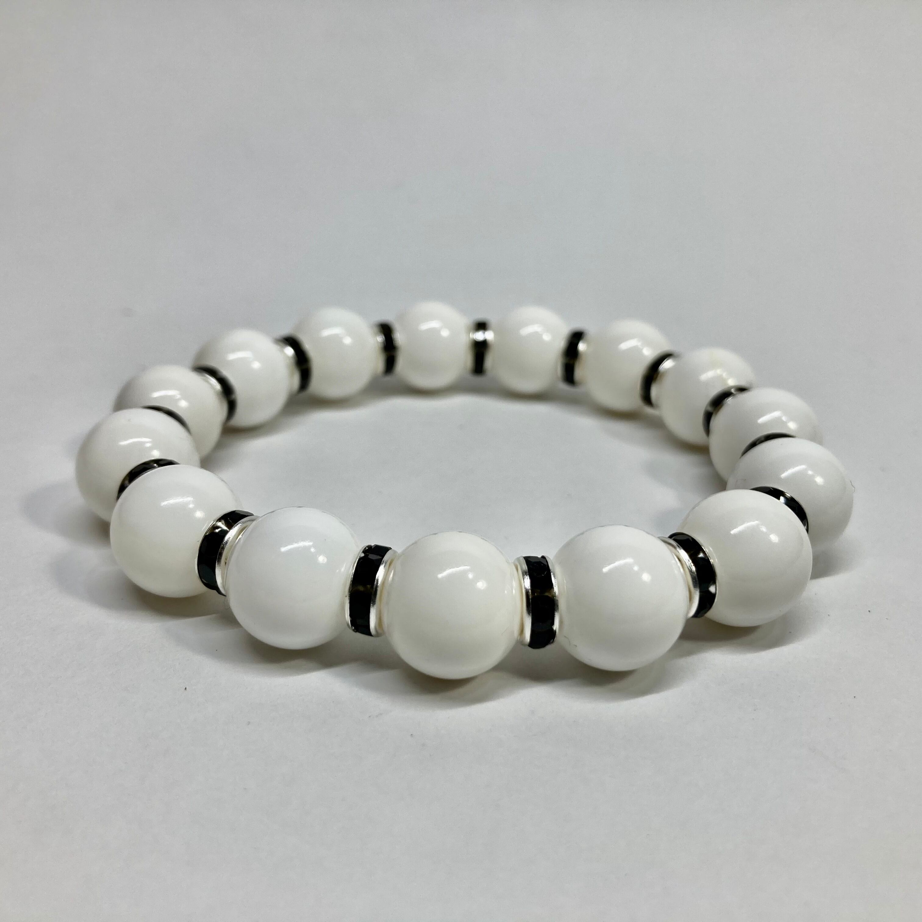 こちらは、12mm玉のホワイトオニキスを使用した天然石ブレスレットです。石との間にはロンデルを挟み高級感を演出しています。シンプルなデザインですのでどんなコーディネートとも合わせ易いブレスレットです。石大きさは12mm玉です。内周約18cmです。数に限りがございますので気になる方はお早めにどうぞ。
