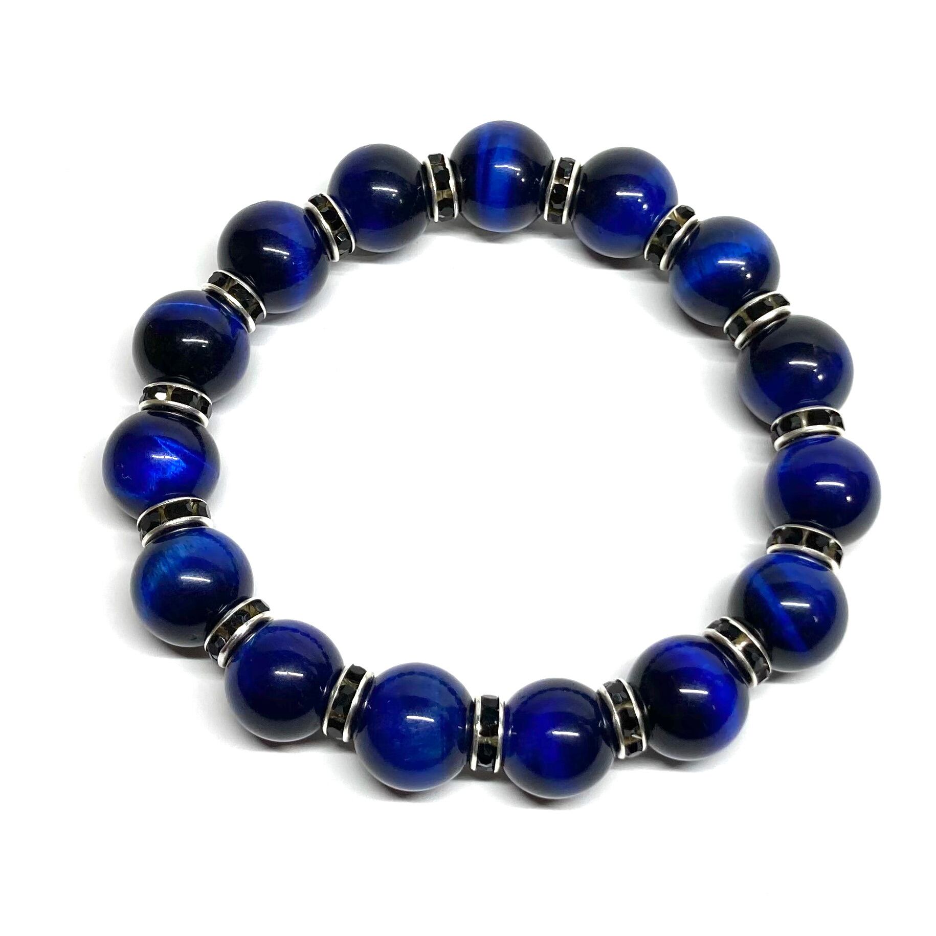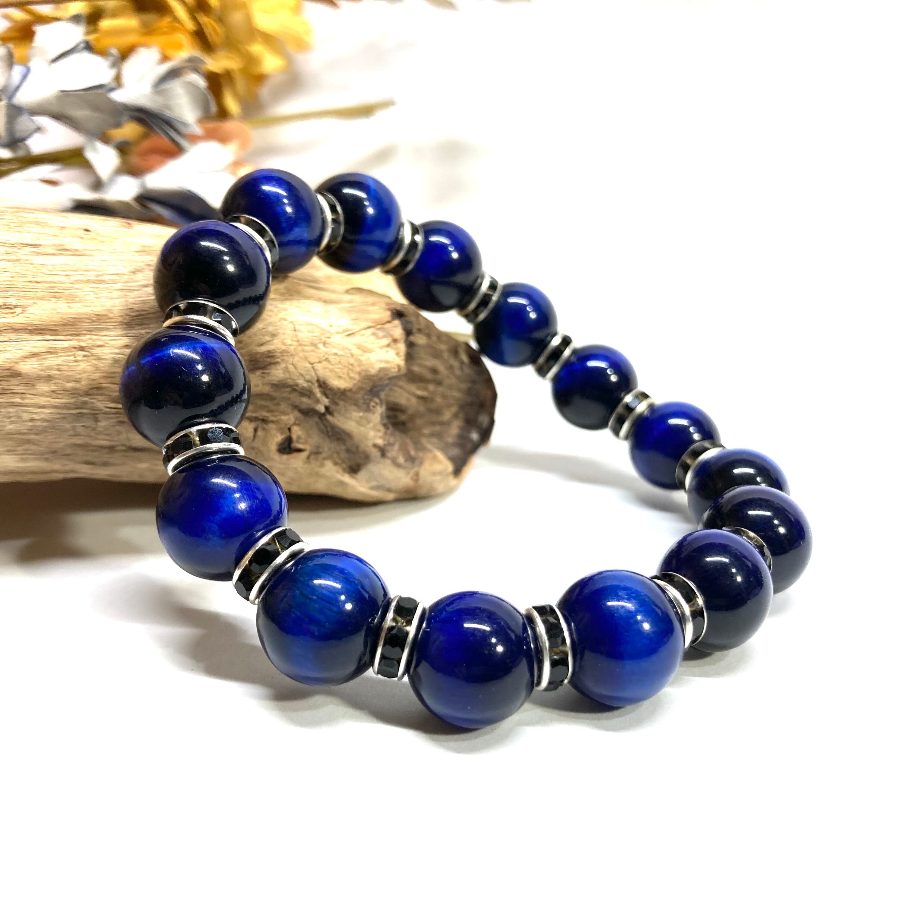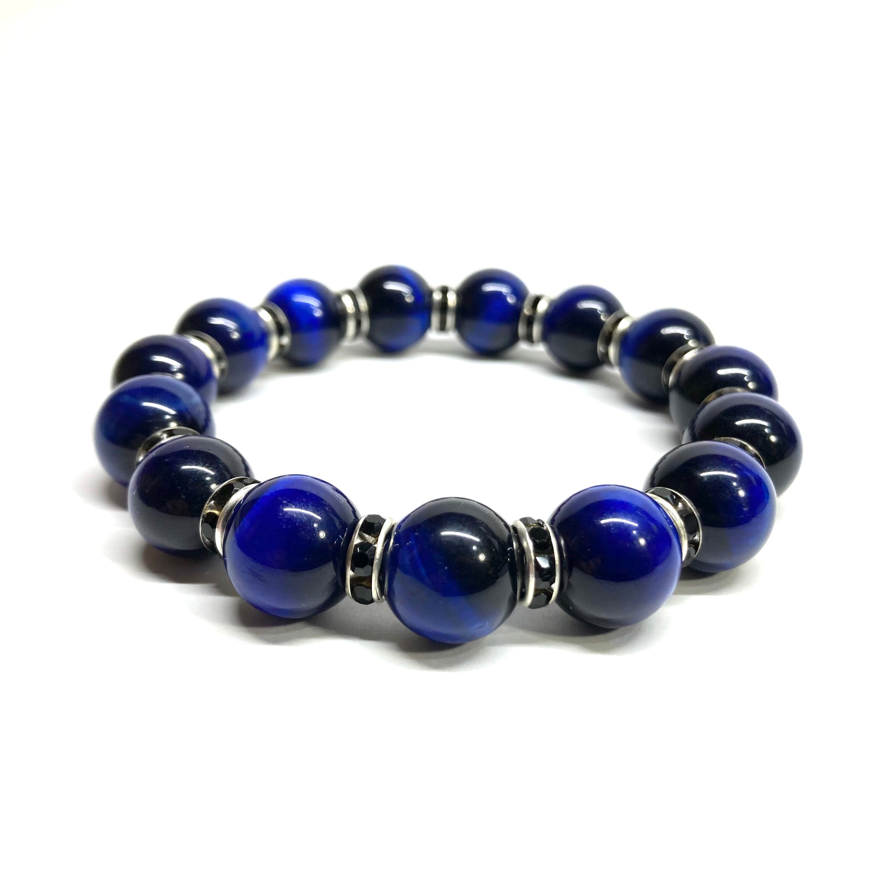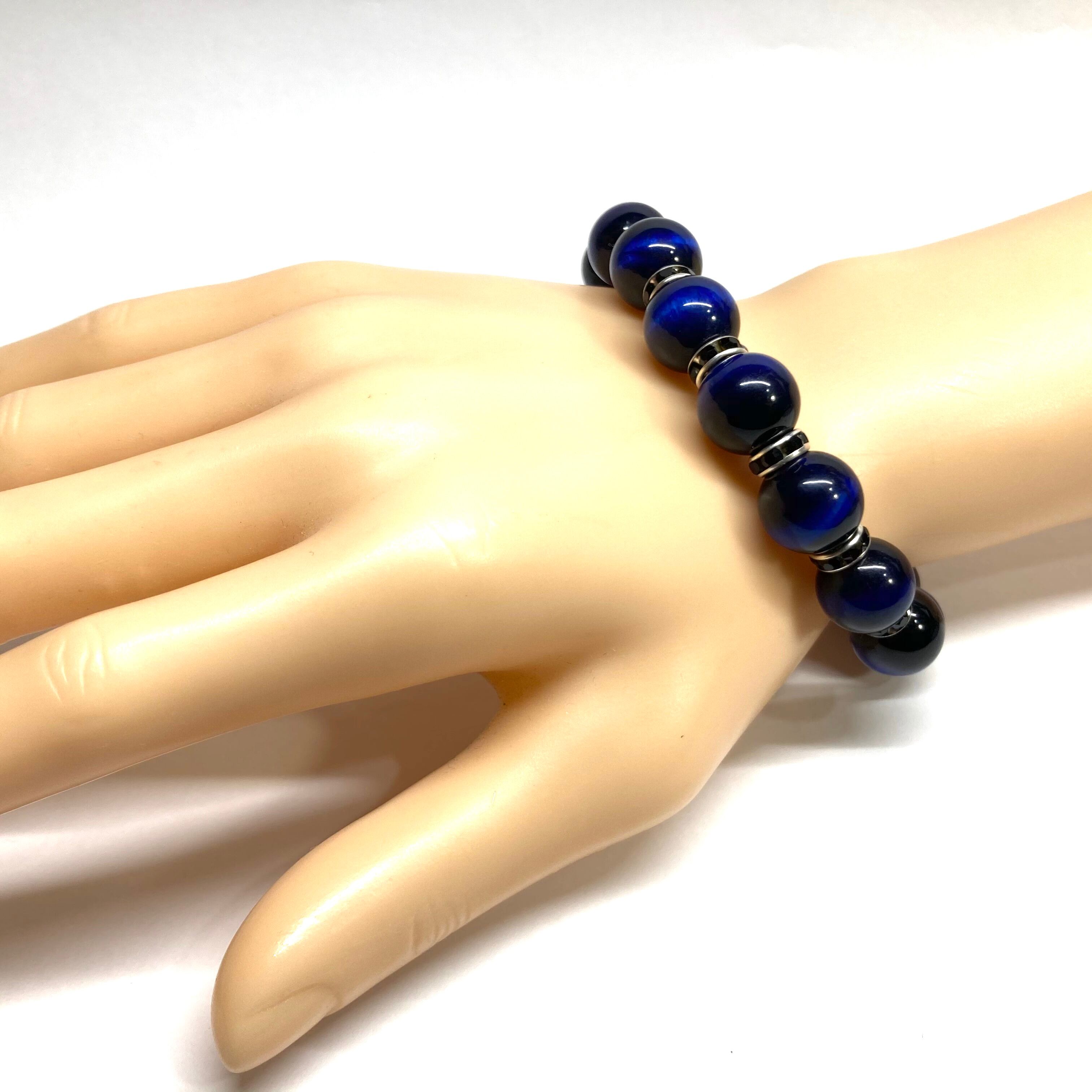 こちらは、12mm玉のブルータイガーアイを使用したブレスレットです。石との間にはロンデルを挟み高級感を演出しています。シンプルなデザインですのでどんなコーディネートとも合わせ易いブレスレットです。石大きさは12mm玉です。内周約18cmです。数に限りがございますので気になる方はお早めにどうぞ。