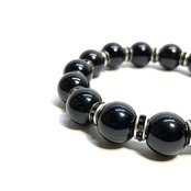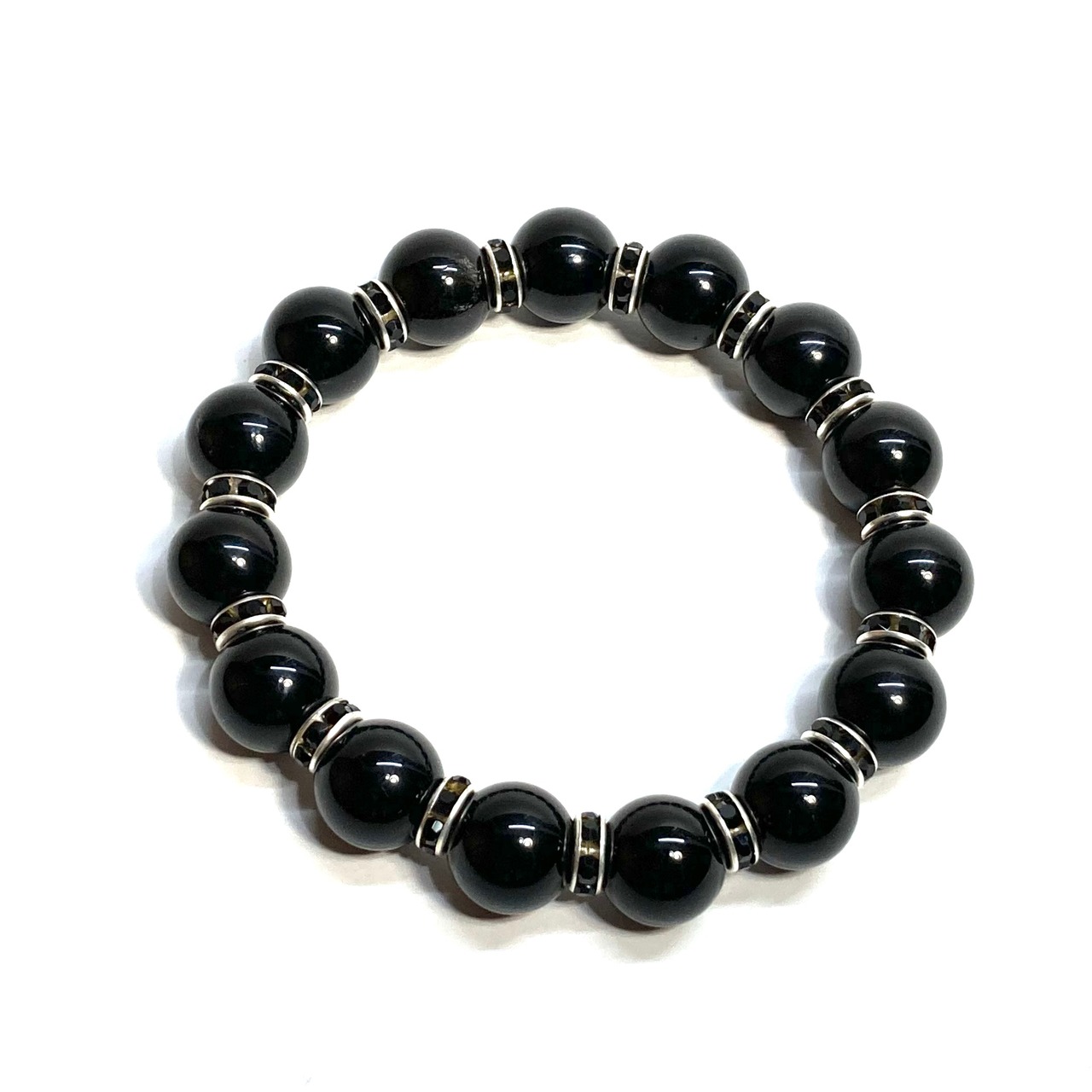 こちらは、12mm玉のモリオンを使用したパワーストーンブレスレットです。間にはロンデルを挟み高級感を演出しております。男女問わずどんなコーディネートとも合わせ易いブレスレットです。サイズは内周約18cmです。数に限りがございますので気になる方はお早めにどうぞ。