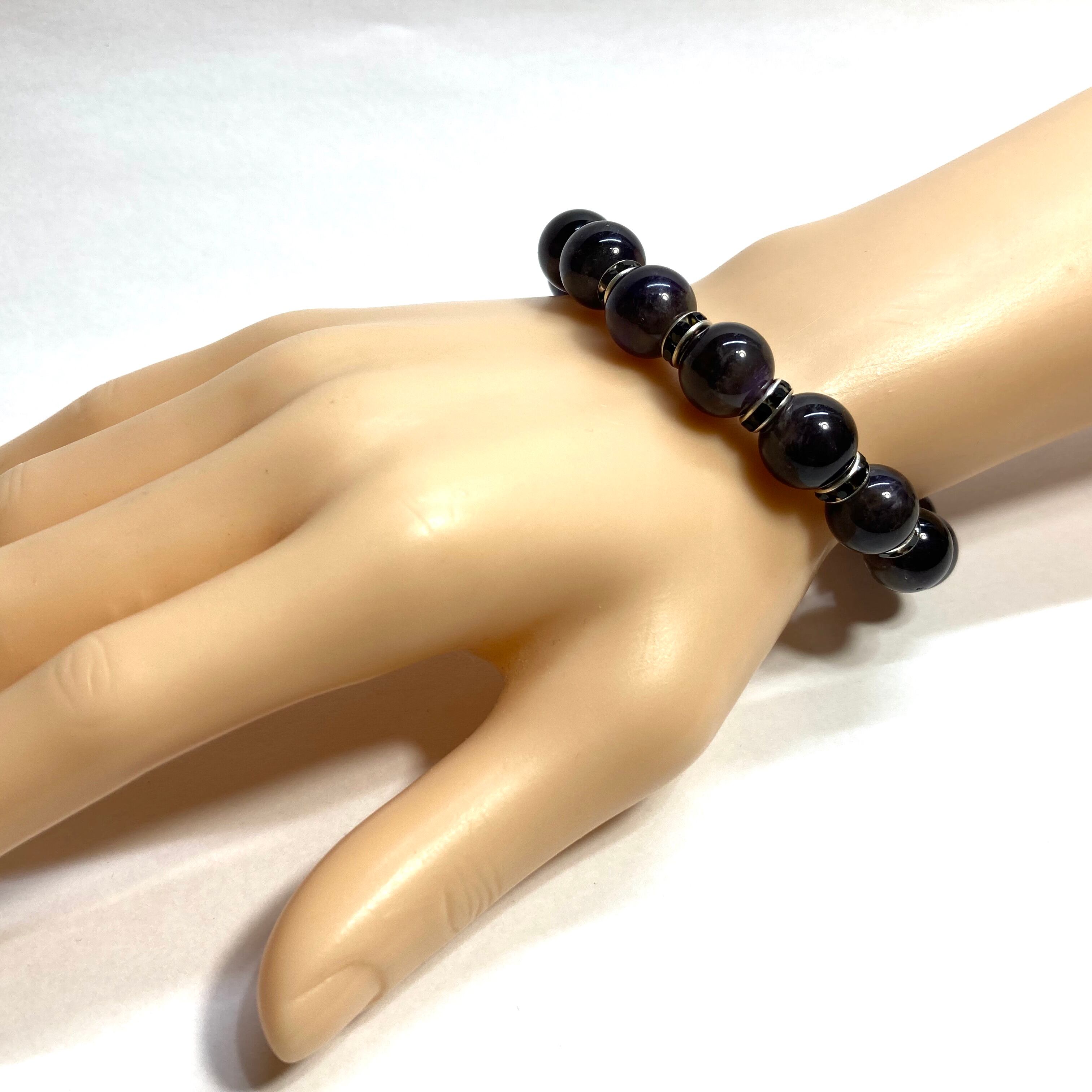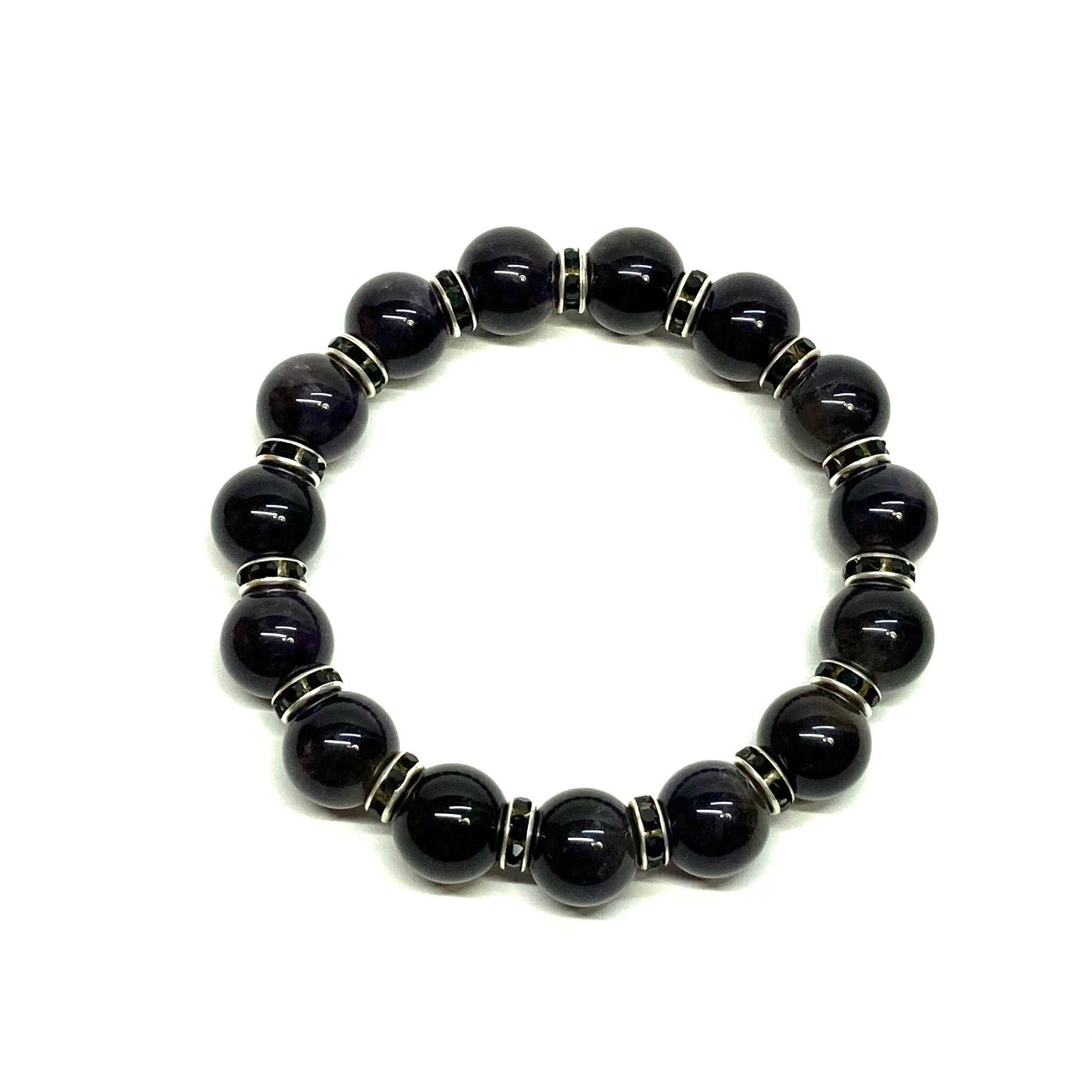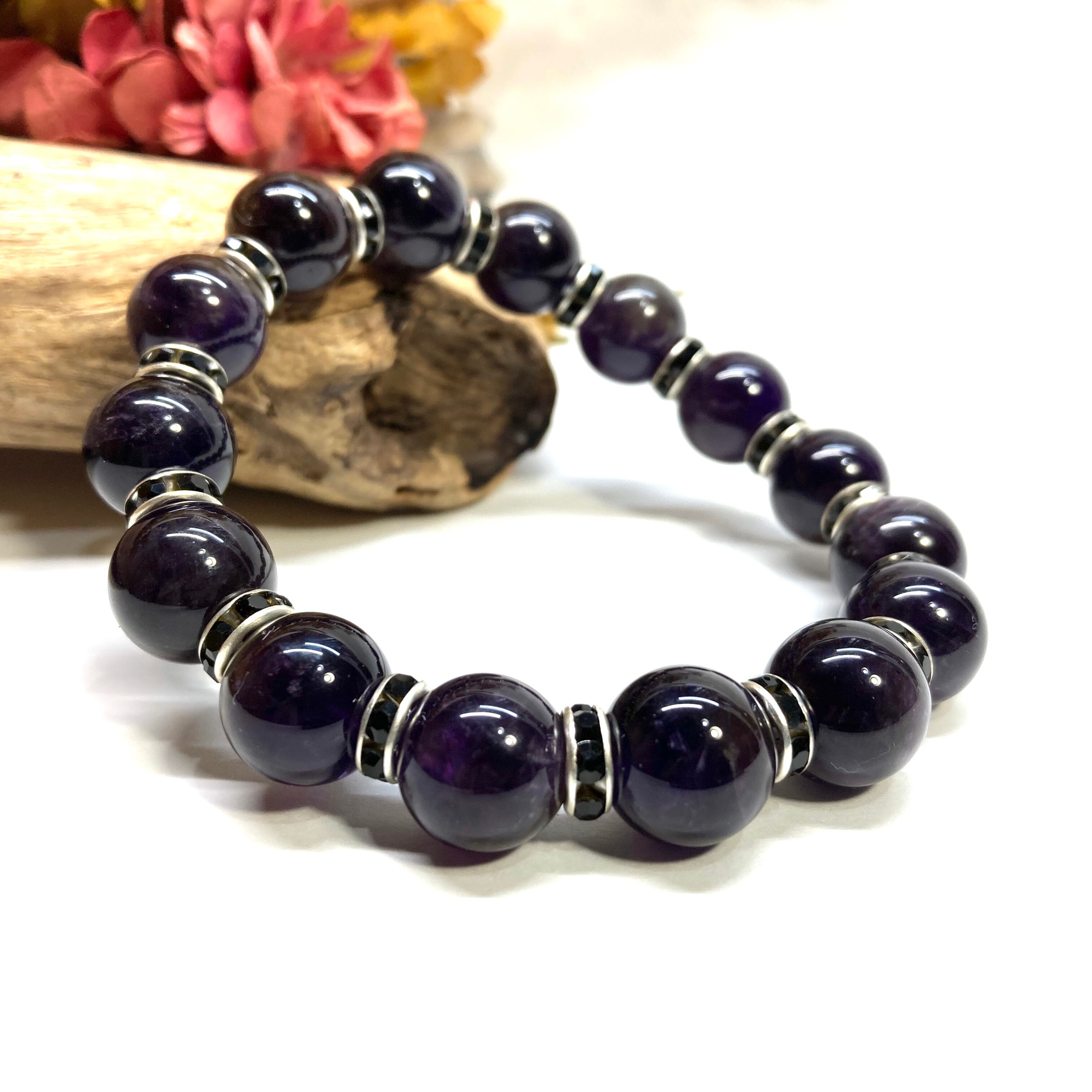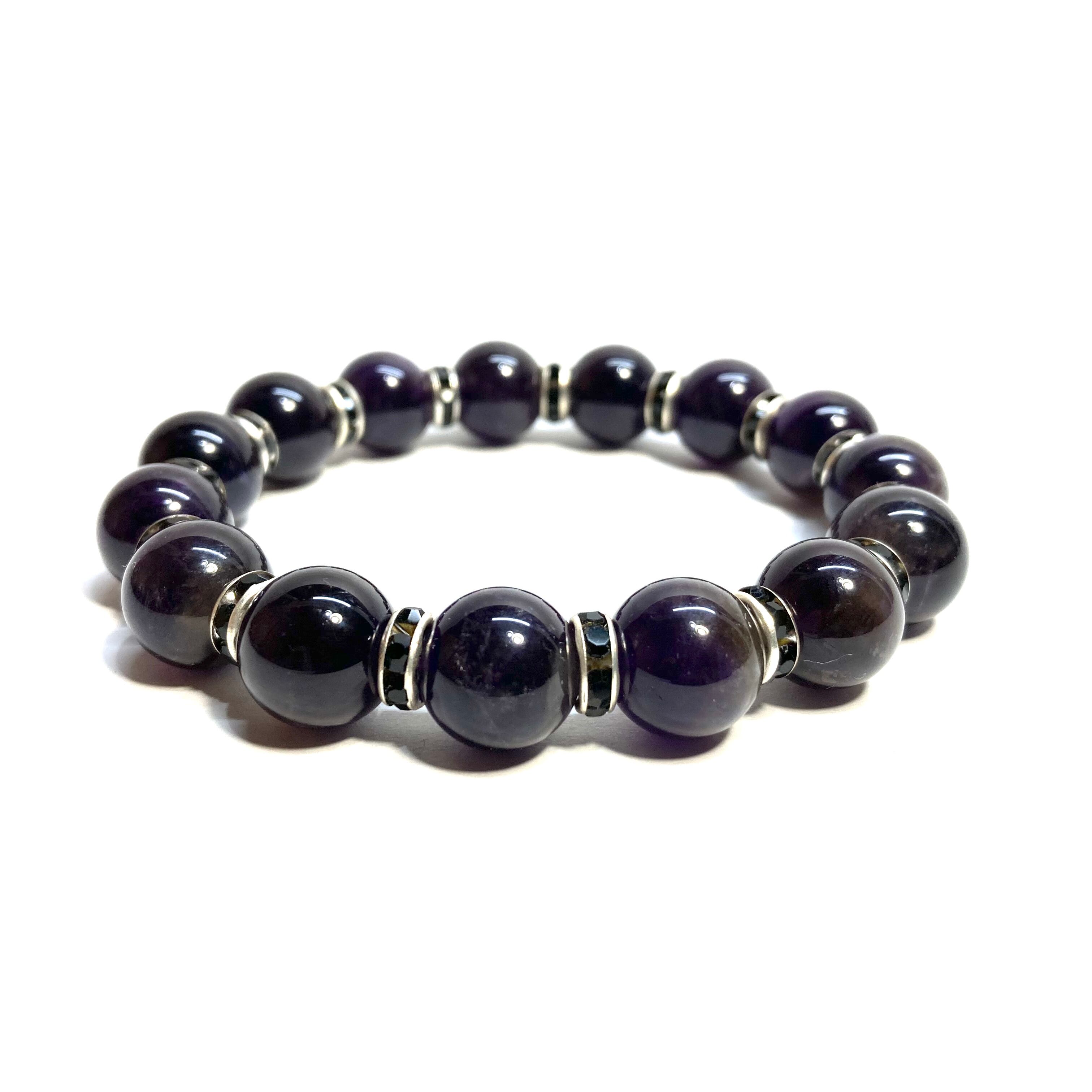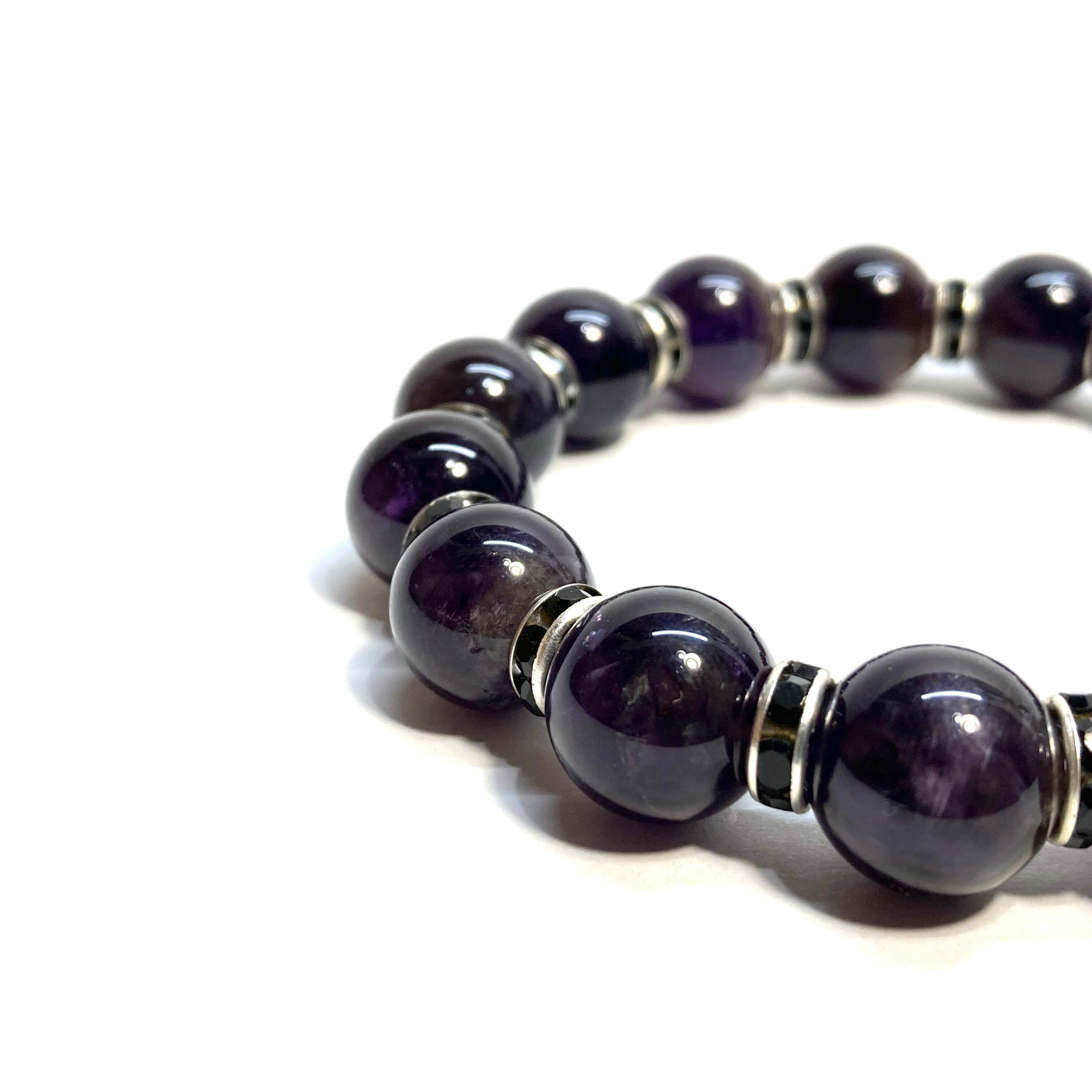 こちらは、12mm玉のアメジストを使用したパワーストーンブレスレットです。間にはロンデルを挟み高級感を演出しております。男女問わずどんなコーディネートとも合わせ易いブレスレットです。サイズは内周約18cmです。 数に限りがございますので気になる方はお早めにどうぞ。