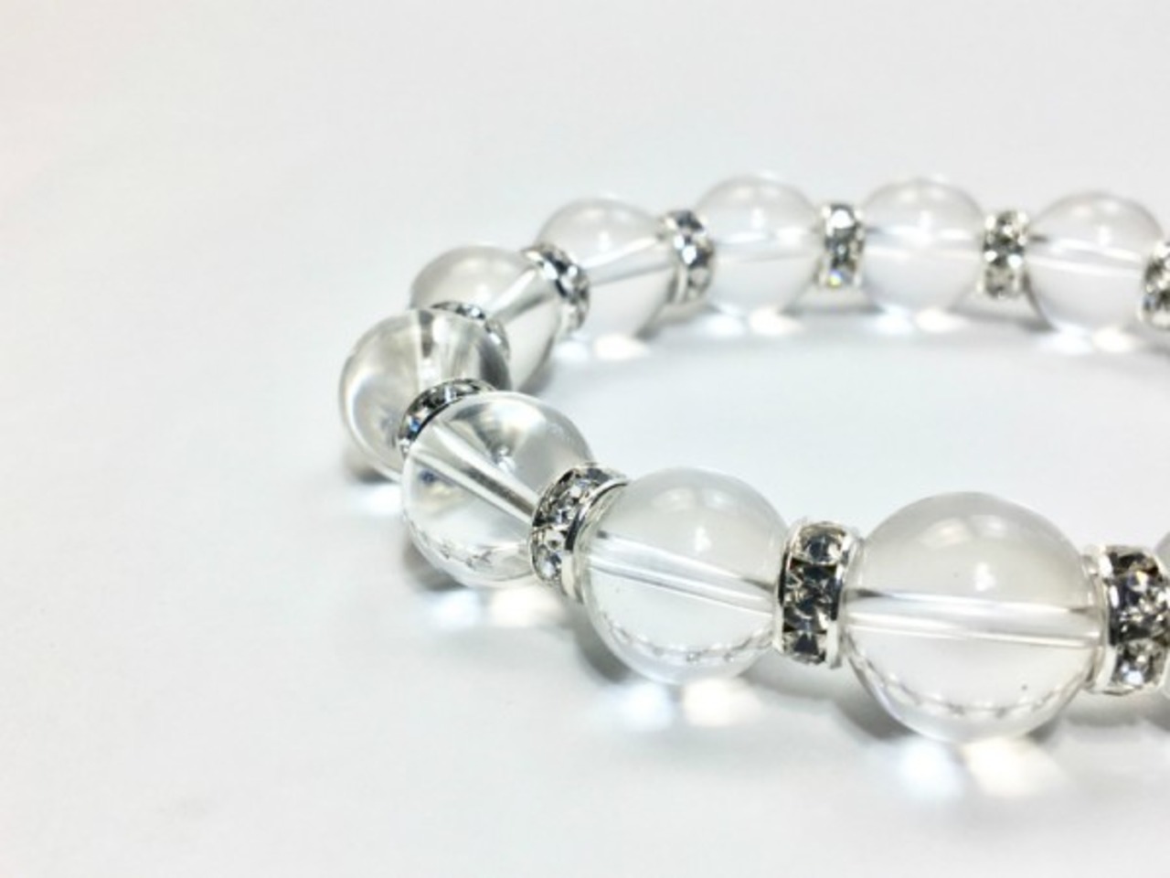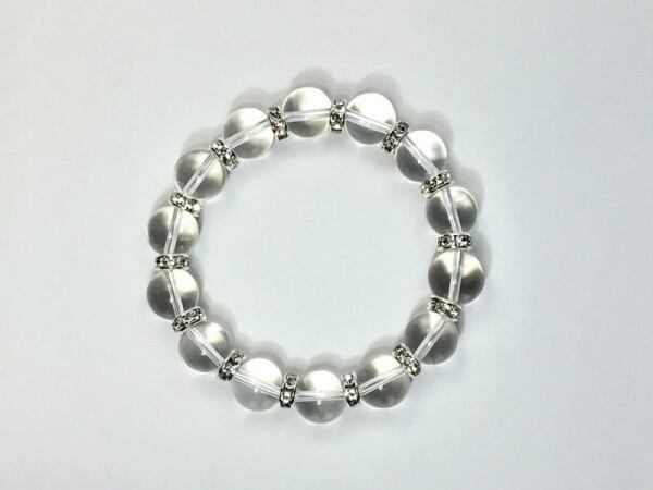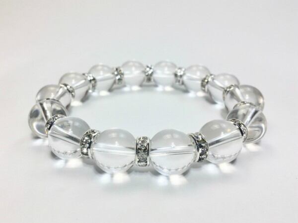 こちらは、12mm玉の水晶を使用した天然石ブレスレットです。石との間にはロンデルを挟み高級感を演出しています。シンプルなデザインですのでどんなコーディネートとも合わせ易いブレスレットです。石大きさは12mm玉です。内周約18cmです。気になる方は是非この機会にどうぞ。