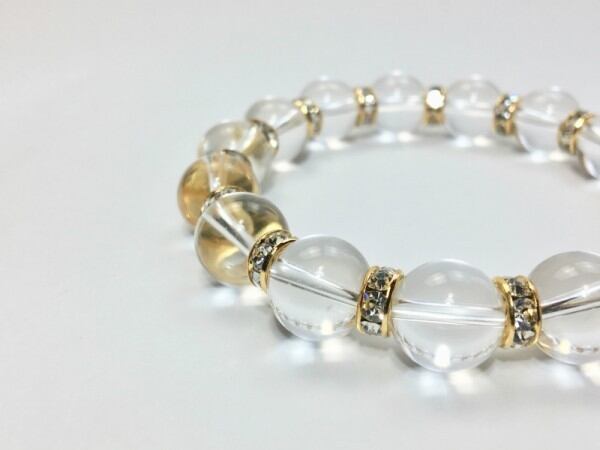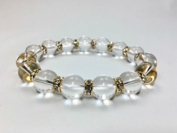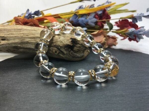 こちらは、12mm玉の水晶を使用した天然石ブレスレットです。石との間にはロンデルを挟み高級感を演出しています。シンプルなデザインですのでどんなコーディネートとも合わせ易いブレスレットです。石大きさは12mm玉です。内周約18cmです。気になる方は是非この機会にどうぞ。