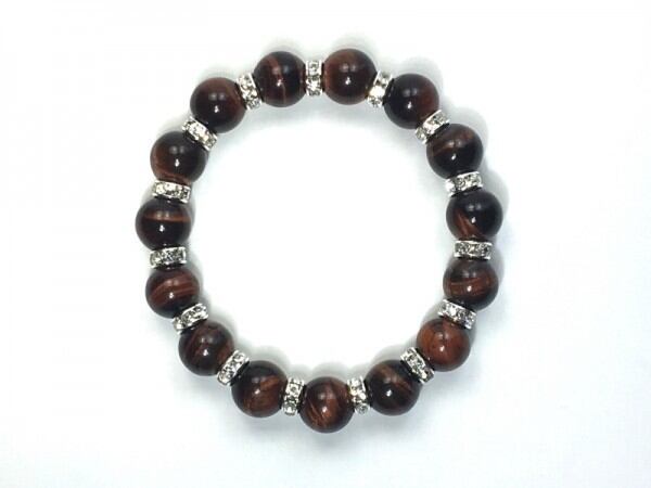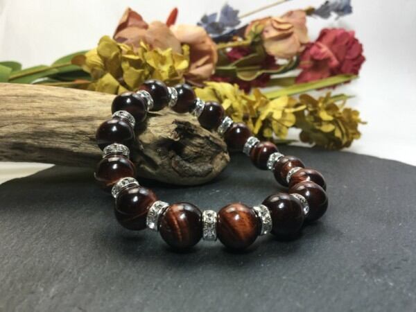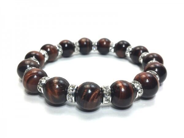 こちらは、12mm玉のレッドタイガーアイを使用した天然石ブレスレットです。石との間にはロンデルを挟み高級感を演出しています。シンプルなデザインですのでどんなコーディネートとも合わせ易いブレスレットです。石大きさは12mm玉です。内周約18cmです。気になる方は是非この機会にどうぞ。