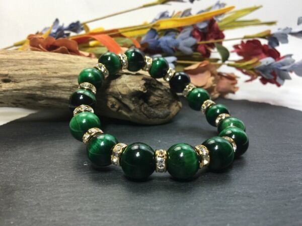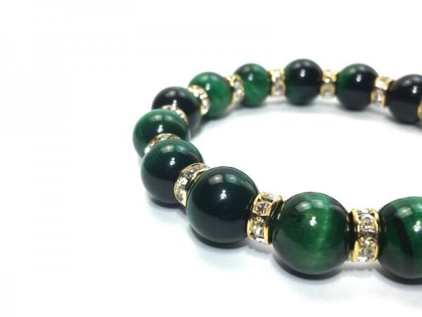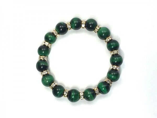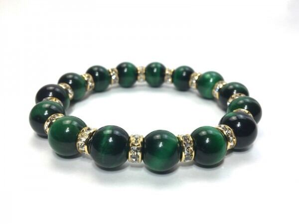 こちらは、12mm玉のグリーンタイガーアイを使用したブレスレットです。石との間にはロンデルを挟み高級感を演出しています。シンプルなデザインですのでどんなコーディネートとも合わせ易いブレスレットです。石大きさは12mm玉です。内周約18cmです。気になる方は是非この機会にどうぞ。