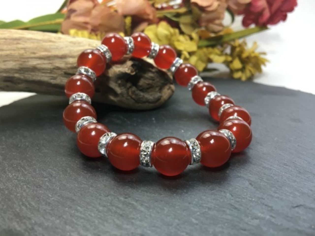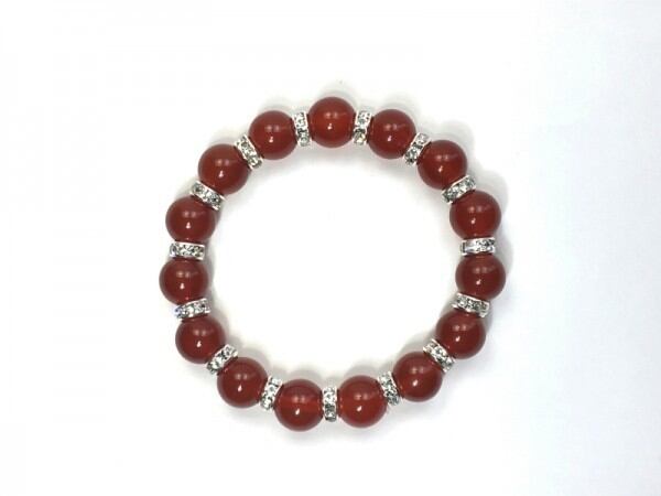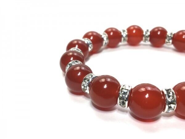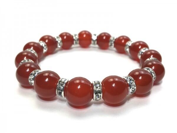 こちらは、12mm玉の赤瑪瑙を使用した天然石ブレスレットです。石との間にはロンデルを挟み高級感を演出しています。シンプルなデザインですのでどんなコーディネートとも合わせ易いブレスレットです。石大きさは12mm玉です。。内周約18cmです。気になる方は是非この機会にどうぞ。