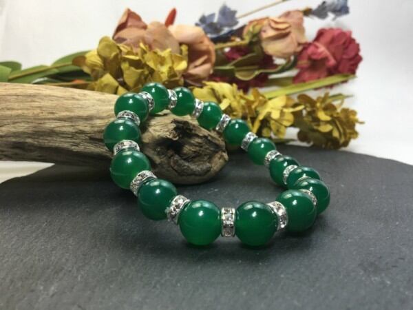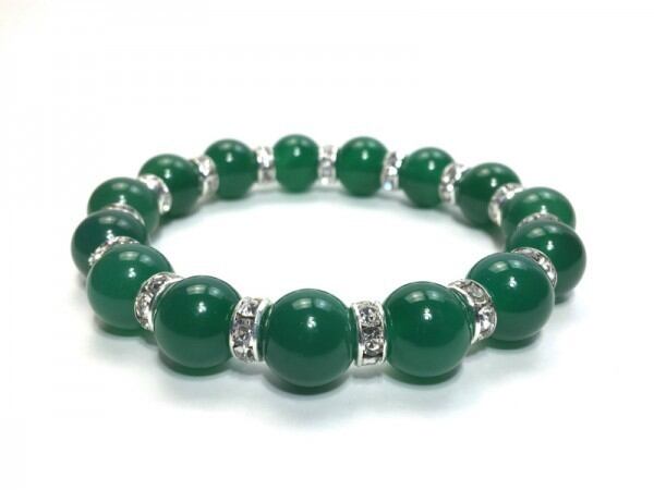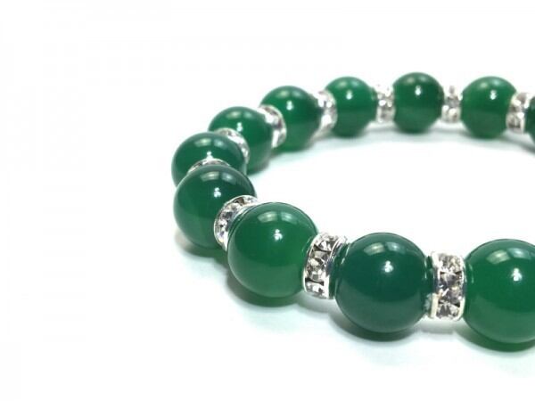こちらは、12mm玉の緑瑪瑙を使用した天然石ブレスレットです。石との間にはロンデルを挟み高級感を演出しています。シンプルなデザインですのでどんなコーディネートとも合わせ易いブレスレットです。石大きさは12mm玉です。。内周約18cmです。気になる方は是非この機会にどうぞ。