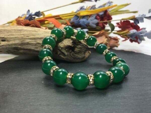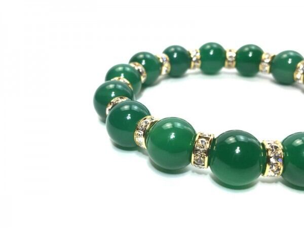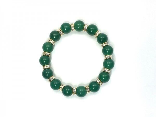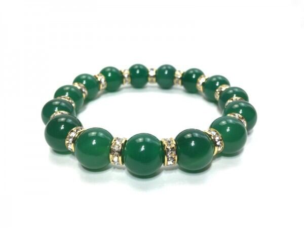 こちらは、12mm玉の緑瑪瑙を使用した天然石ブレスレットです。石との間にはロンデルを挟み高級感を演出しています。シンプルなデザインですのでどんなコーディネートとも合わせ易いブレスレットです。石大きさは12mm玉です。。内周約18cmです。気になる方は是非この機会にどうぞ。