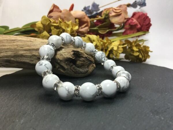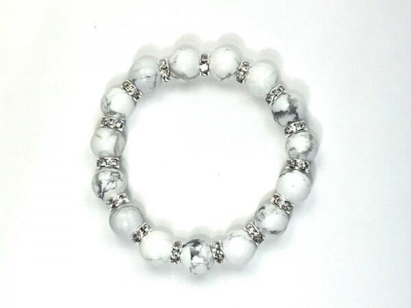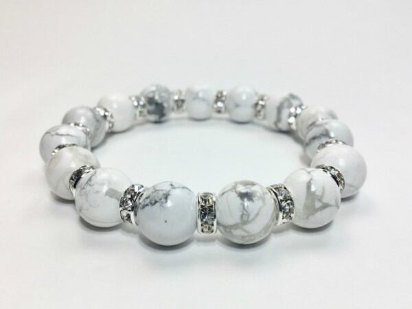 こちらは、12mm玉のハウライトを使用した天然石ブレスレットです。石との間にはロンデルを挟み高級感を演出しています。シンプルなデザインですのでどんなコーディネートとも合わせ易いブレスレットです。石大きさは12mm玉です。内周約18cmです。気になる方は是非この機会にどうぞ。