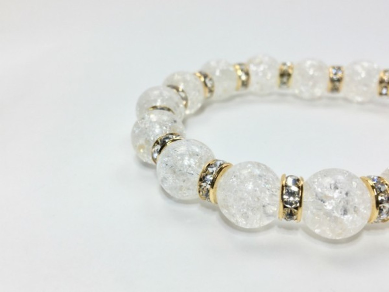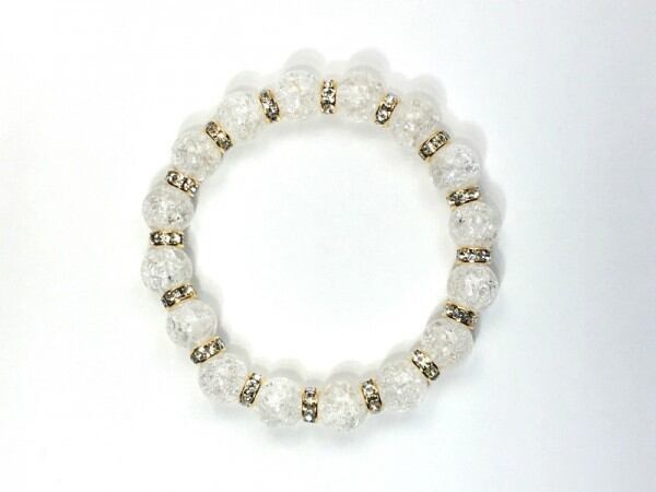 こちらは、12mm玉のクラック水晶を使用した天然石ブレスレットです。石との間にはロンデルを挟み高級感を演出しています。シンプルなデザインですのでどんなコーディネートとも合わせ易いブレスレットです。石大きさは12mm玉です。内周約18cmです。気になる方は是非この機会にどうぞ。