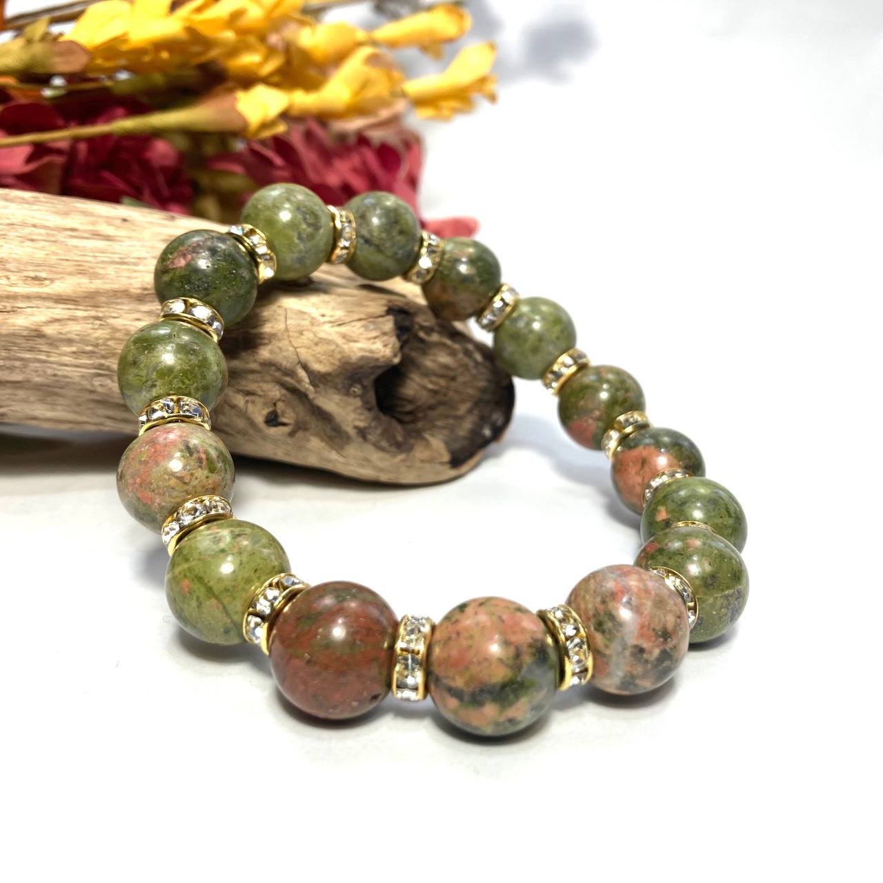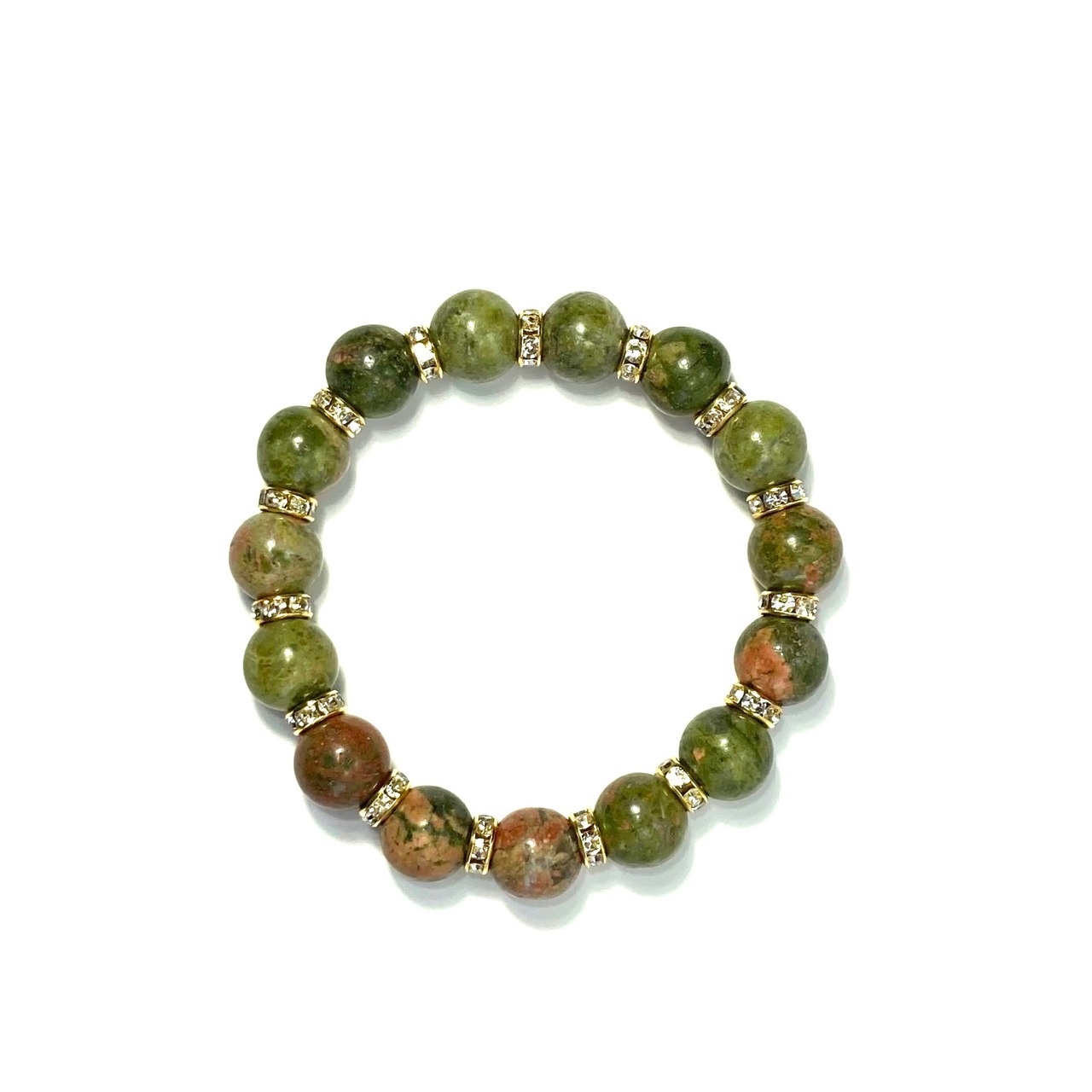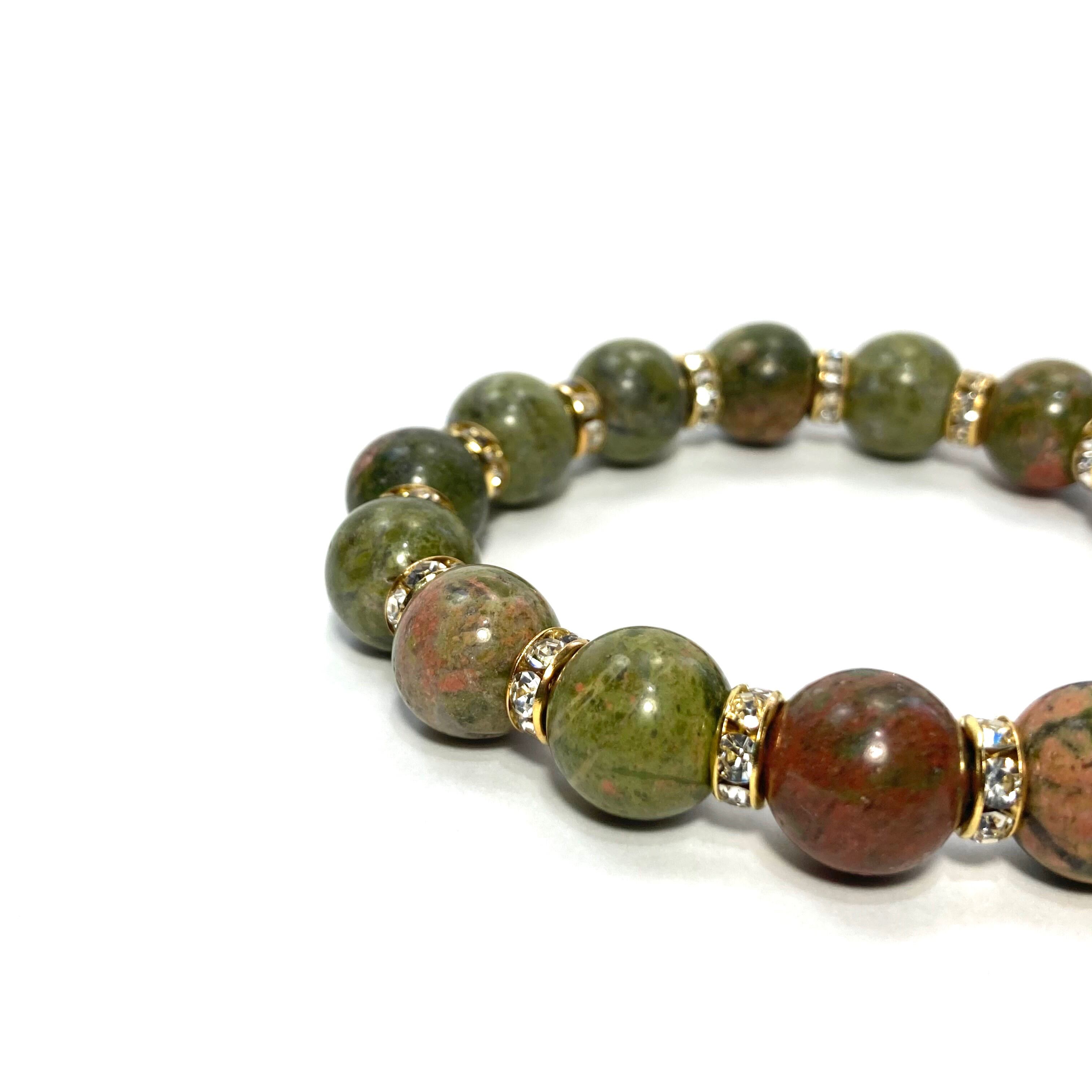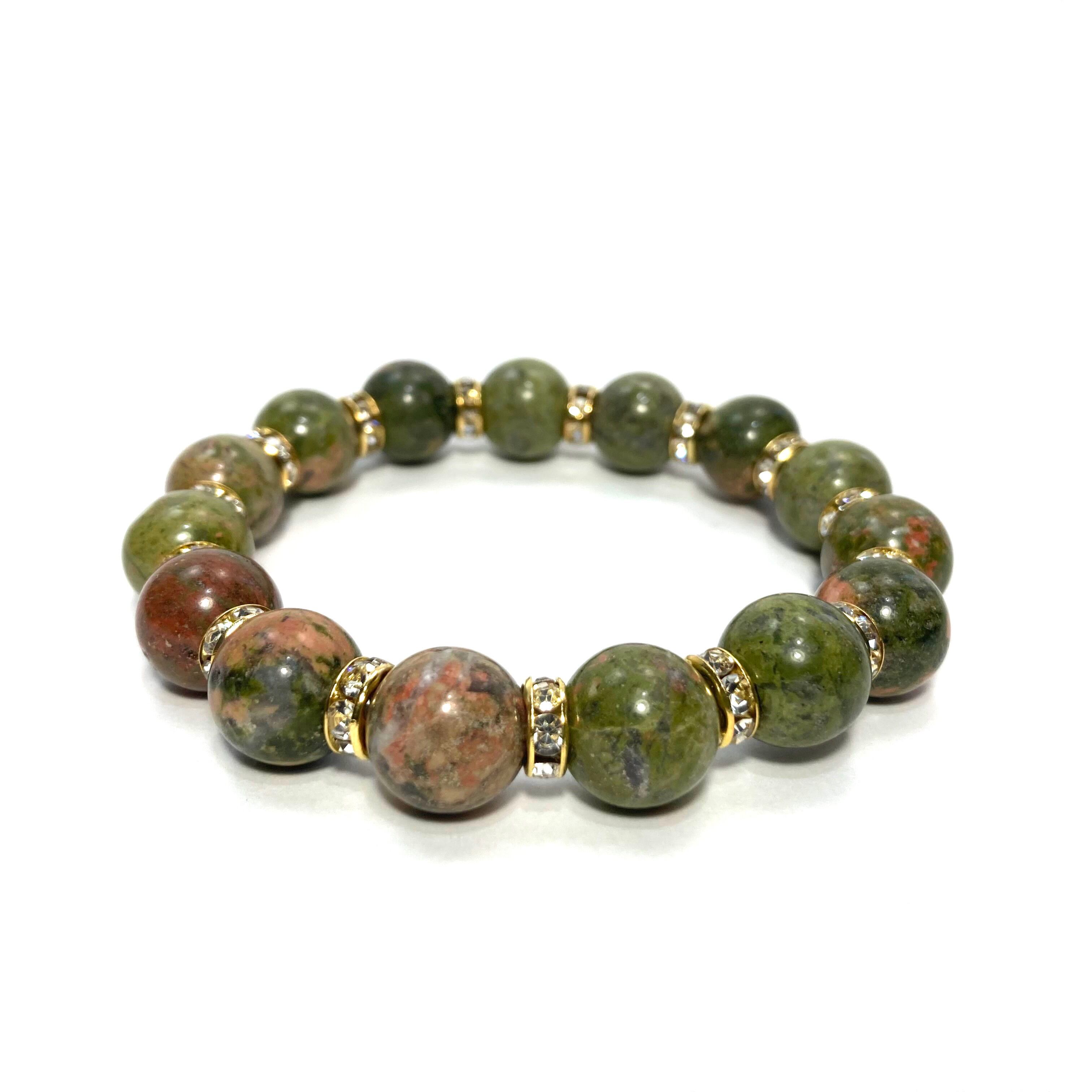 こちらは、12mm玉のユナカイトを使用した天然石ブレスレットです。石との間にはロンデルを挟み高級感を演出しています。シンプルなデザインですのでどんなコーディネートとも合わせ易いブレスレットです。石大きさは12mm玉です。内周約18cmです。気になる方は是非この機会にどうぞ。