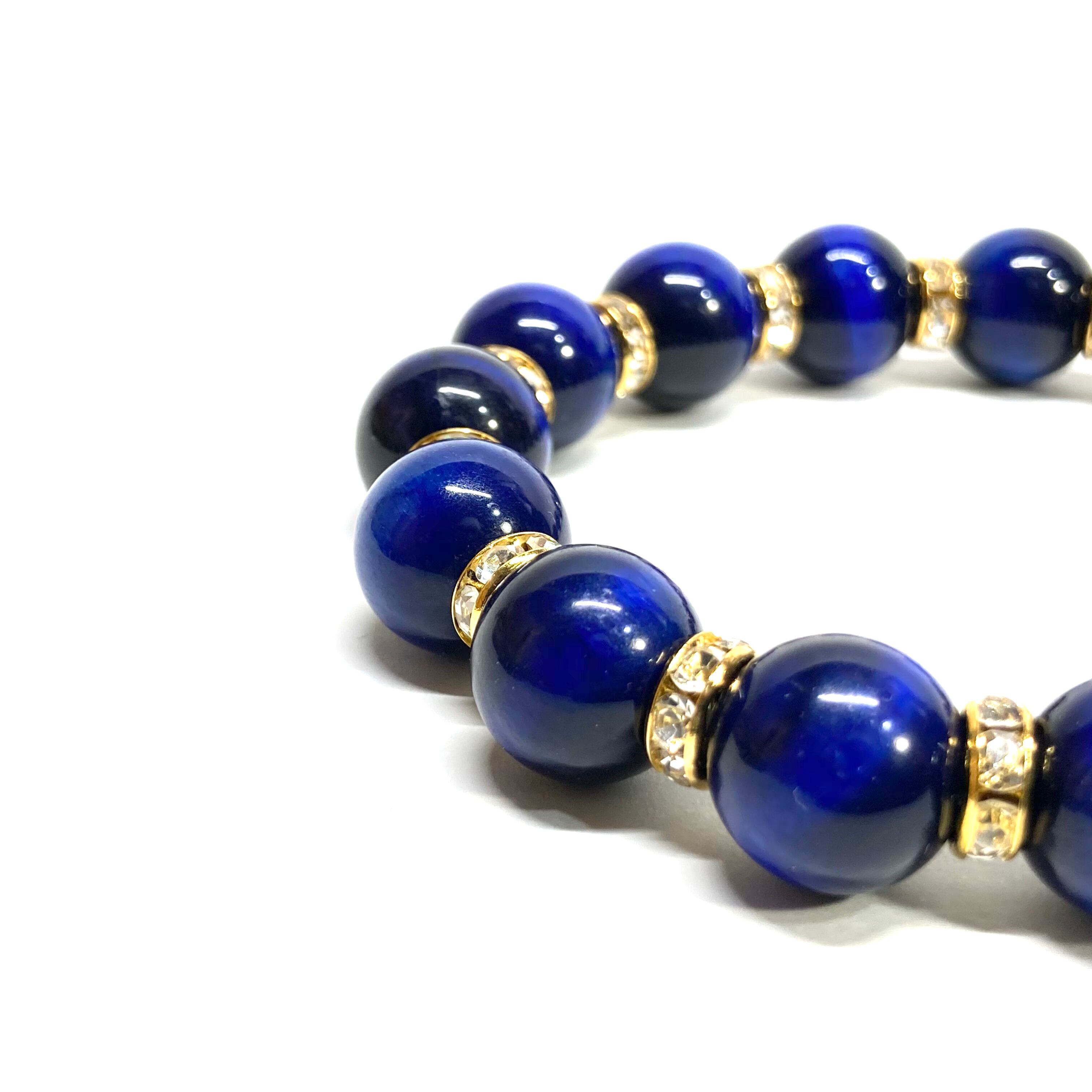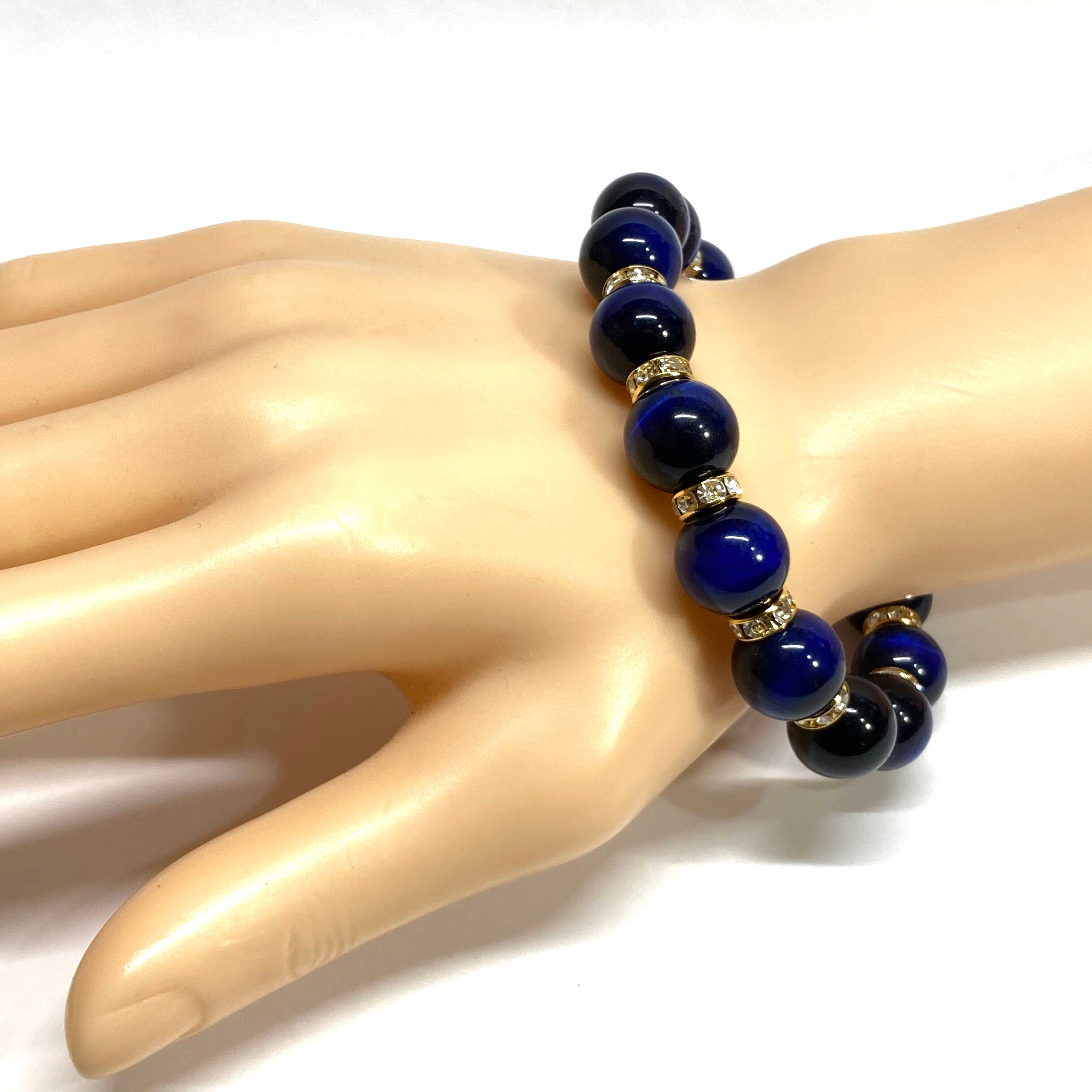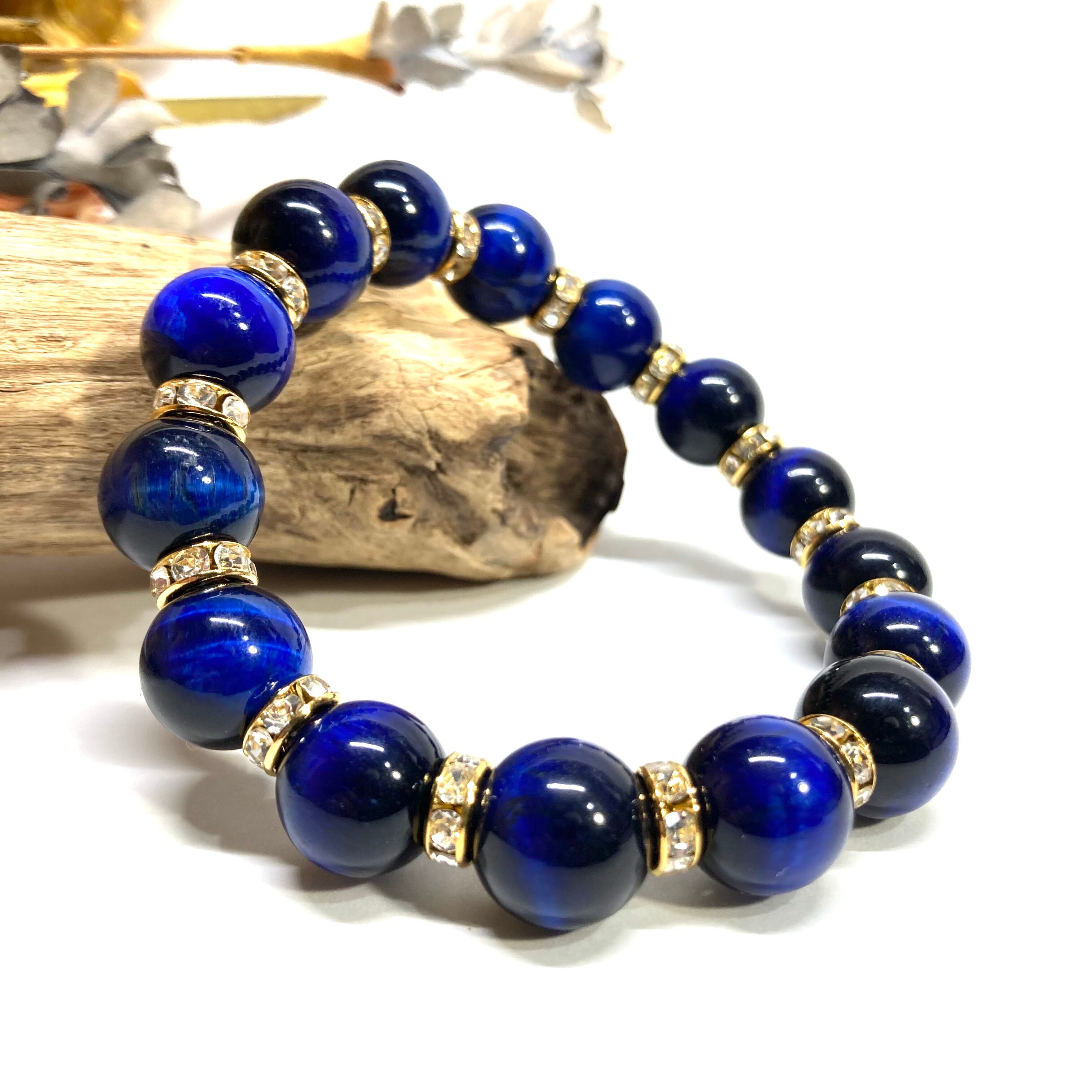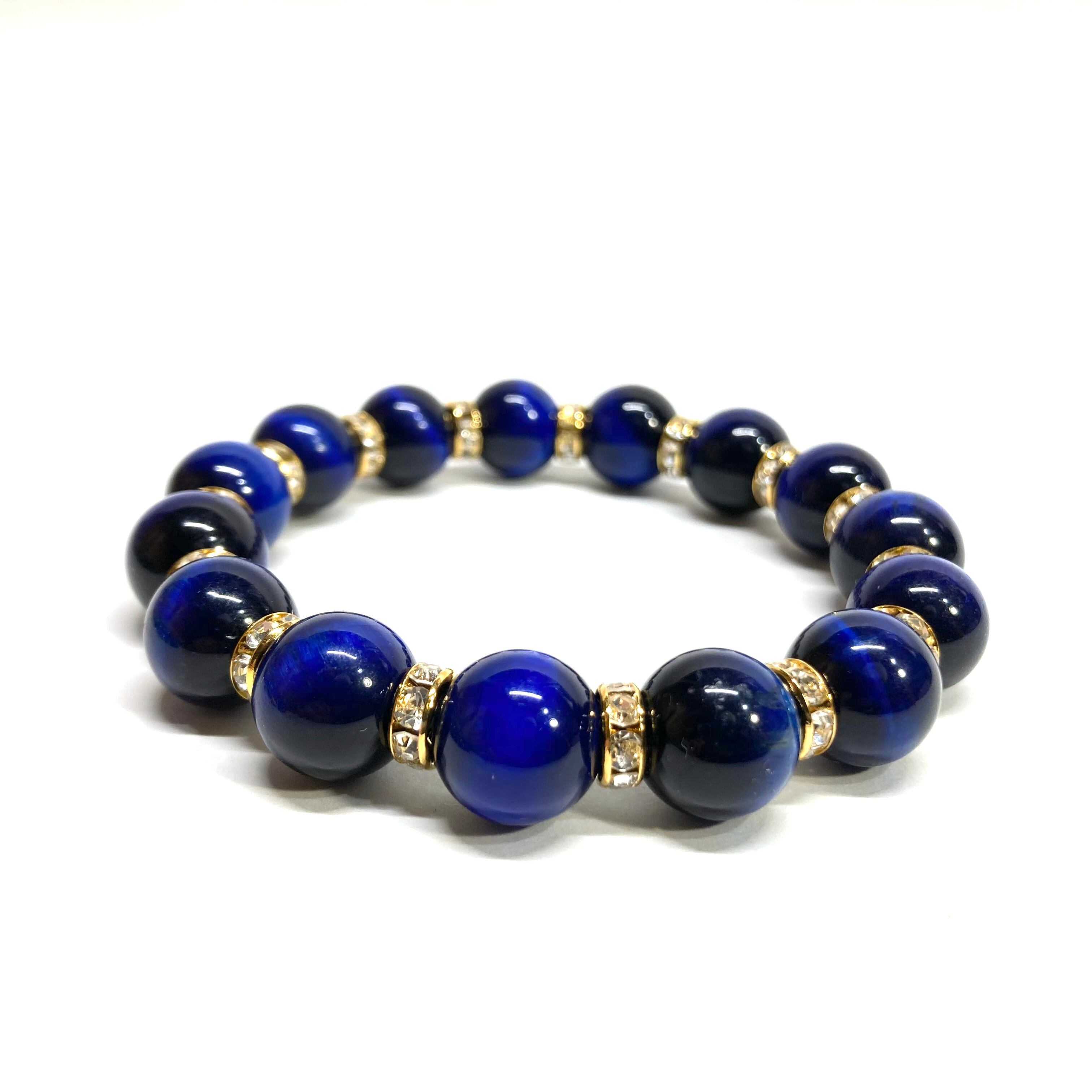 こちらは、12mm玉のブルータイガーアイを使用したブレスレットです。石との間にはロンデルを挟み高級感を演出しています。シンプルなデザインですのでどんなコーディネートとも合わせ易いブレスレットです。石大きさは12mm玉です。内周約18cmです。数に限りがございますので気になる方はお早めにどうぞ。