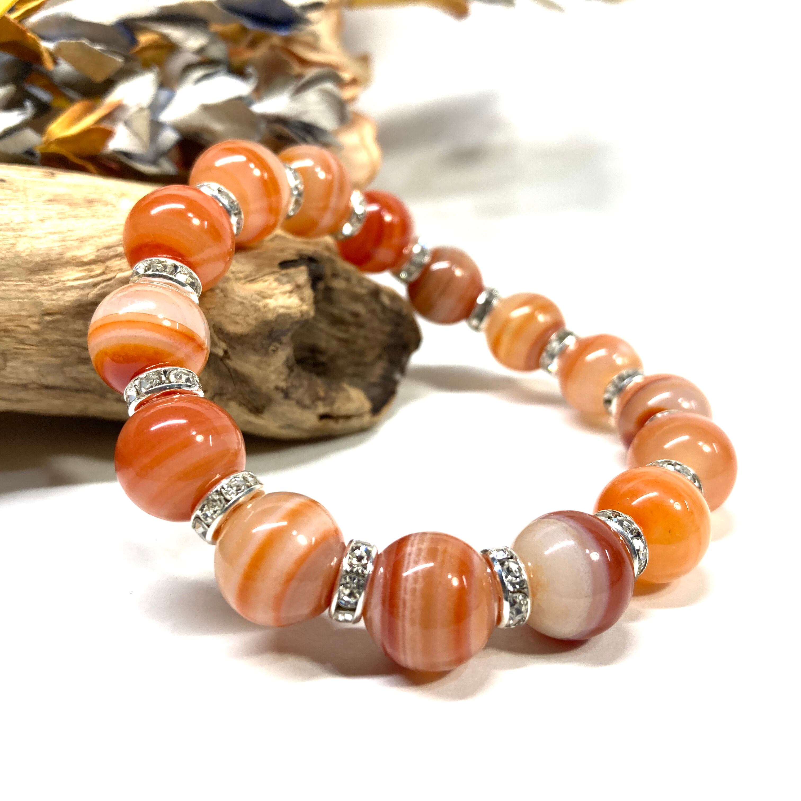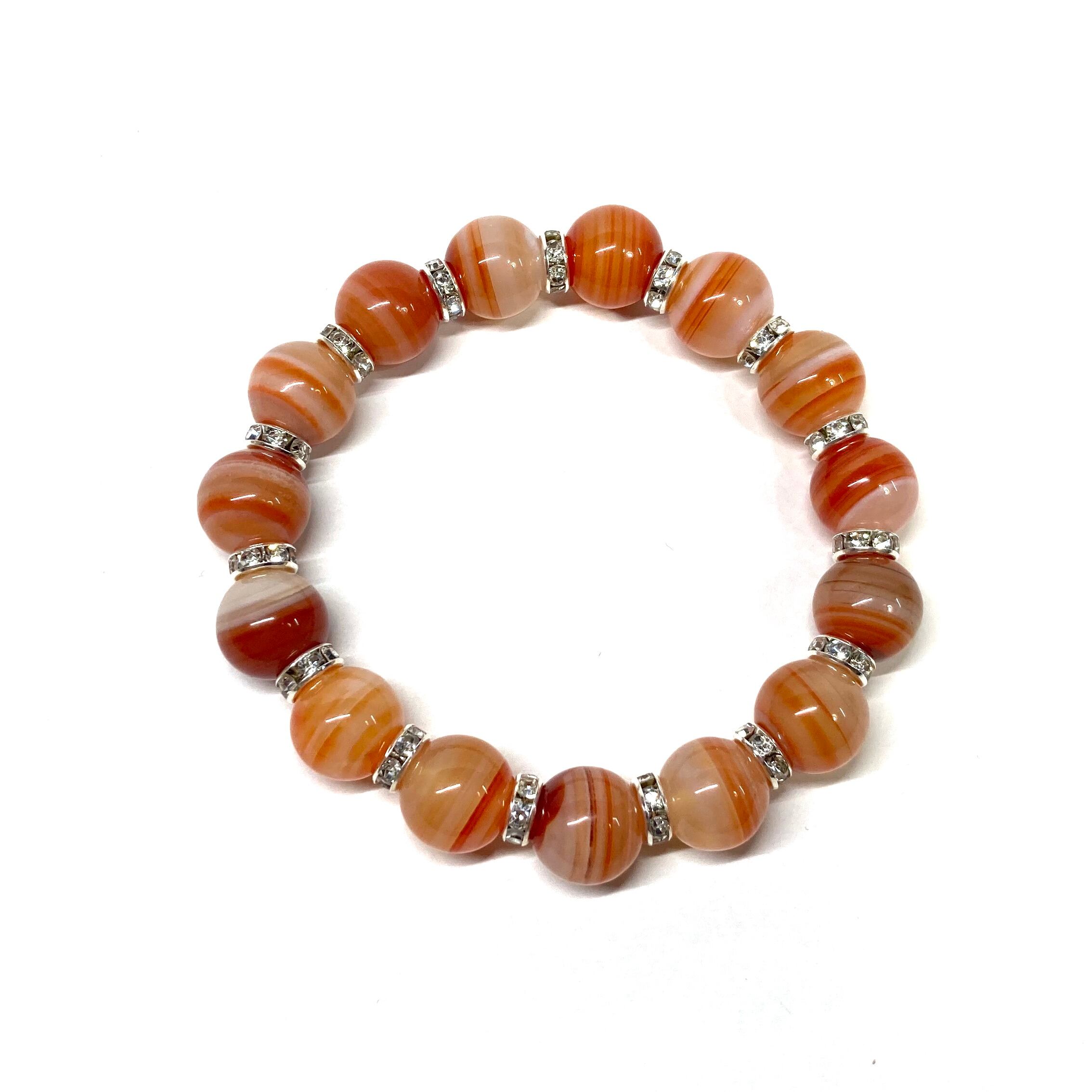 こちらは、12mm玉のカーネリアン・サードニクス(サードオニキス) を使用したパワーストーンブレスレットです。間にはロンデルを挟み高級感を演出しております。男女問わずどんなコーディネートとも合わせ易いブレスレットです。サイズは内周約18cmです。 数に限りがございますので気になる方はお早めにどうぞ。