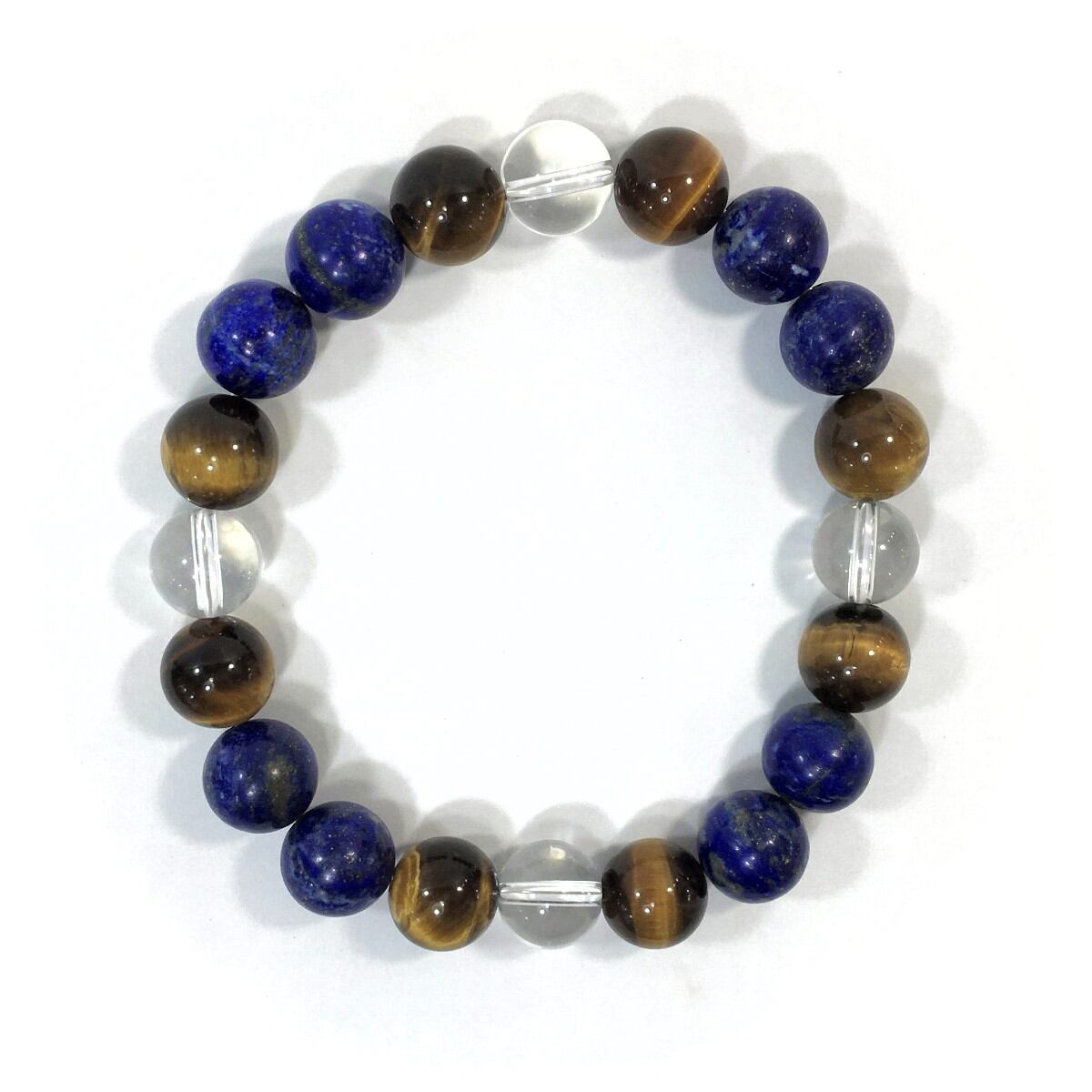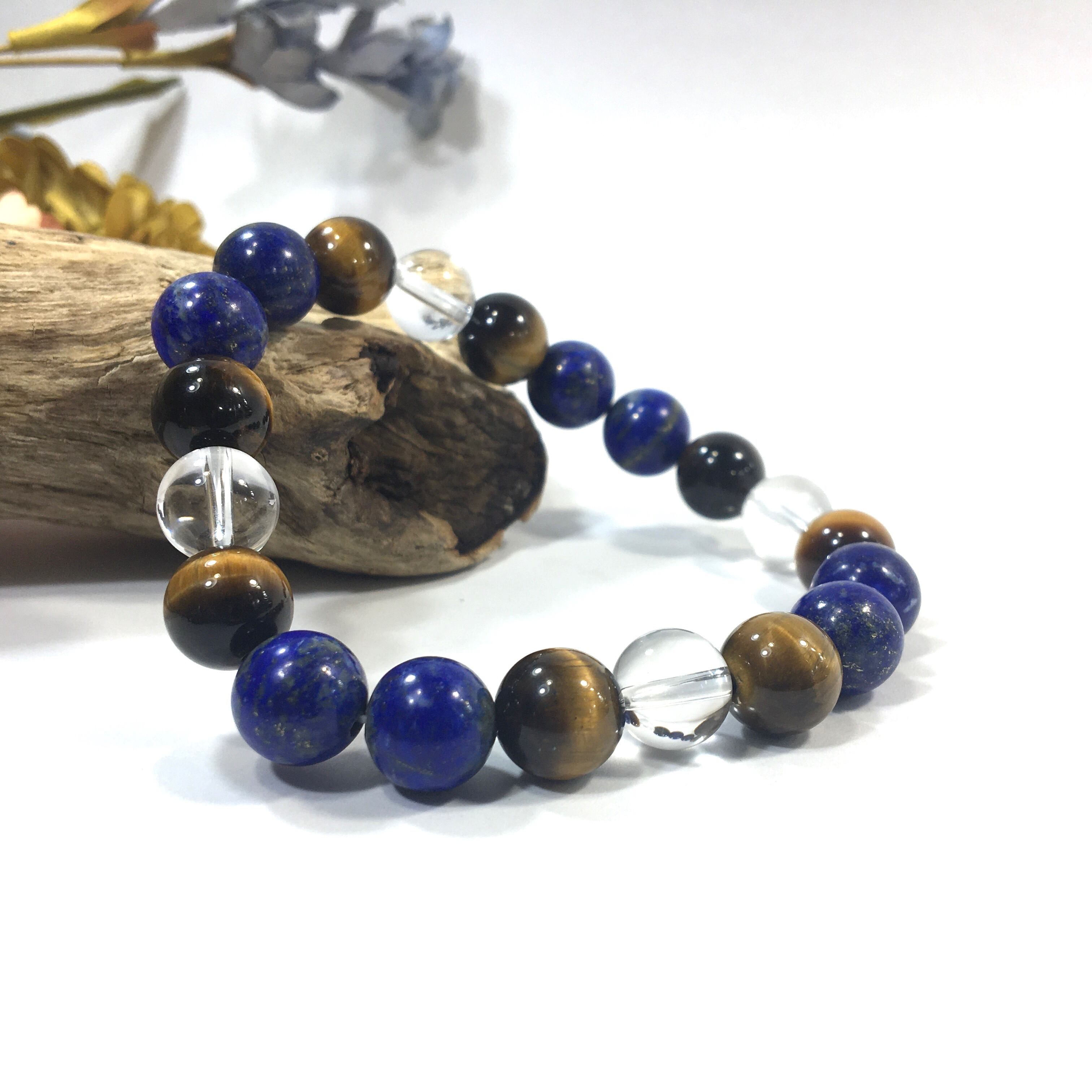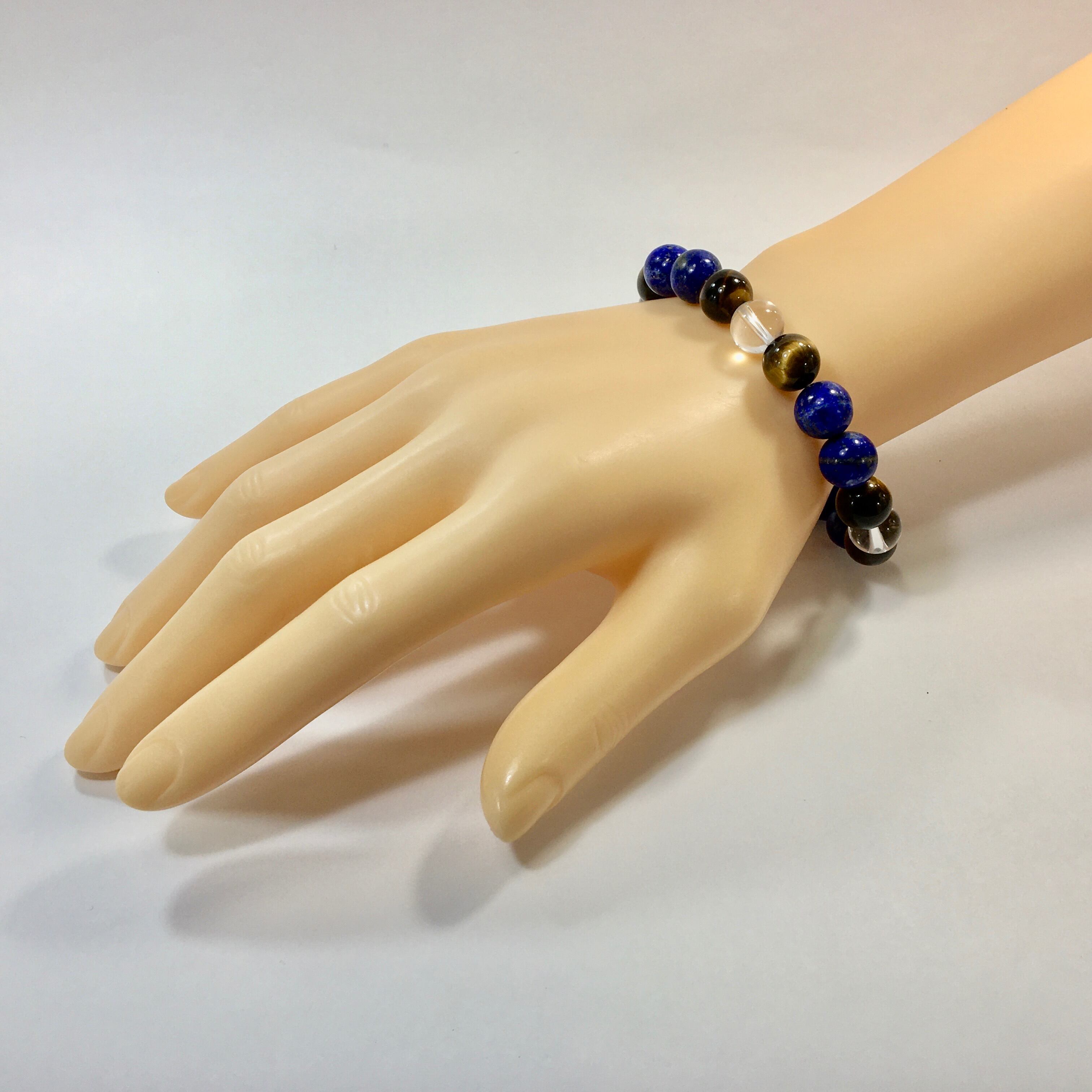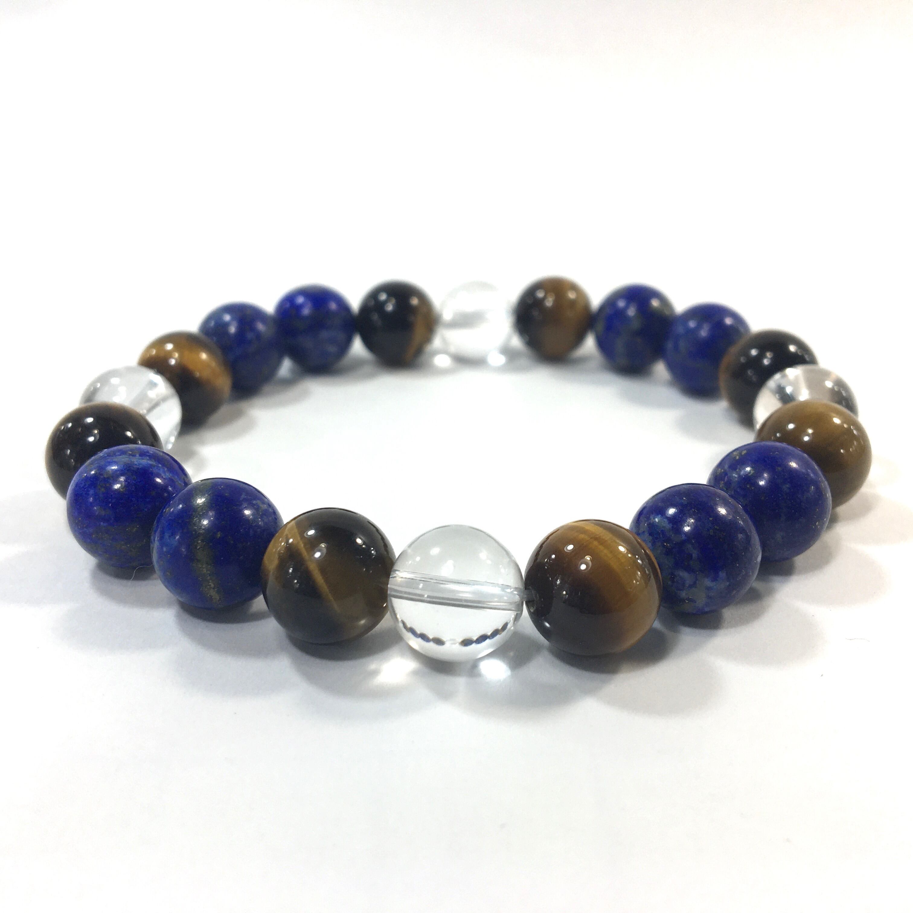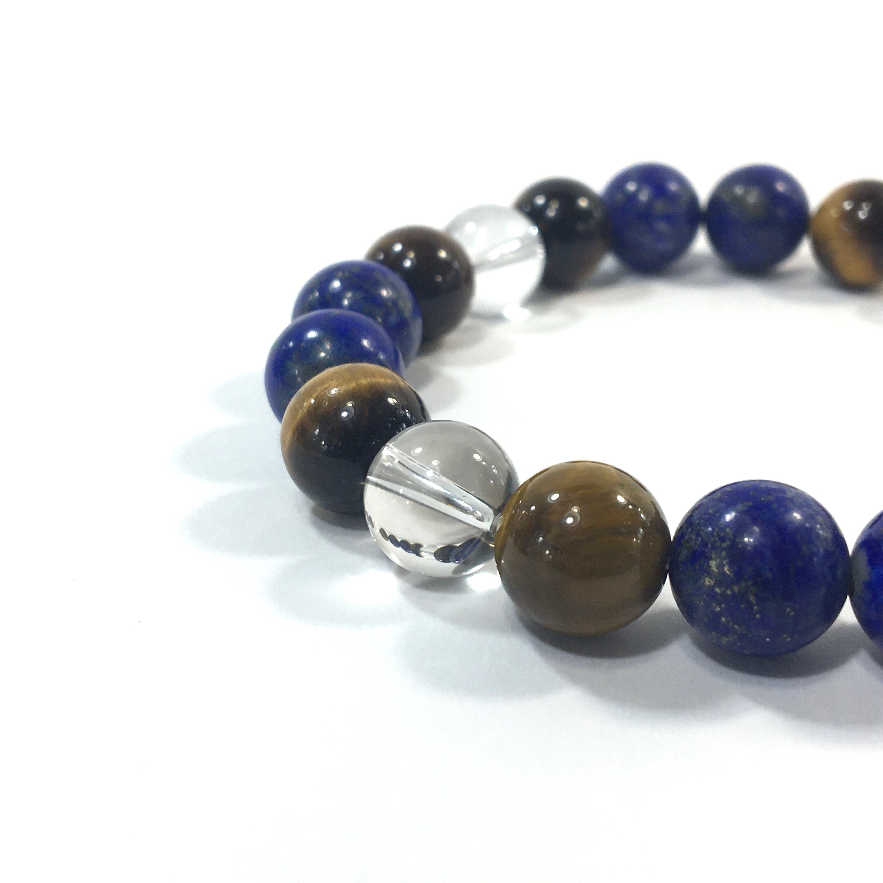 こちらは、水晶とタイガーアイとラピスラズリ使用したパワーストーンブレスレットです。今回はパーツは使わずシンプルに石のみでデザインしてあります。パーツを使っていないので金属アレルギーの方などにもオススメできるブレスレットです。石の大きさは全て10mm玉を使用して内径約17cmです。数に限りがございますので気になる方はお早めにどうぞ。
