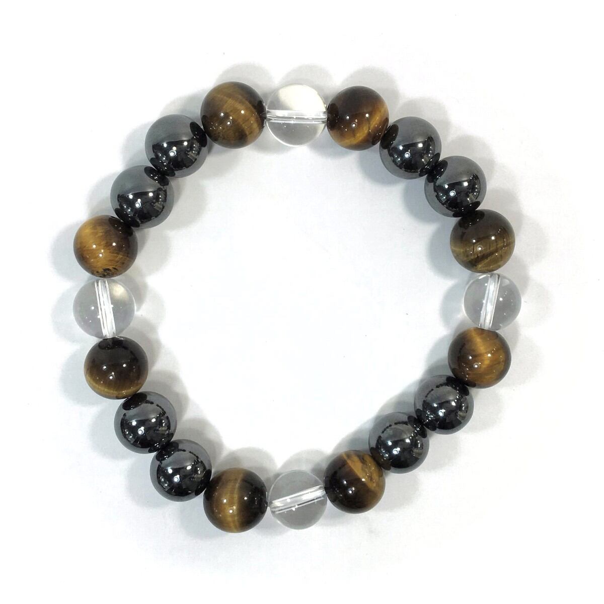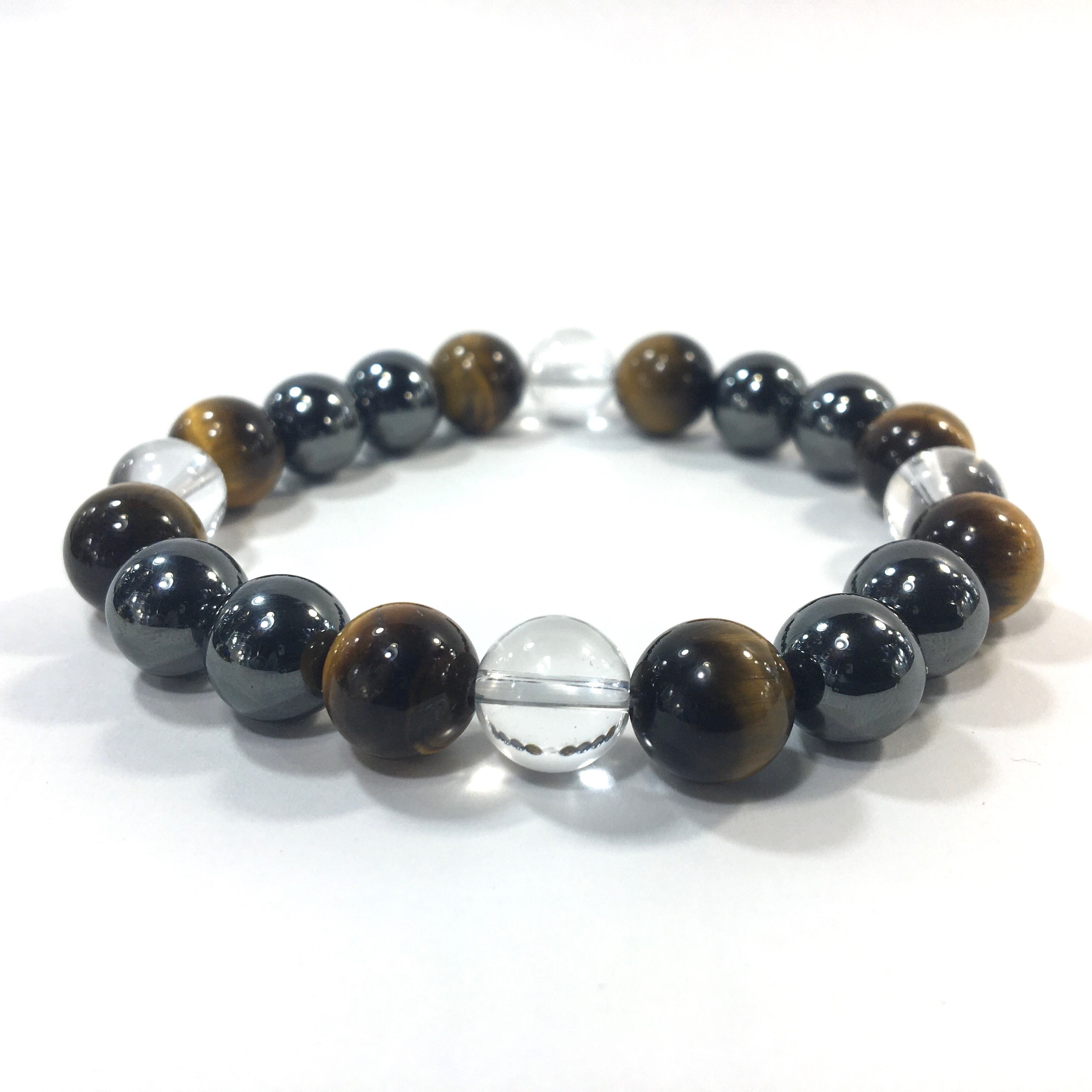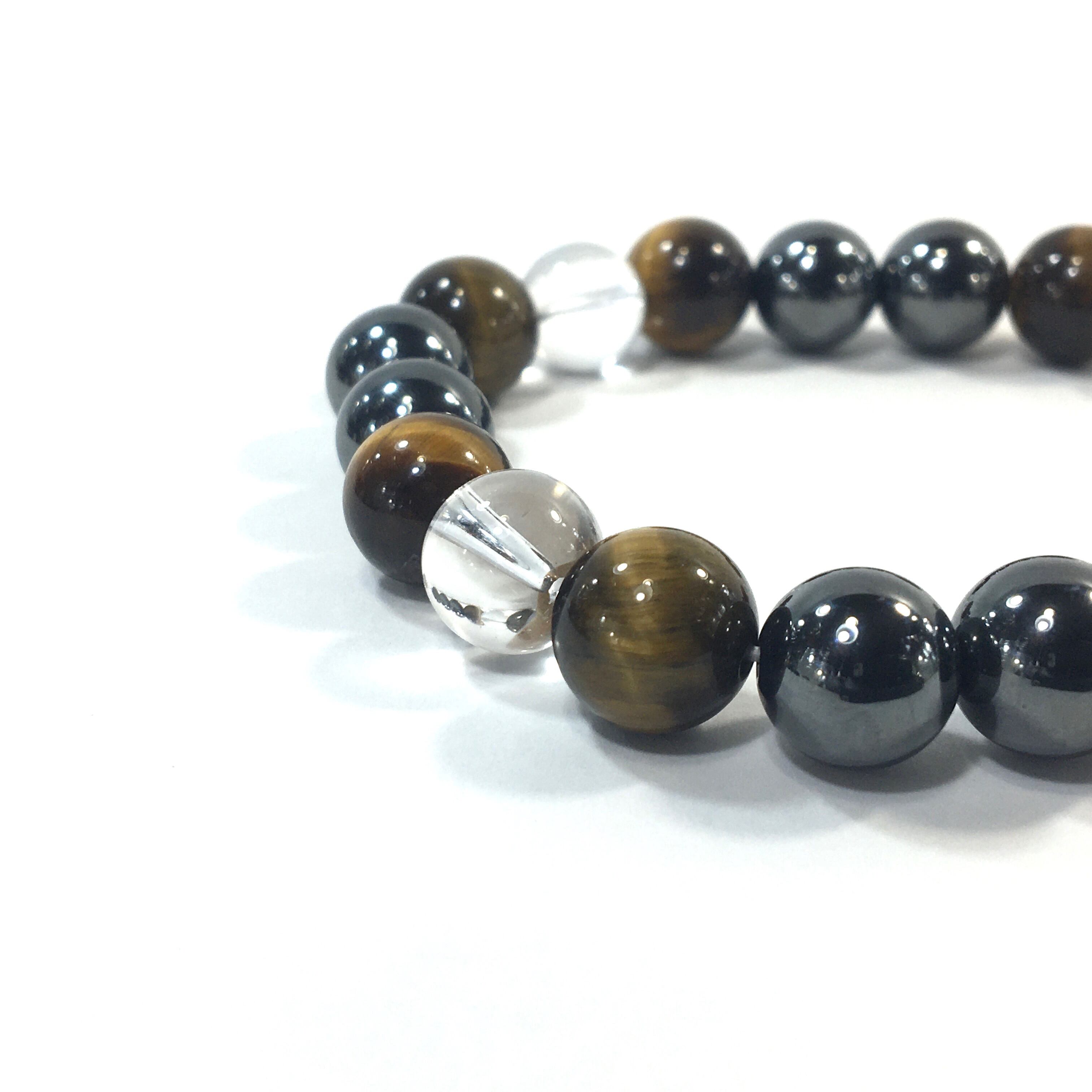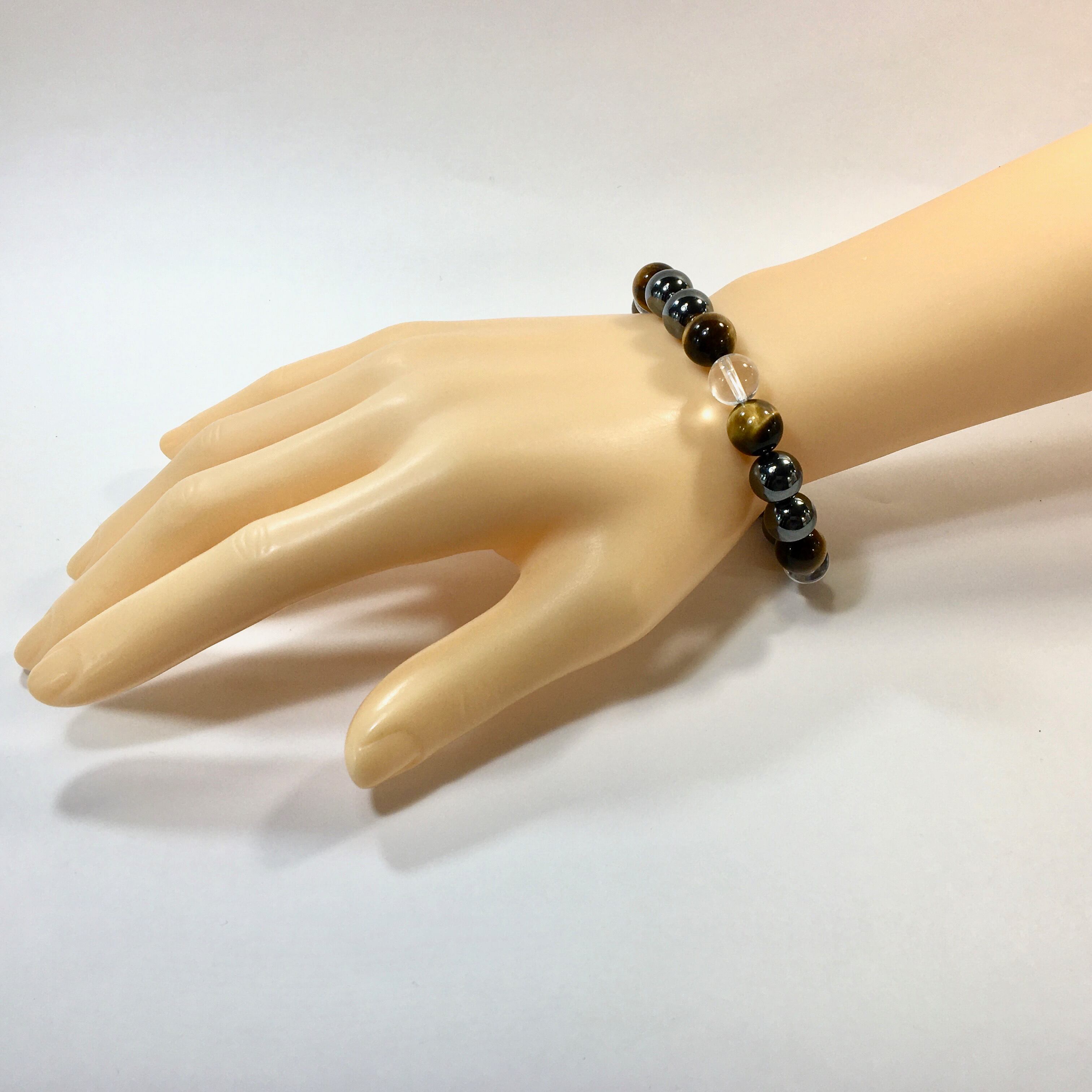 こちらは、水晶とタイガーアイとヘマタイト使用したパワーストーンブレスレットです。今回はパーツは使わずシンプルに石のみでデザインしてあります。パーツを使っていないので金属アレルギーの方などにもオススメできるブレスレットです。石の大きさは全て10mm玉を使用して内径約17cmです。数に限りがございますので気になる方はお早めにどうぞ。