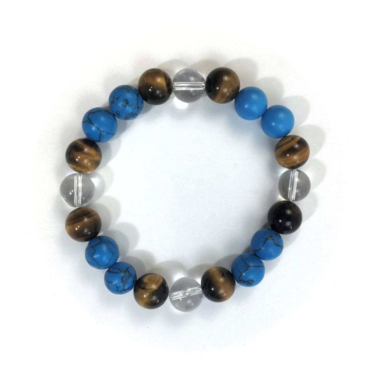 こちらは、水晶とタイガーアイとターコイズ使用したパワーストーンブレスレットです。今回はパーツは使わずシンプルに石のみでデザインしてあります。パーツを使っていないので金属アレルギーの方などにもオススメできるブレスレットです。石の大きさは全て10mm玉を使用して内径約17cmです。数に限りがございますので気になる方はお早めにどうぞ。