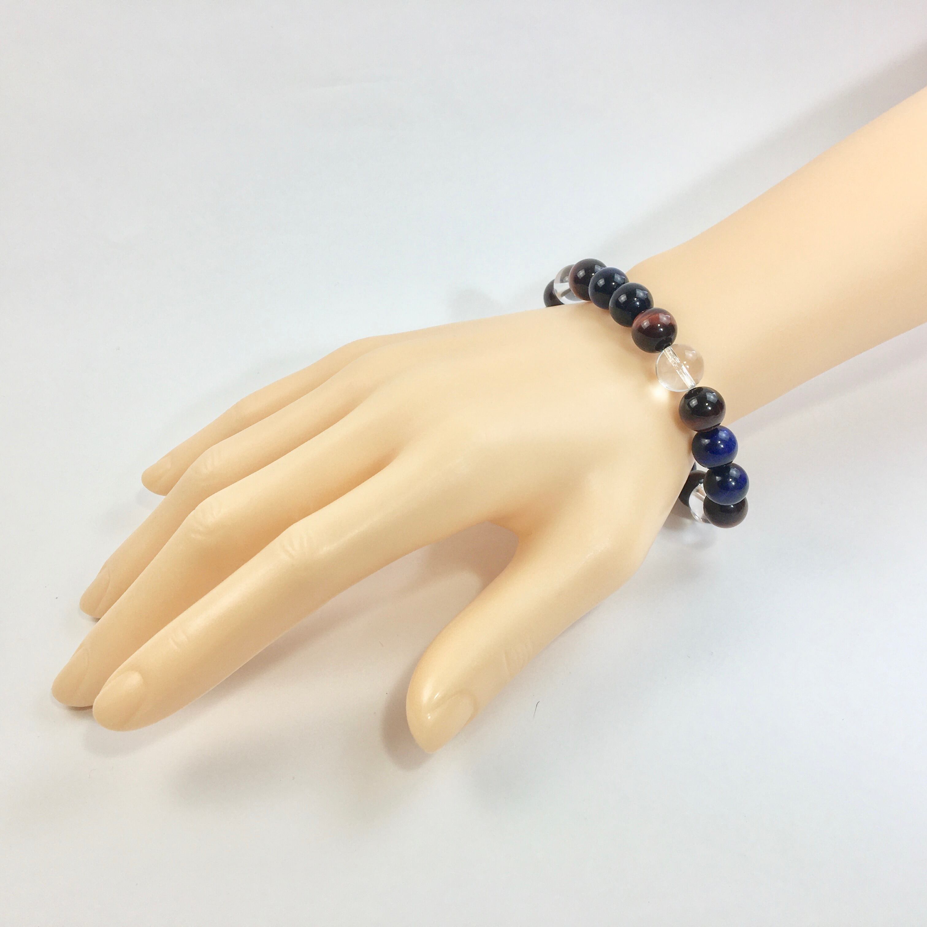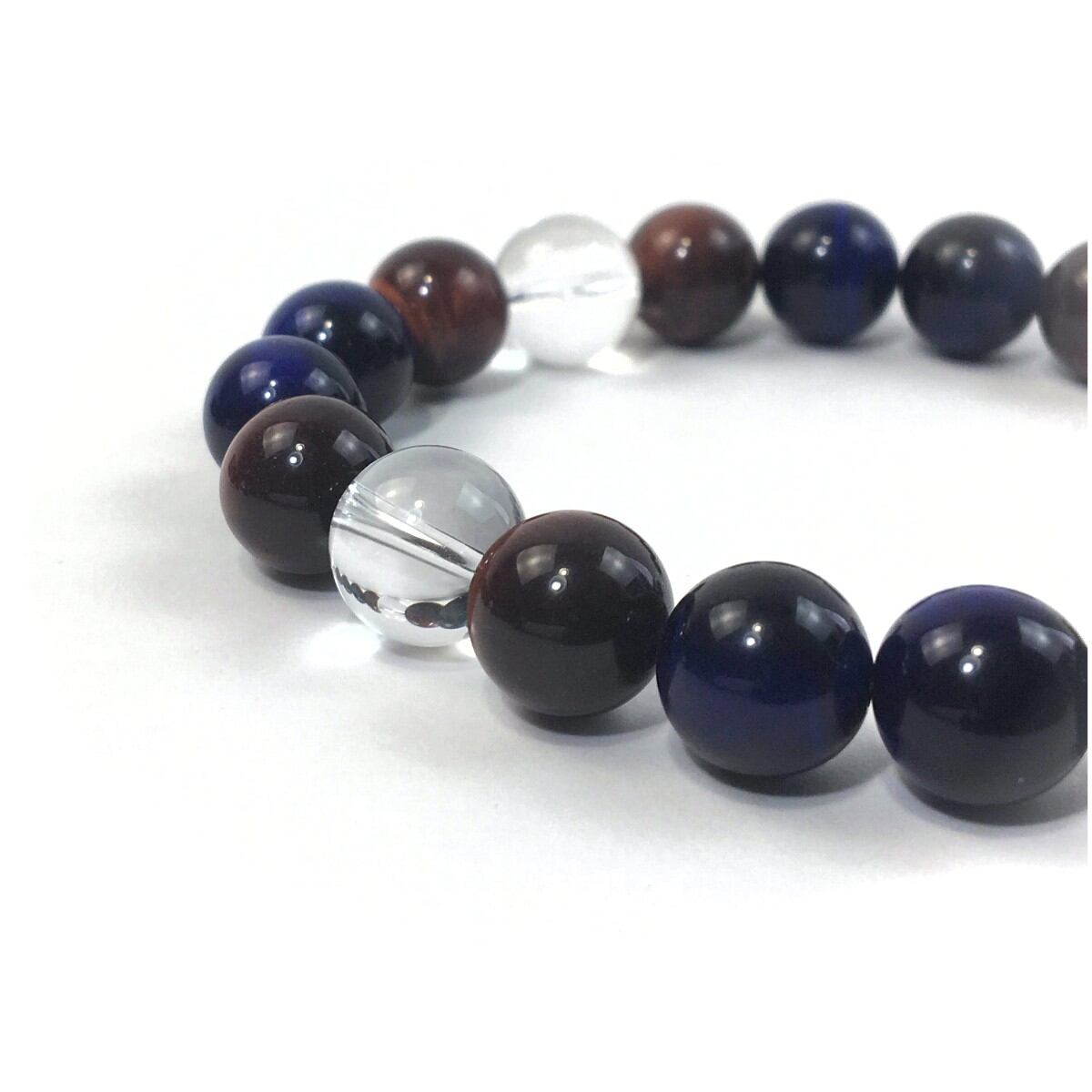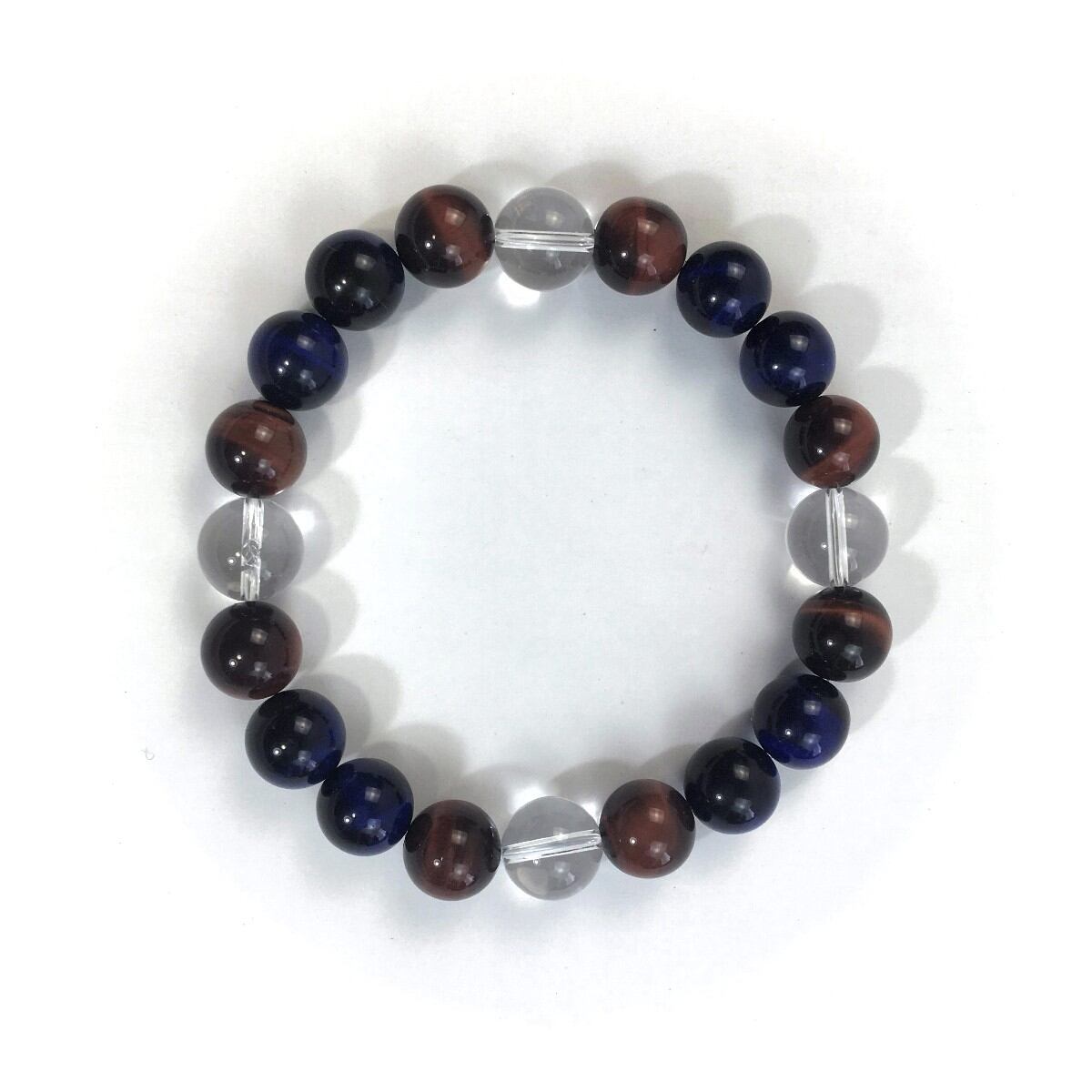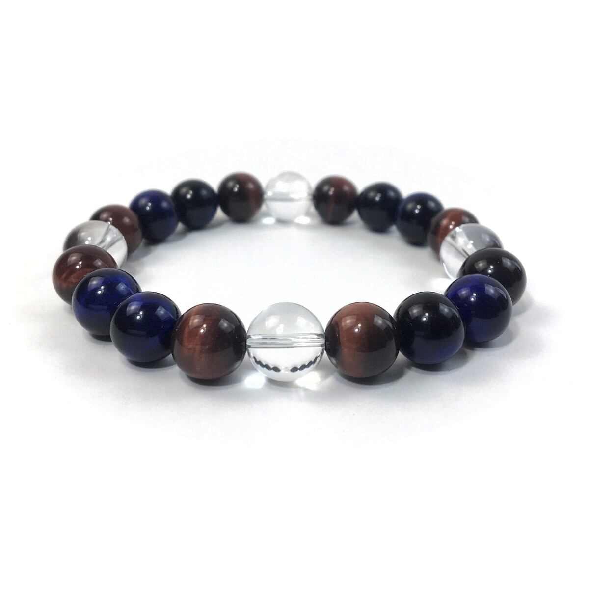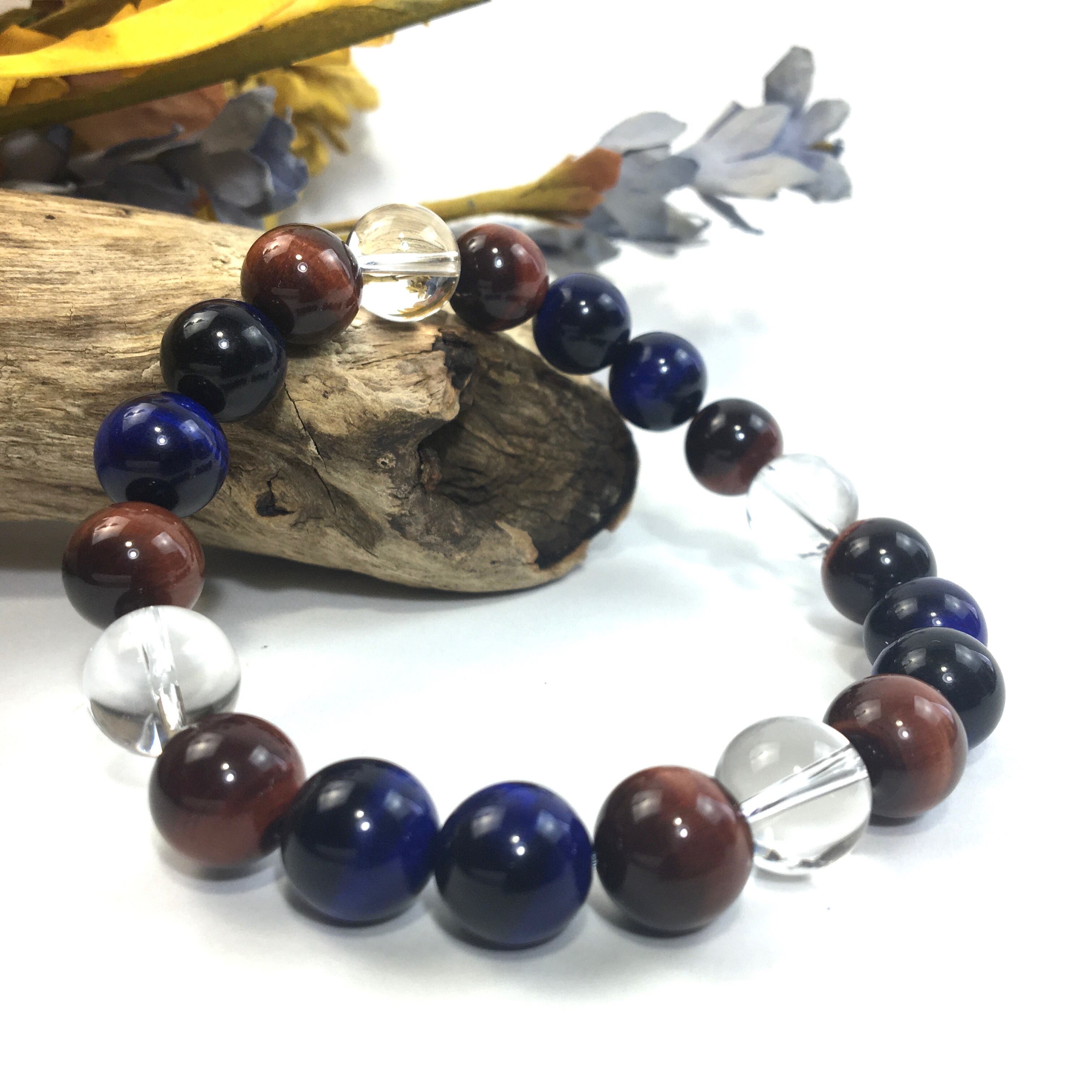 こちらは、水晶とレッドタイガーアイとブルータイガーアイを使用したパワーストーンブレスレットです。今回はパーツは使わずシンプルに石のみでデザインしてあります。パーツを使っていないので金属アレルギーの方などにもオススメできるブレスレットです。石の大きさは全て10mm玉を使用して内径約17cmです。数に限りがございますので気になる方はお早めにどうぞ。
