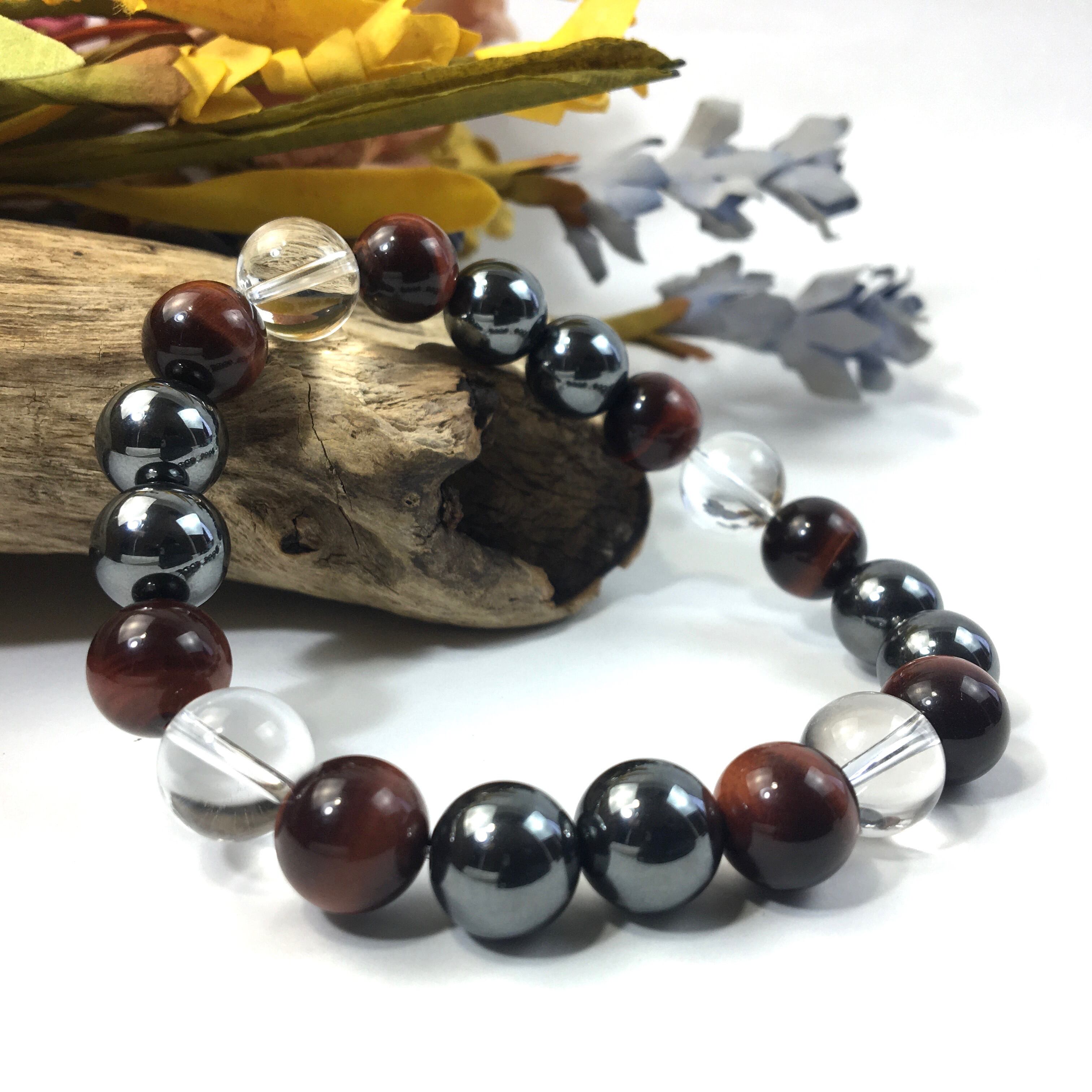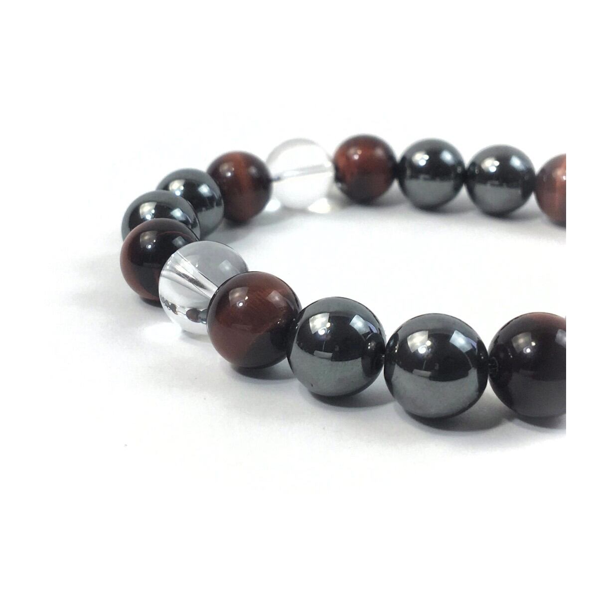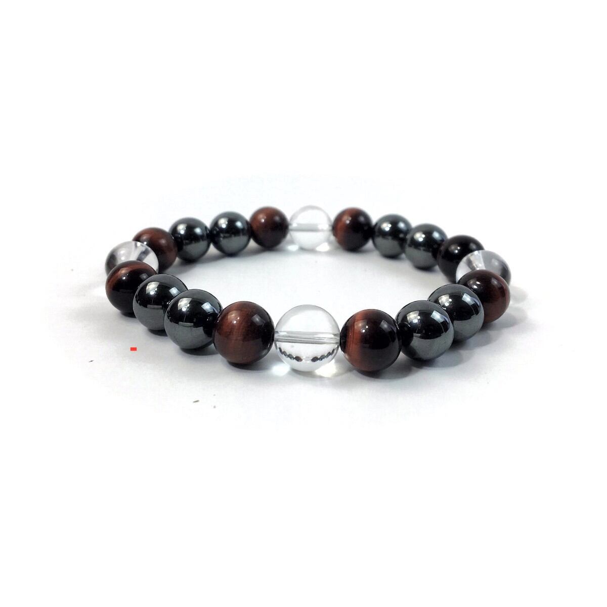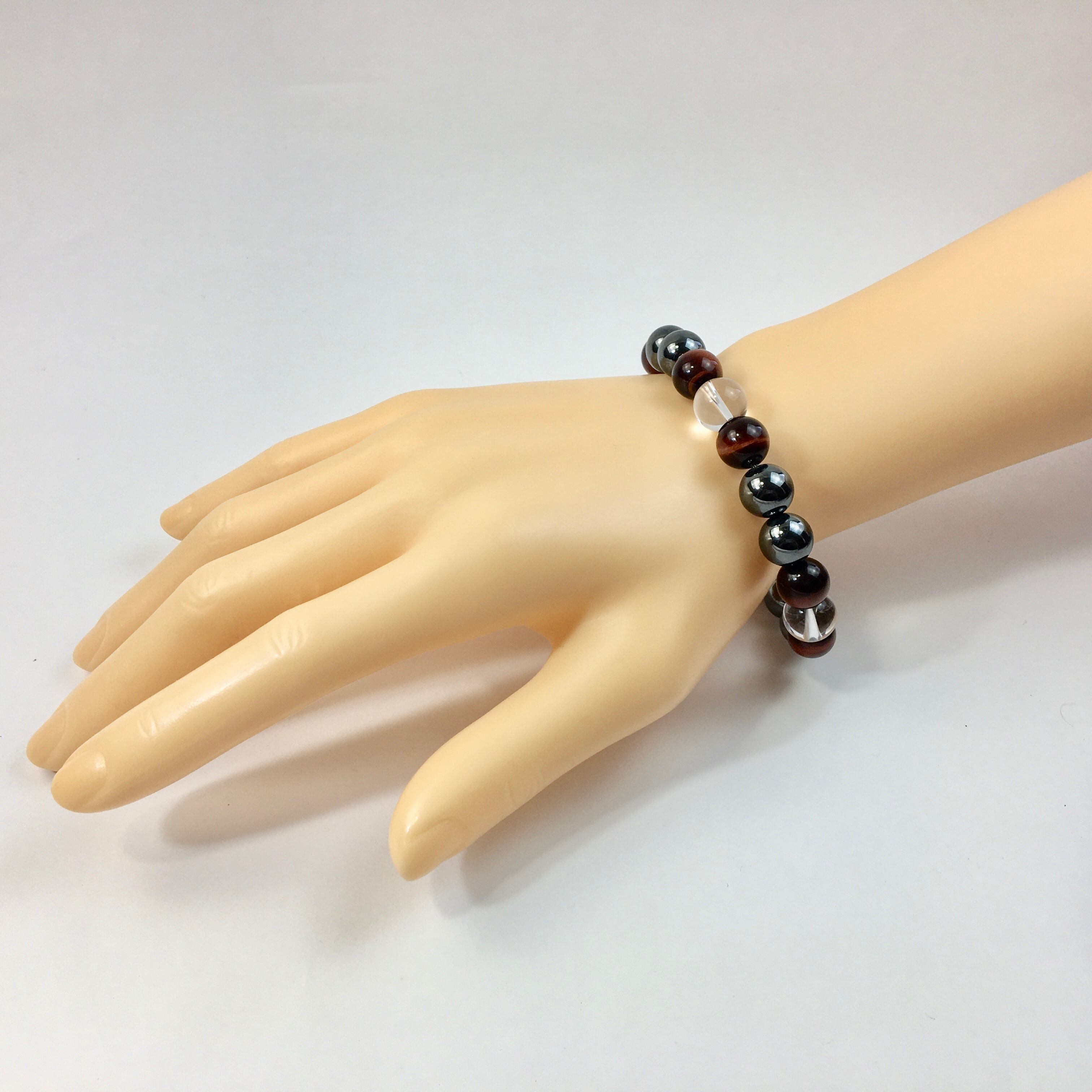 こちらは、水晶とレッドタイガーアイとヘマタイトを使用したパワーストーンブレスレットです。今回はパーツは使わずシンプルに石のみでデザインしてあります。パーツを使っていないので金属アレルギーの方などにもオススメできるブレスレットです。石の大きさは全て10mm玉を使用して内径約17cmです。数に限りがございますので気になる方はお早めにどうぞ。